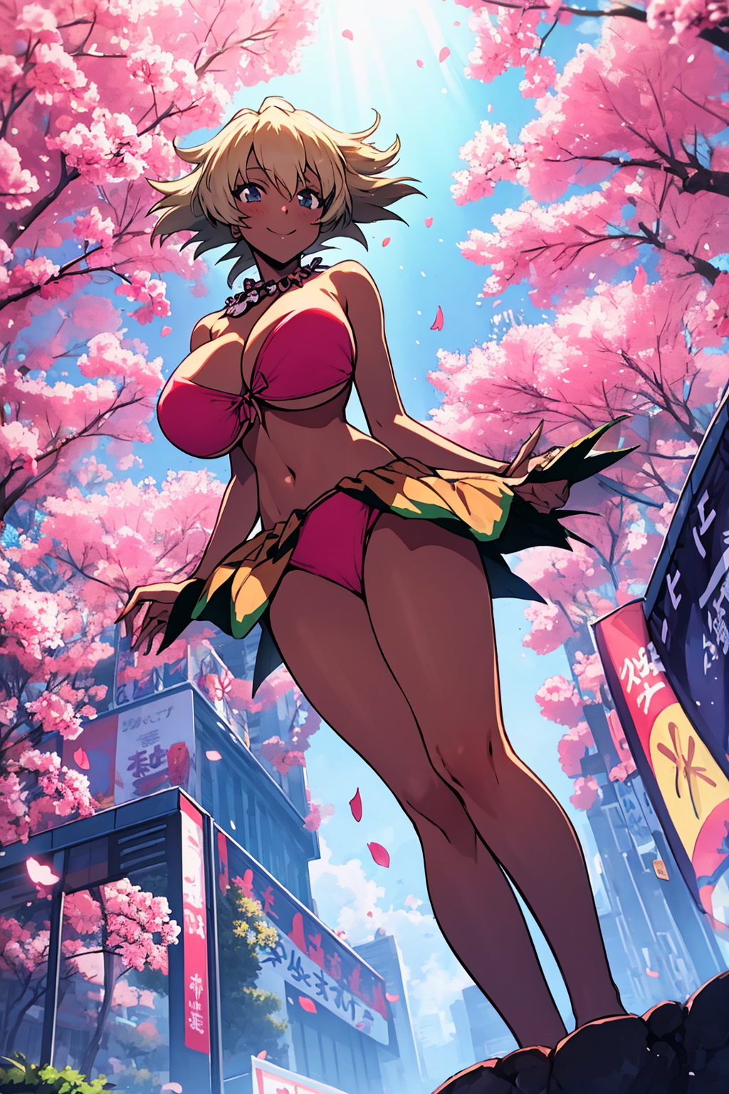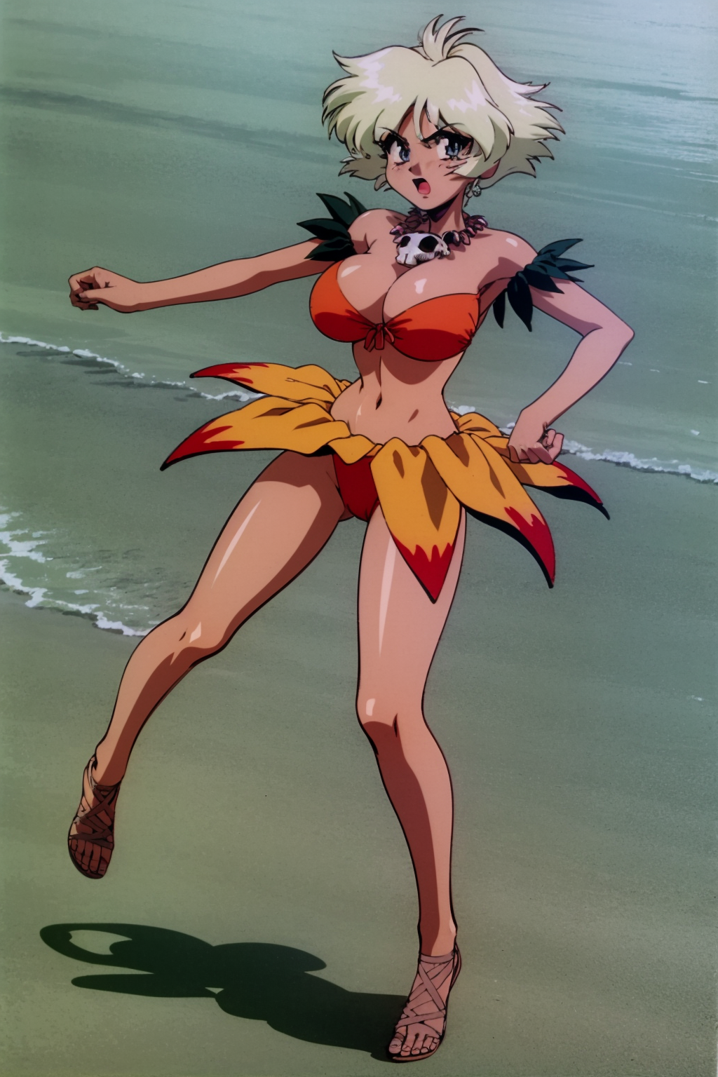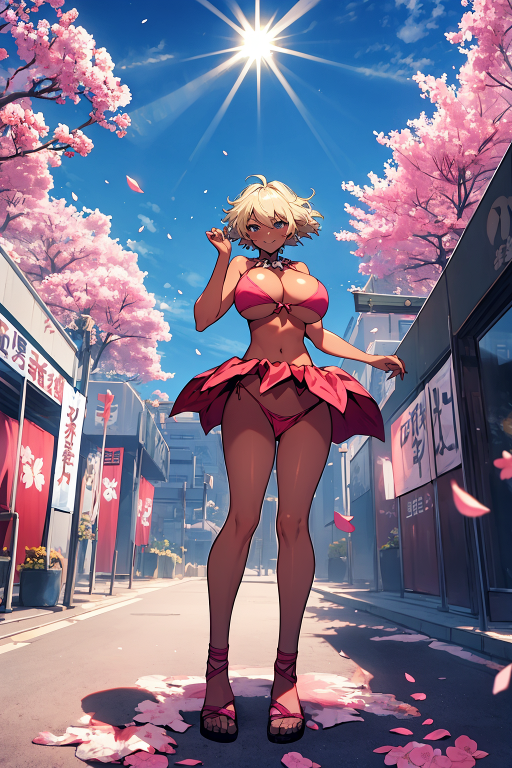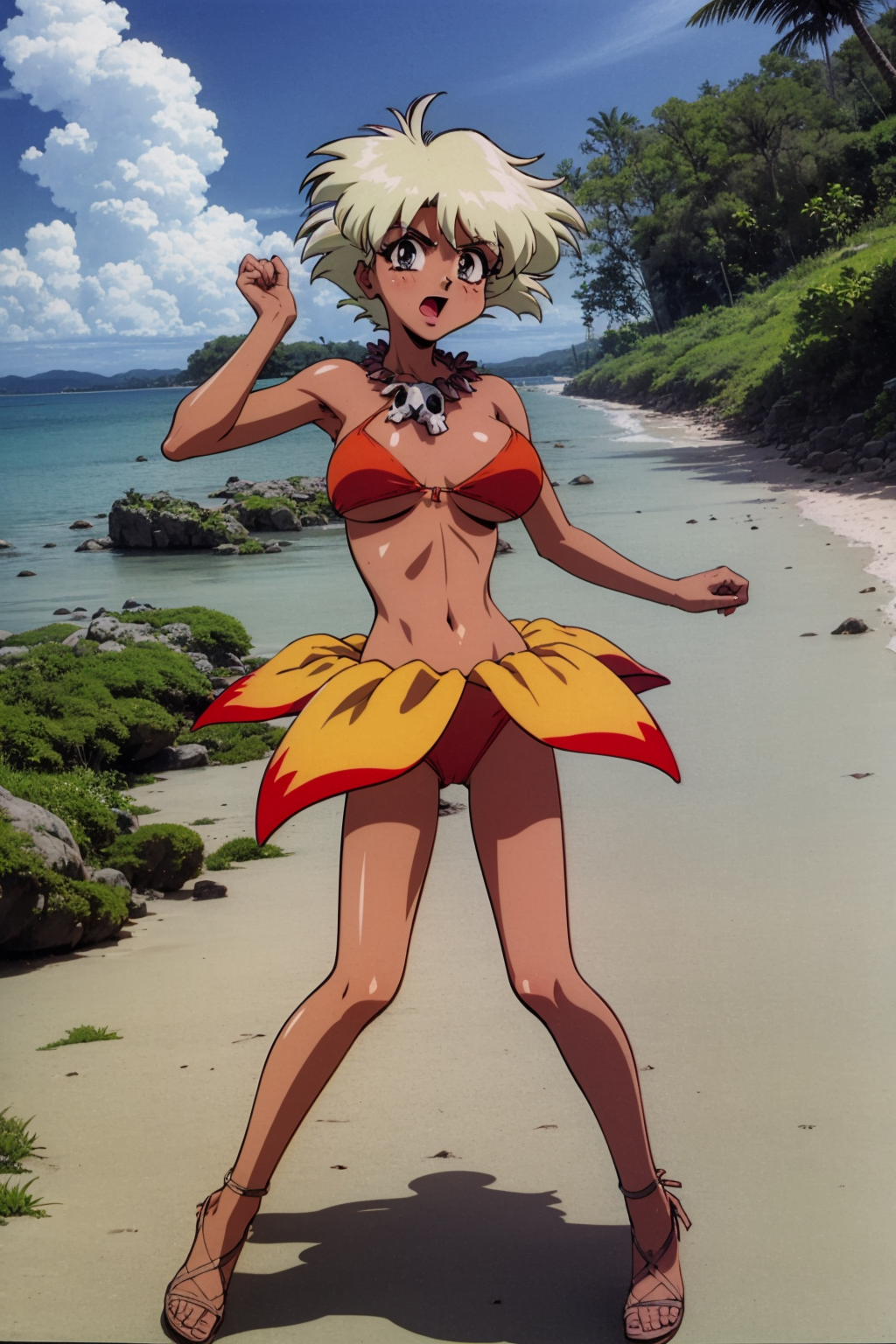 Other prompts : 1girl, blonde hair, short hair, blue eyes, earrings, necklace, dark skin, bikini, swimsuit, navel, cleavage
