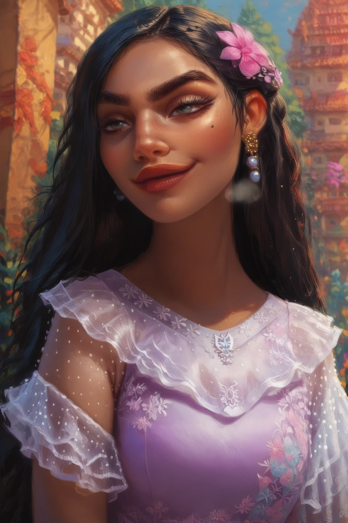 also: (pink) dress, flower on head, sandals, mole below eye. I recommend "dark skinned girl" sometimes