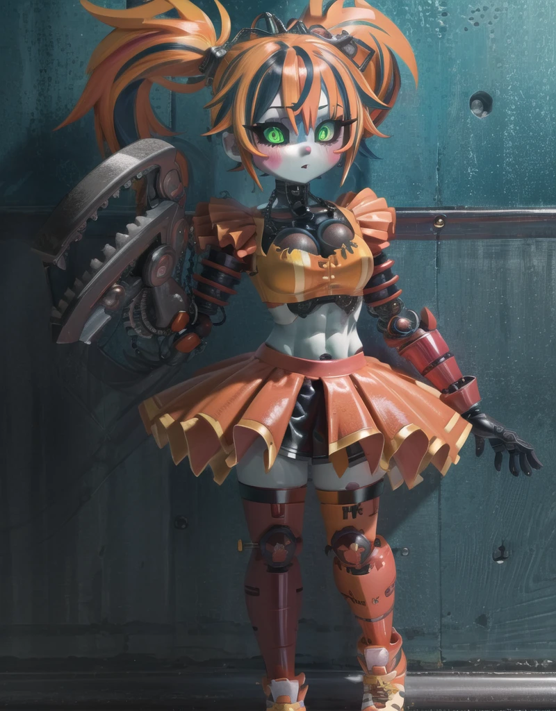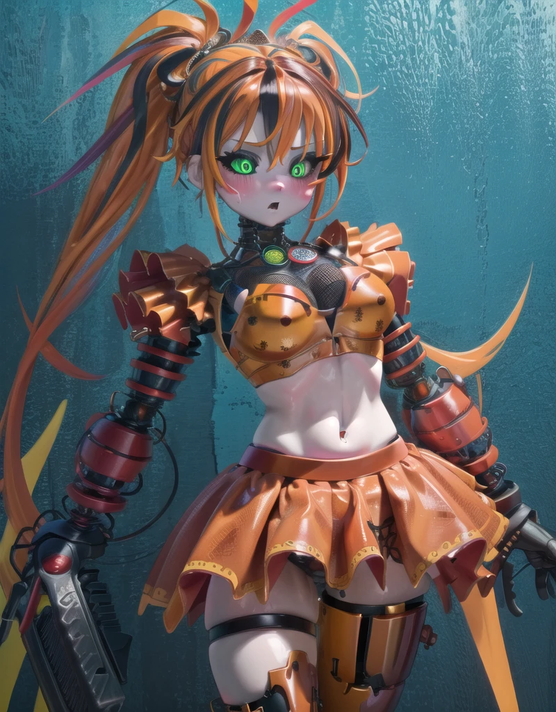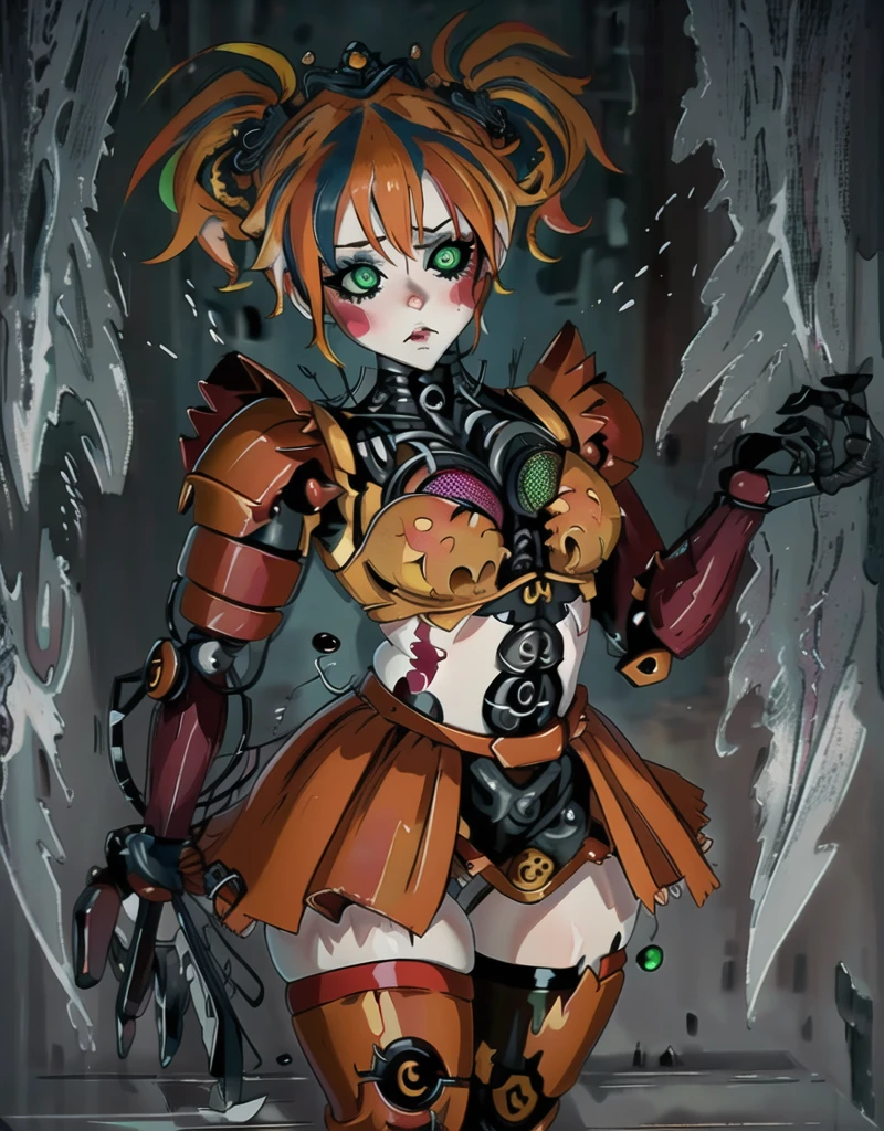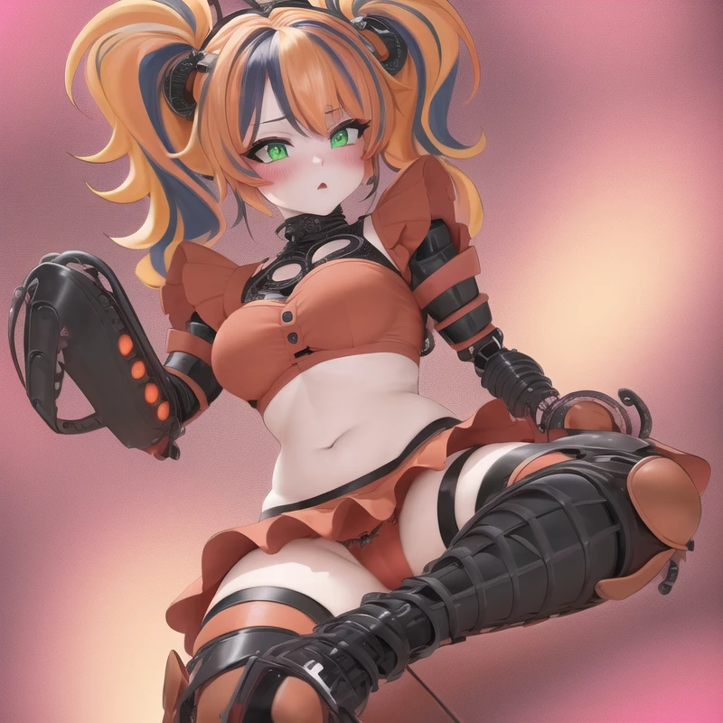 robot, thigh highs, 1girl, solo, solo focus, scrap baby, pig tails, twin tails, skirt, mid drif, crop top, sleeveless, green eyes,