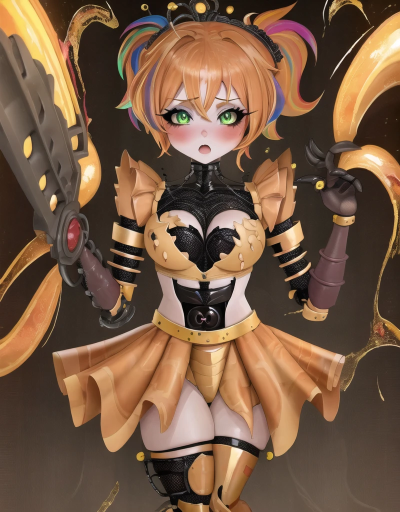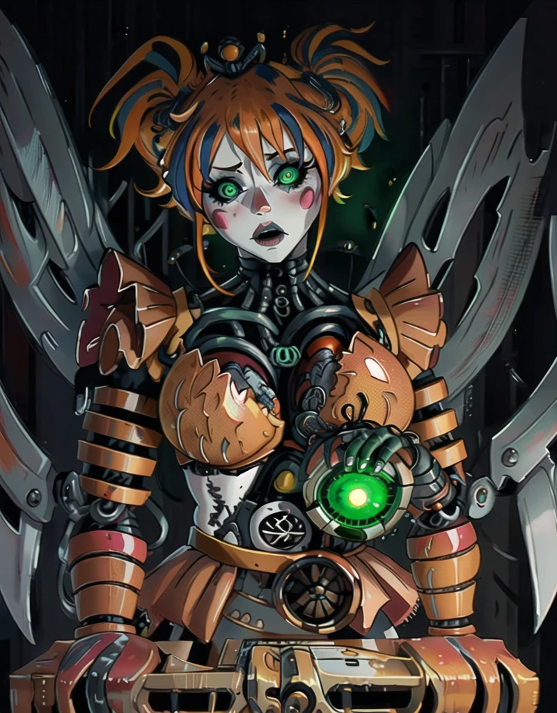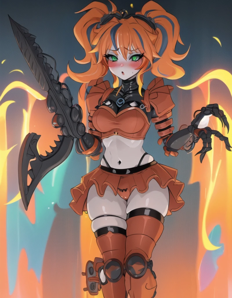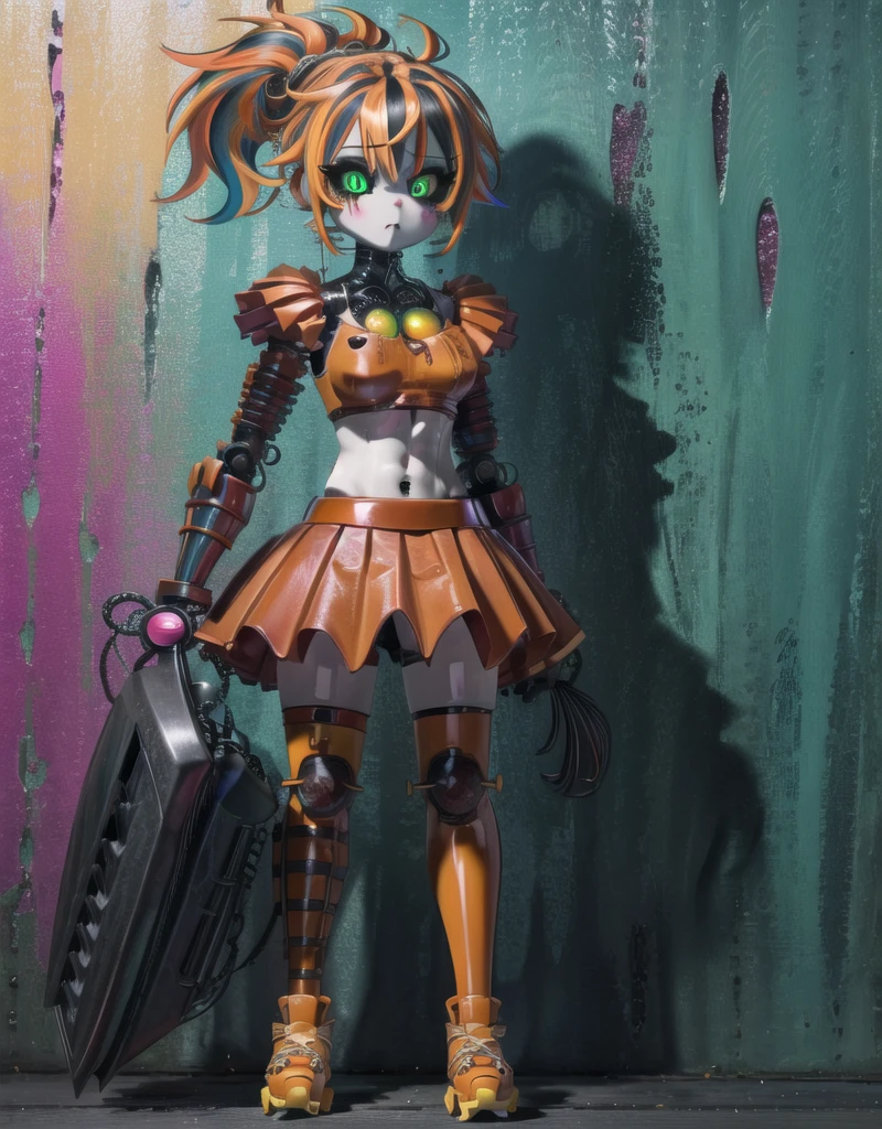 robot, thigh highs, 1girl, solo, solo focus, scrap baby, pig tails, twin tails, skirt, mid drif, crop top, sleeveless, green eyes,