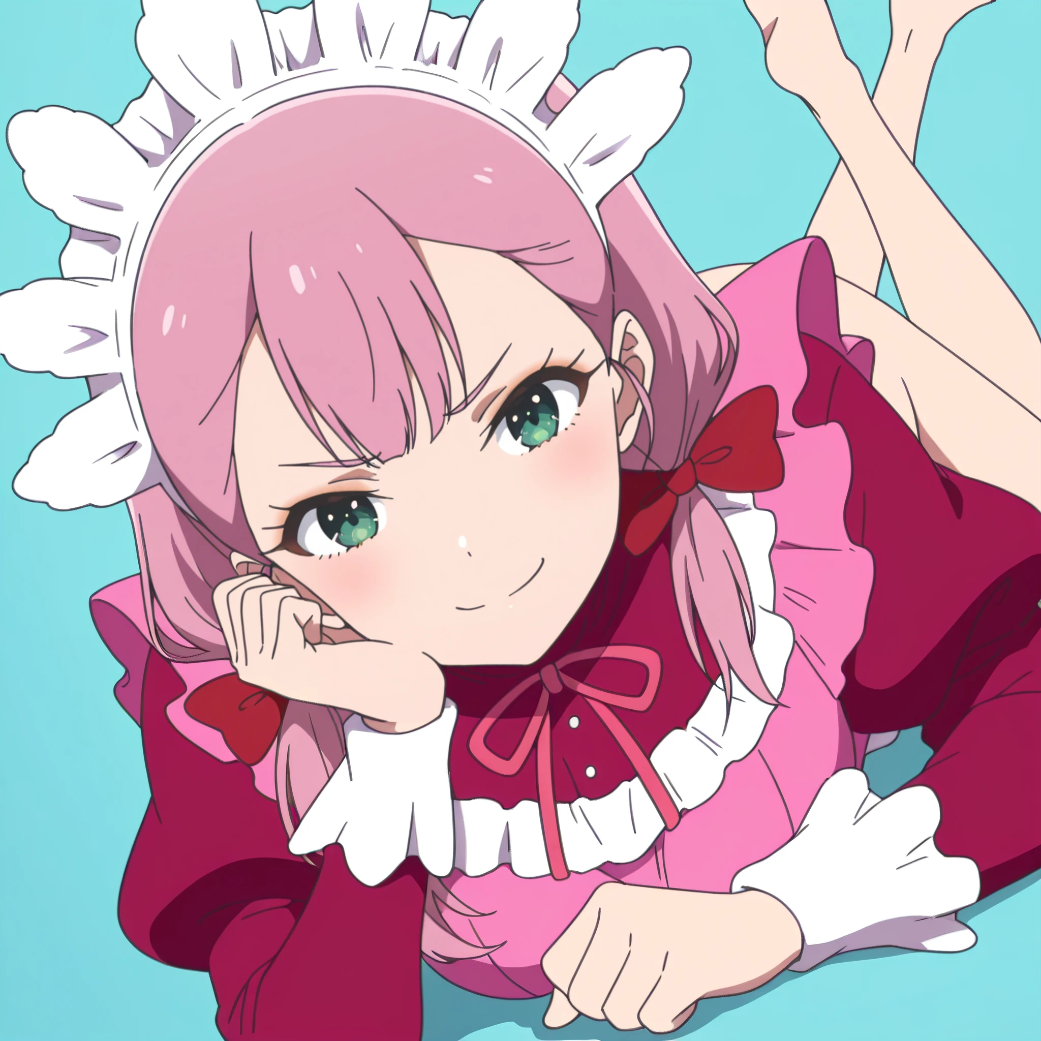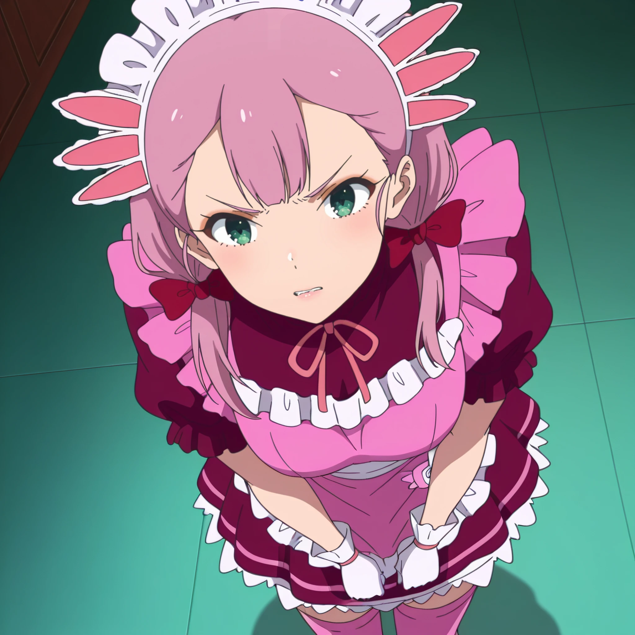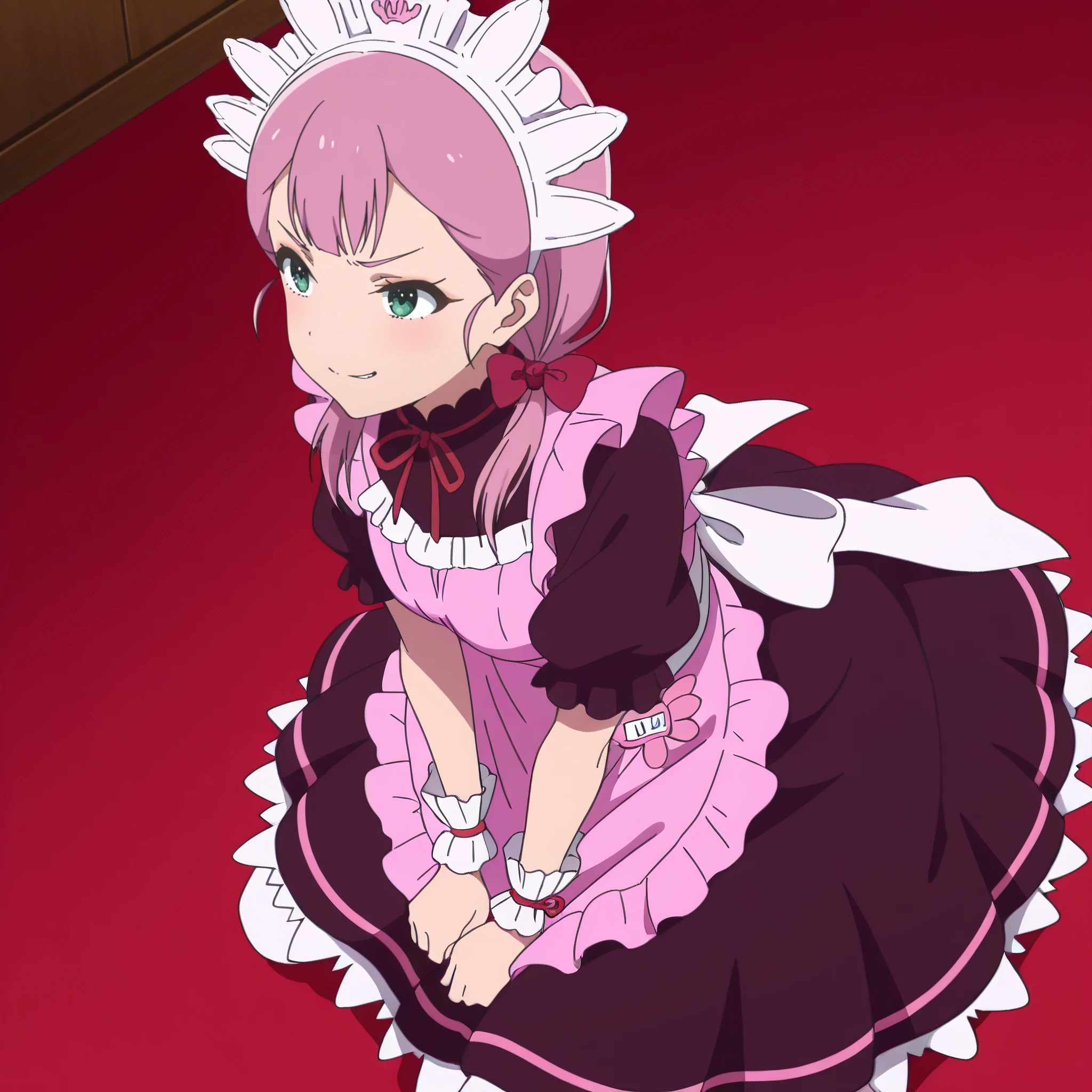 AMWWuvWuvMaid, pink hair, bangs, green eyes, long hair, eyebrows visible through hair, ribbon, bow, red ribbon, short hair, twintails, hair ribbon, hairband,