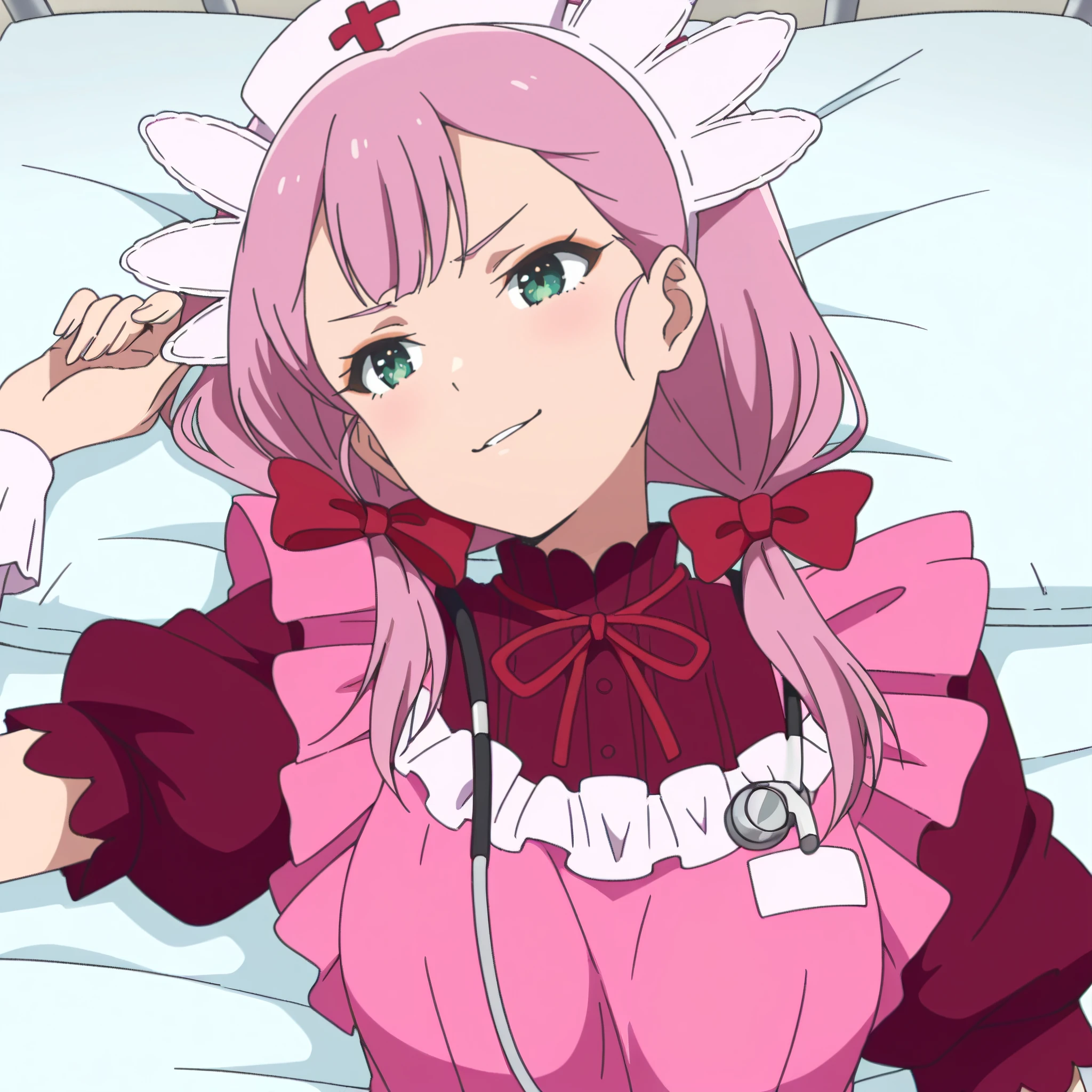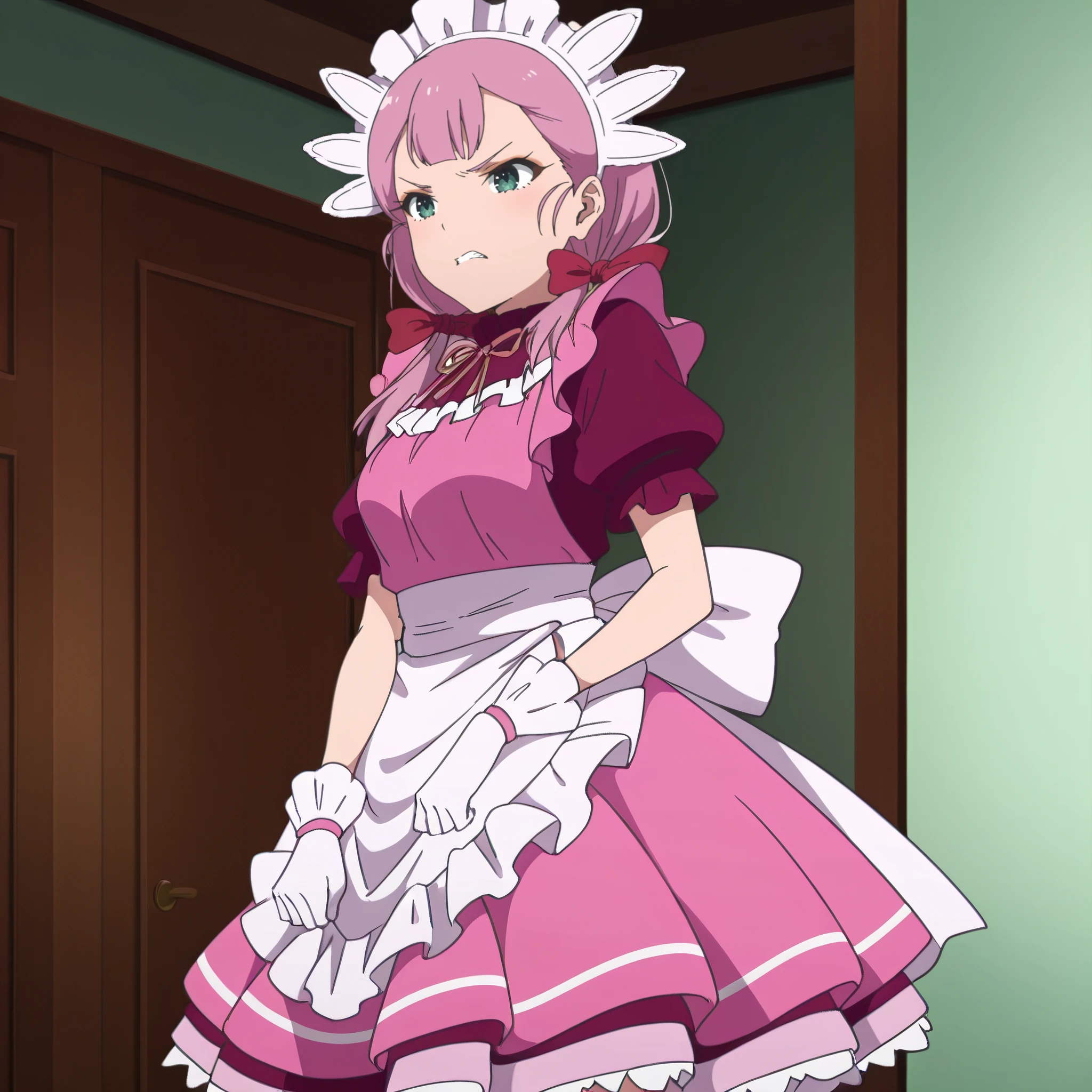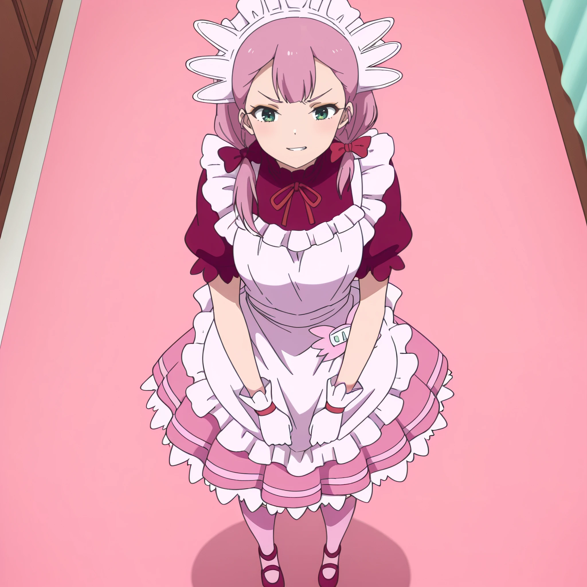 AMWWuvWuvMaid, pink hair, bangs, green eyes, long hair, eyebrows visible through hair, ribbon, bow, red ribbon, short hair, twintails, hair ribbon, hairband,