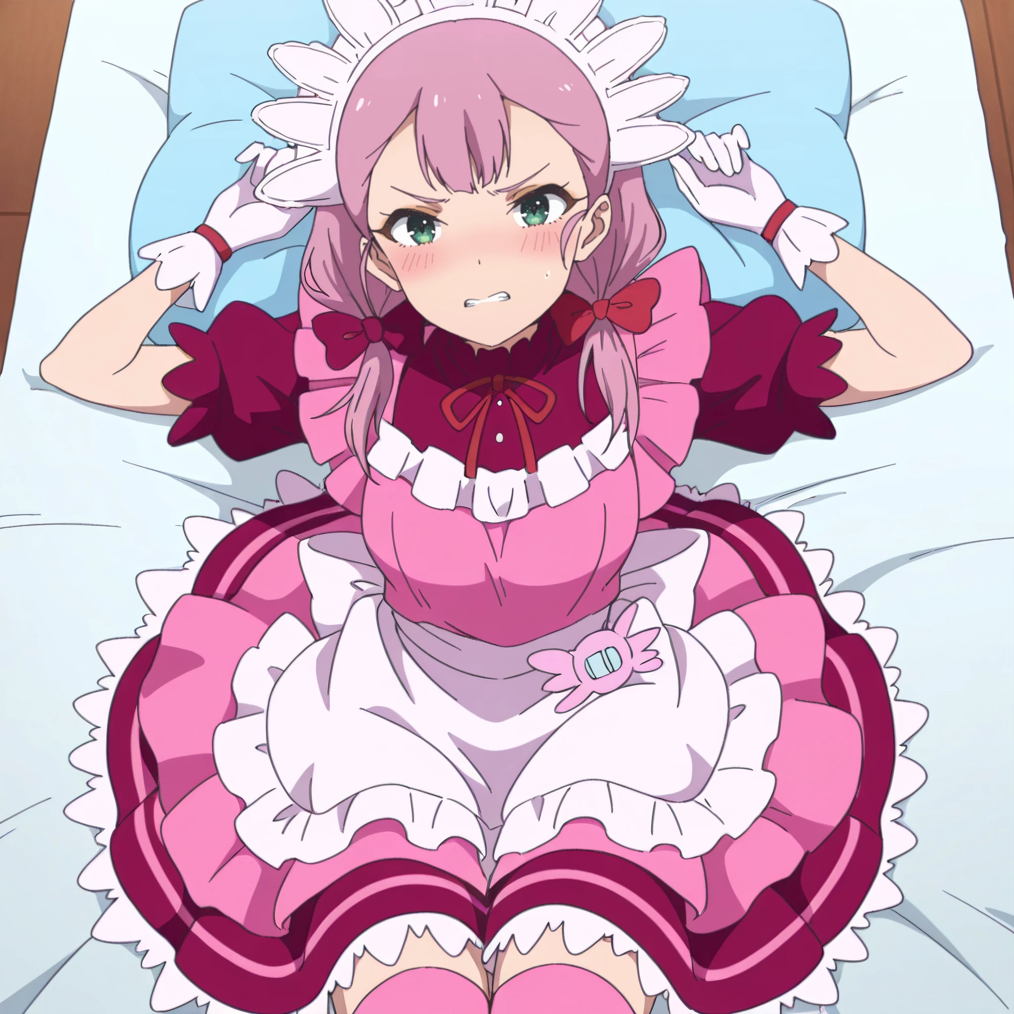 dress, hat, frills, apron, maid headdress, gloves, maid, pink dress, maid apron, pink thighhighs,