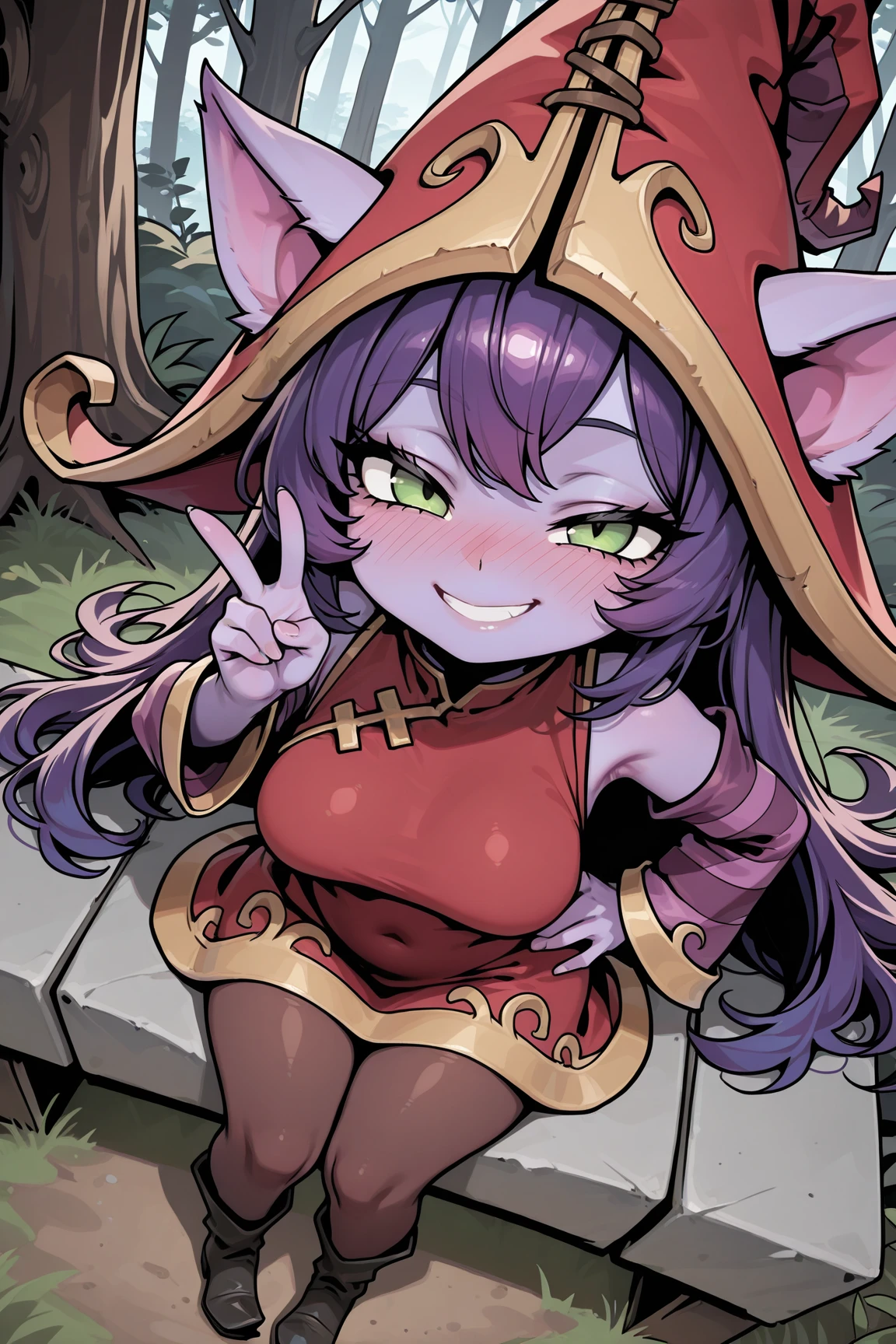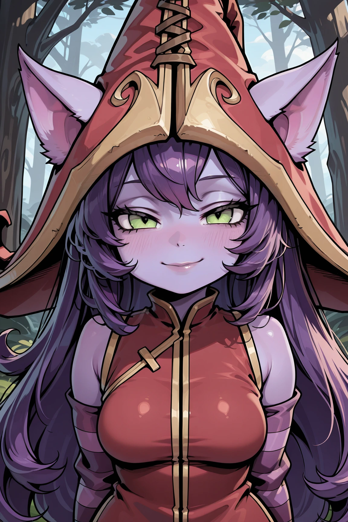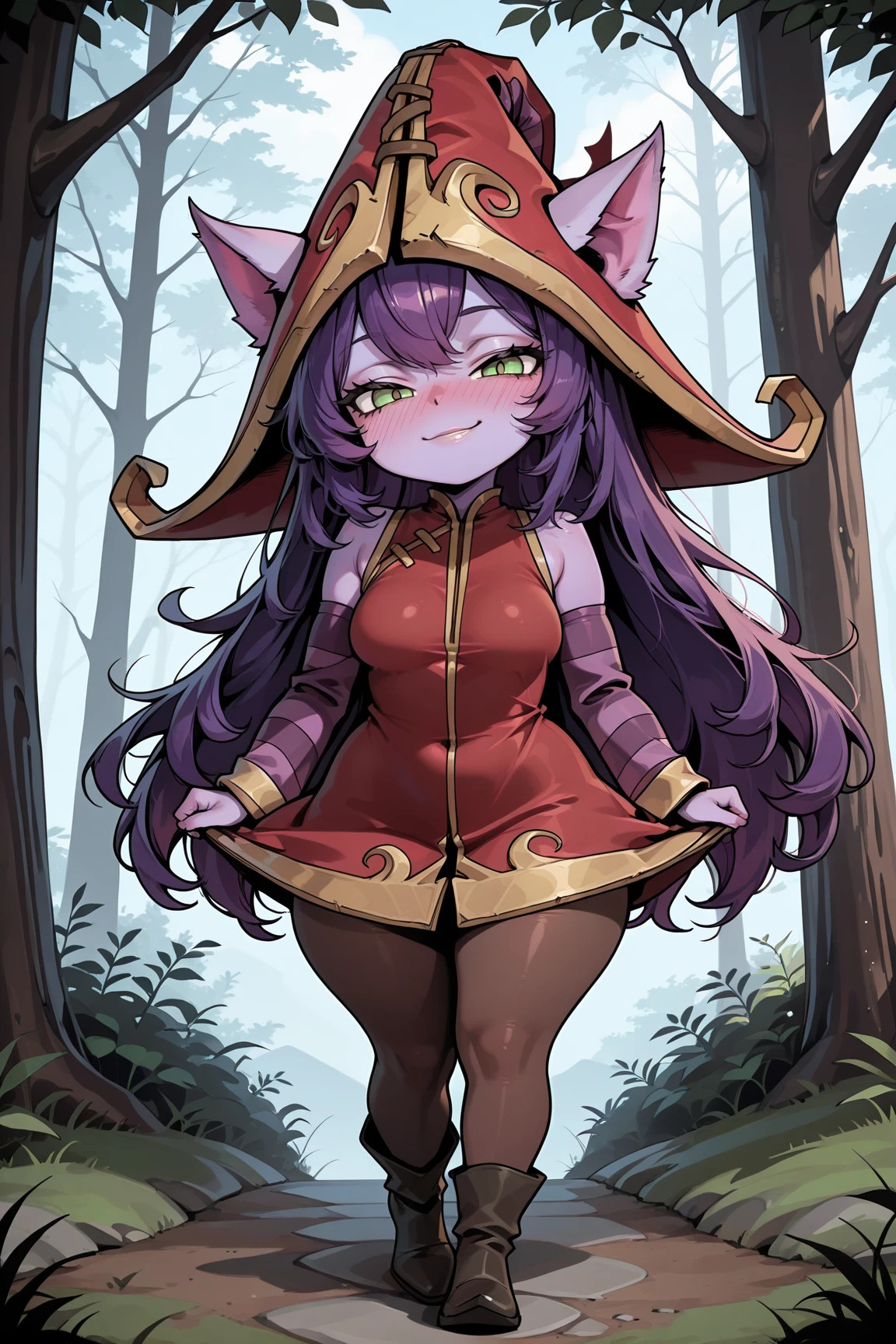 ➜ LuluLOLILXL, yordle, shortstack, purple skin, colored skin, green eyes, purple hair, long hair, bangs, animal ears, red witch hat, ears through headwear, medium breasts, red dress, purple striped sleeves, brown pantyhose, black boots]--|======[ 💗 My Settings: 💗 ]======|--[