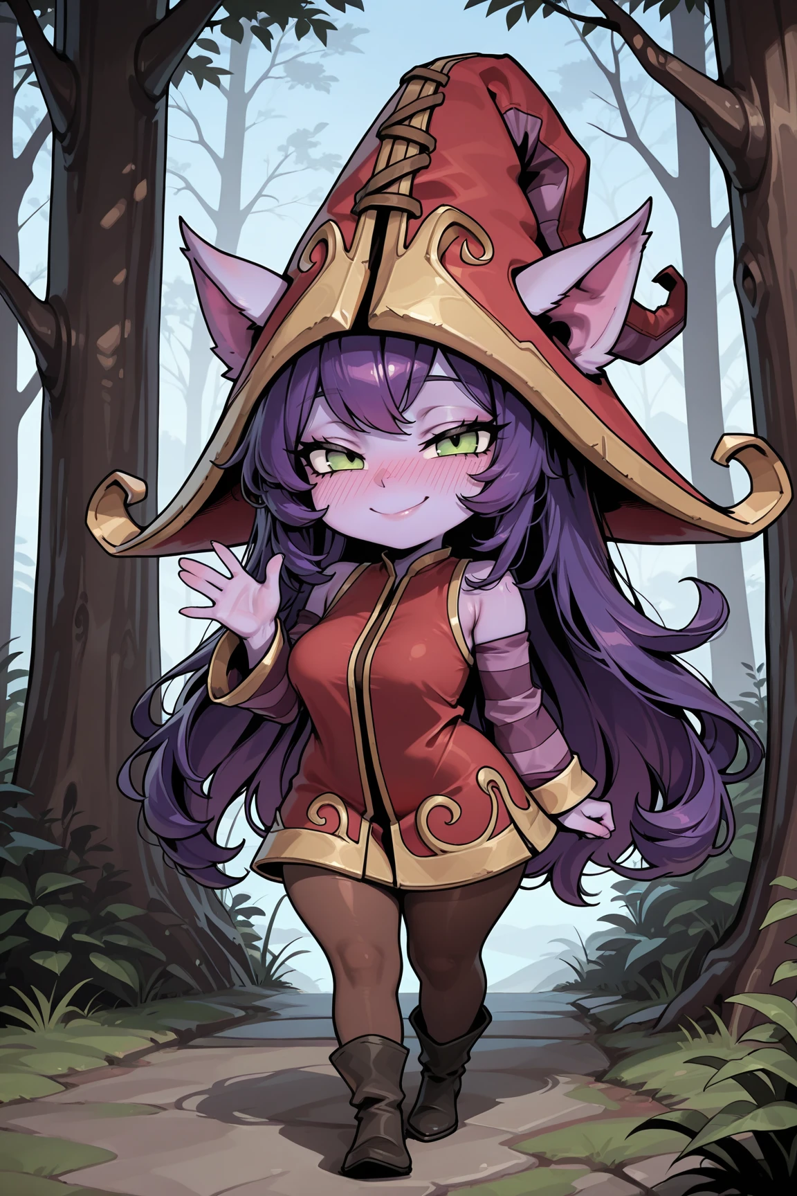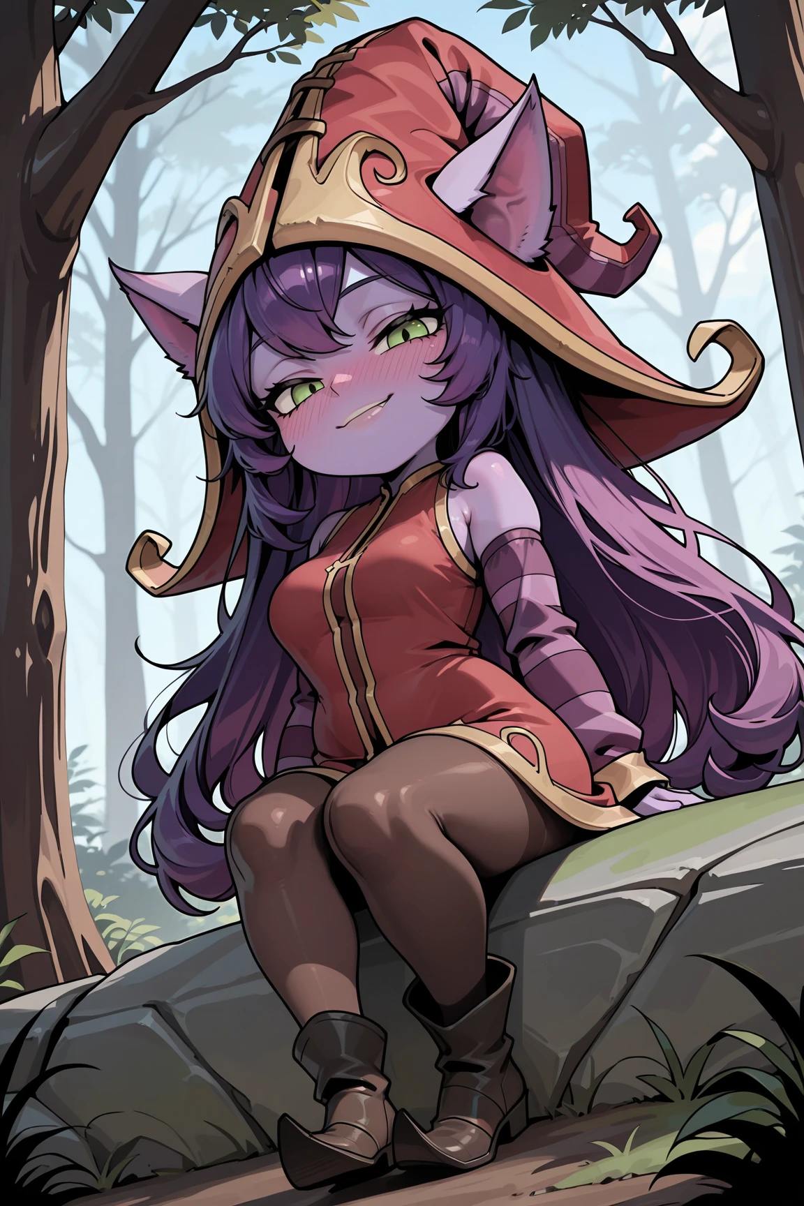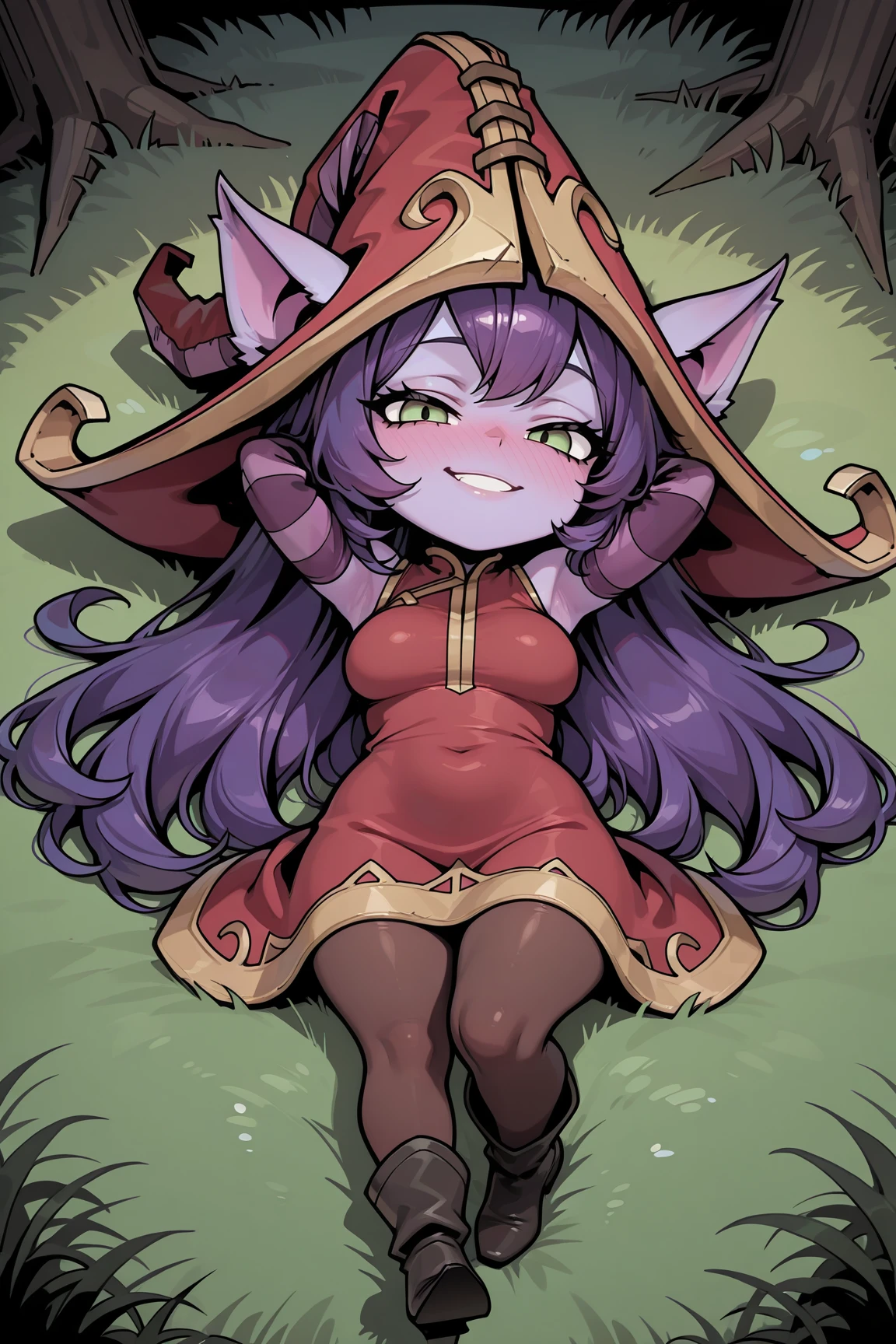 LuluLOLILXL, yordle, shortstack, purple skin, colored skin, green eyes, purple hair, long hair, bangs, animal ears, red witch hat, ears through headwear, medium breasts, red dress, purple striped sleeves, brown pantyhose, black boots