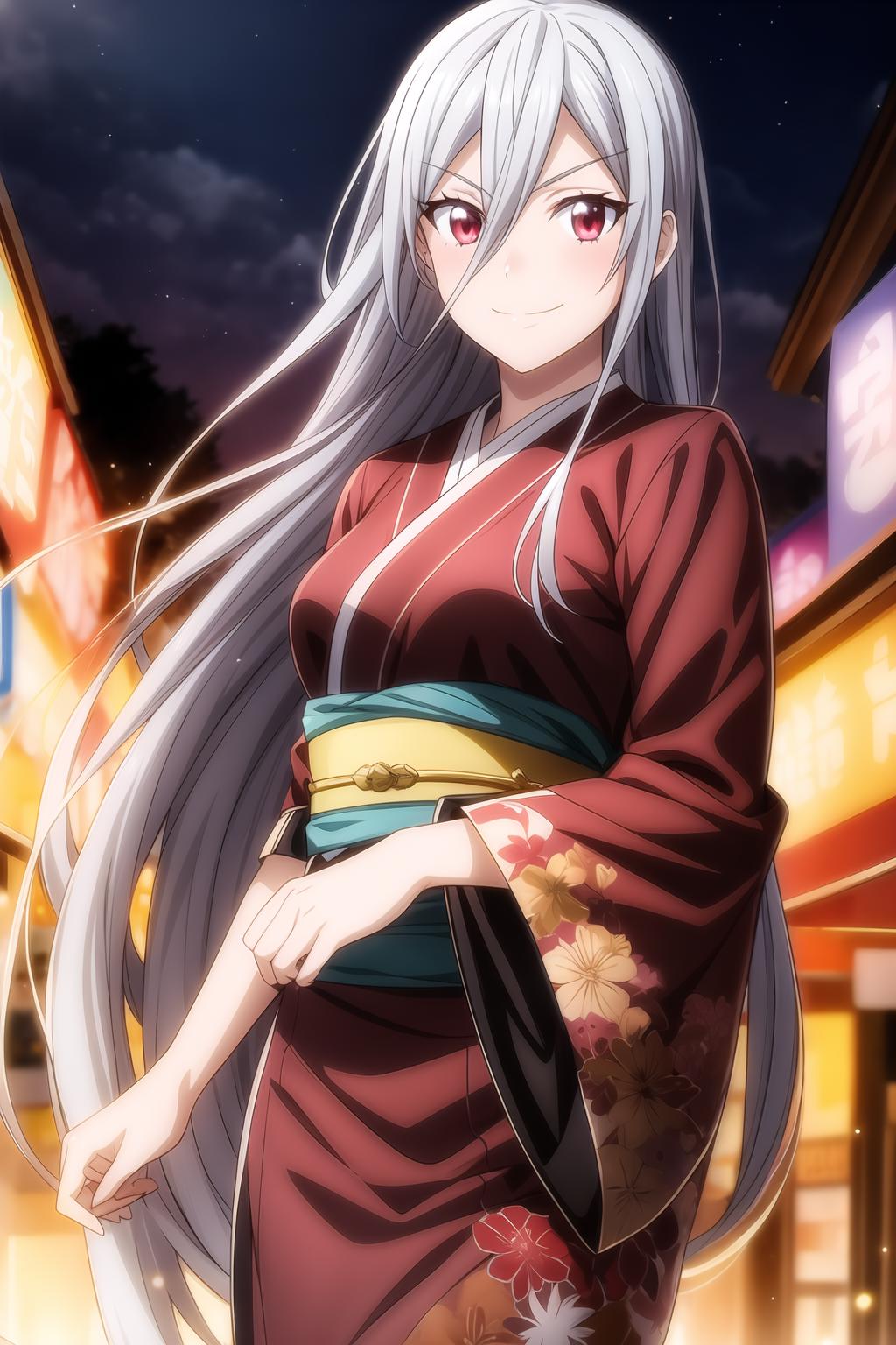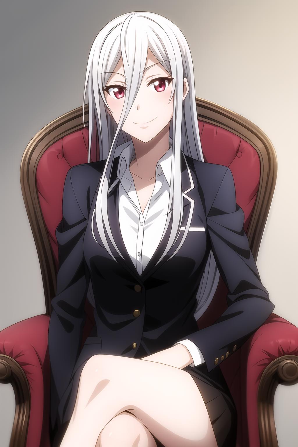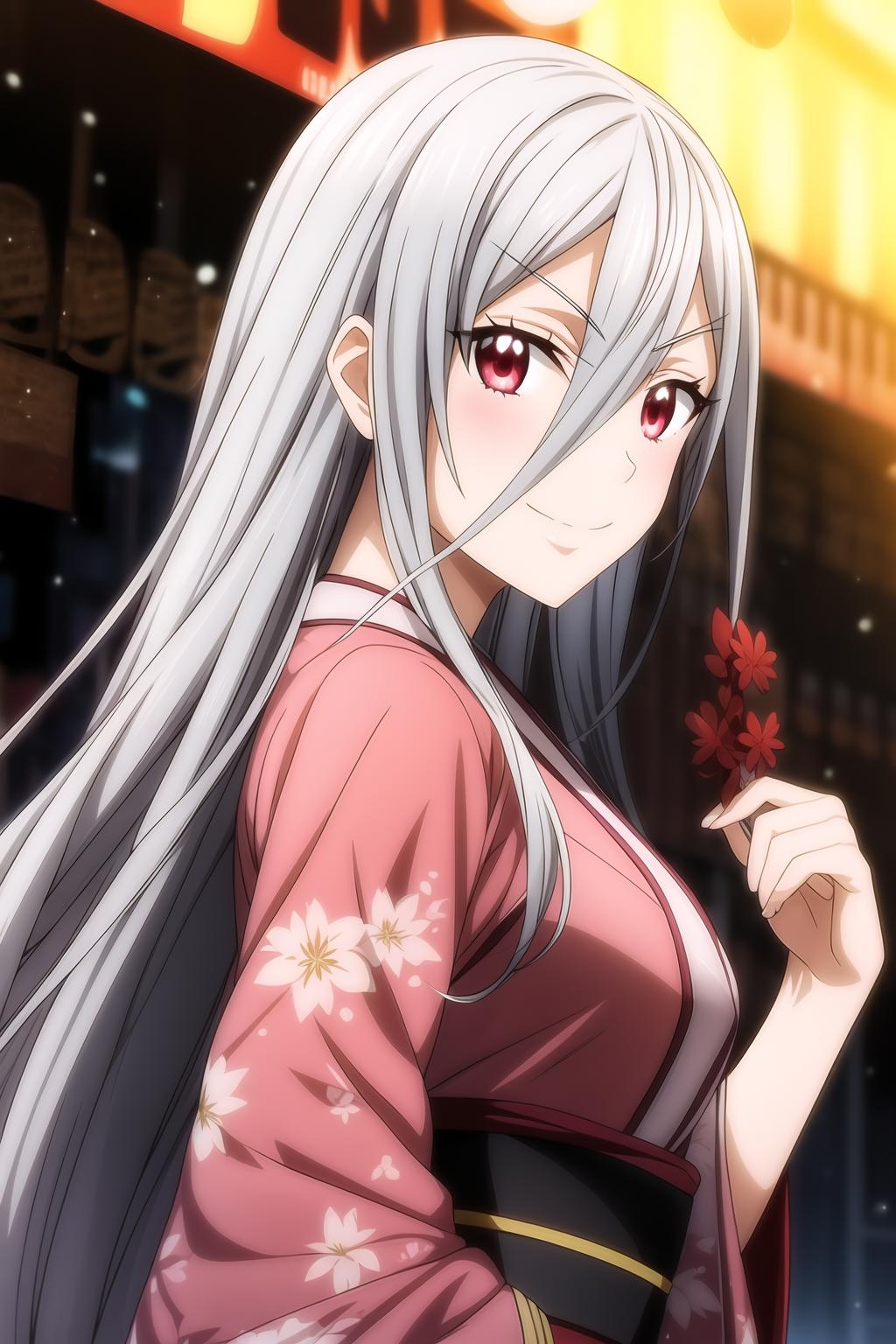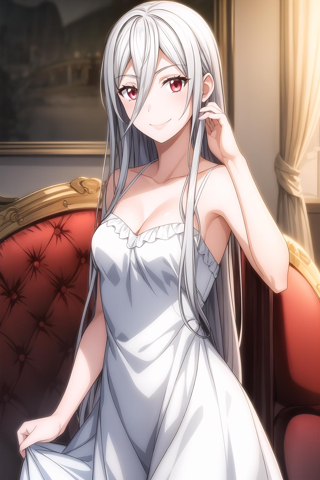 hair between eyes, long hair, red eyes, silver