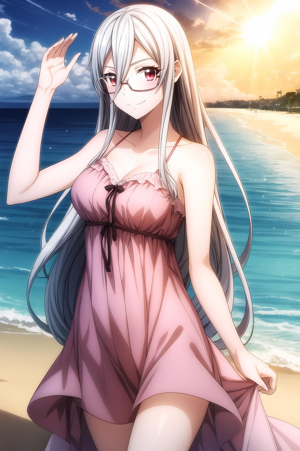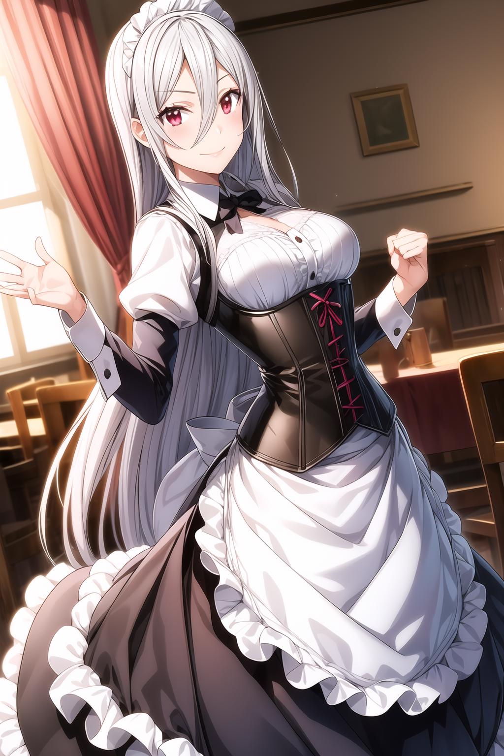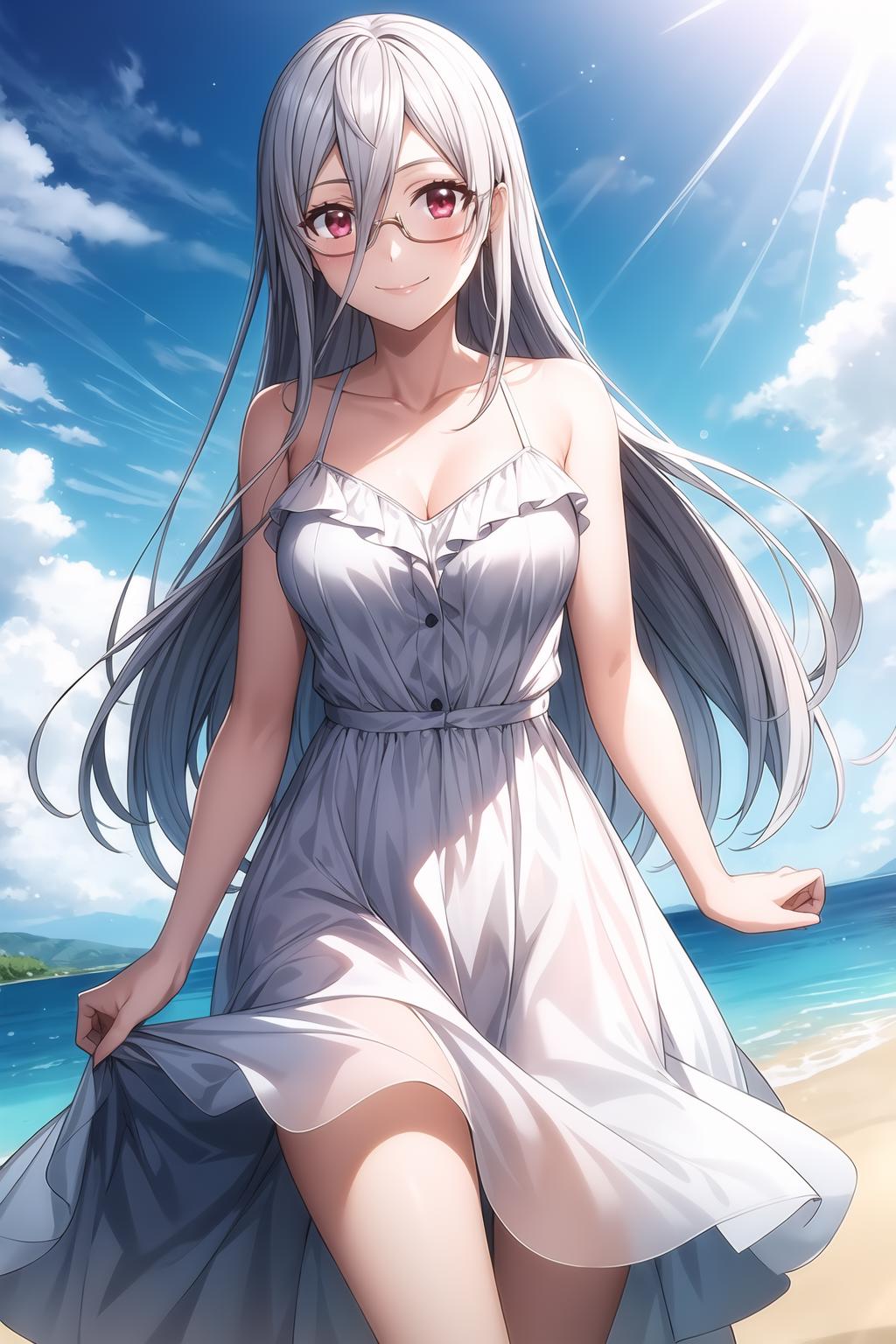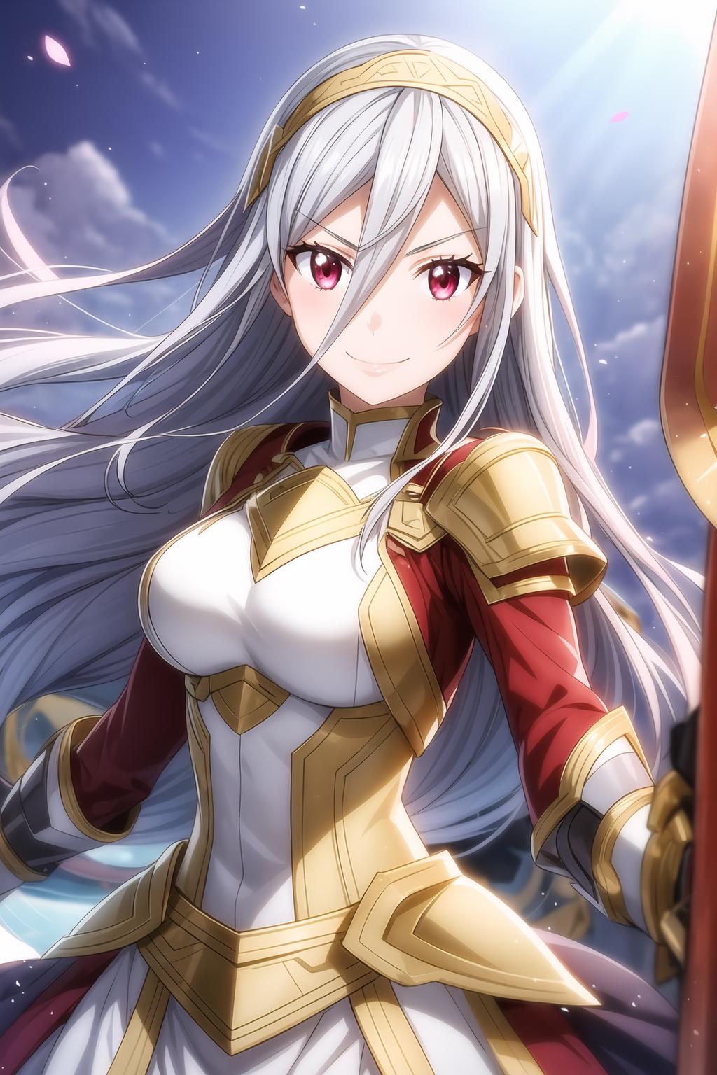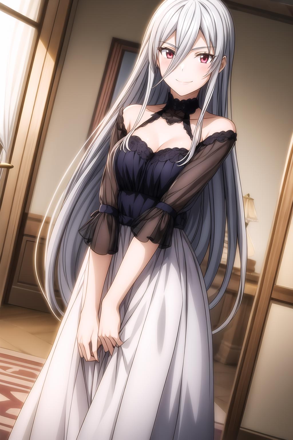 hair between eyes, long hair, red eyes, silver
