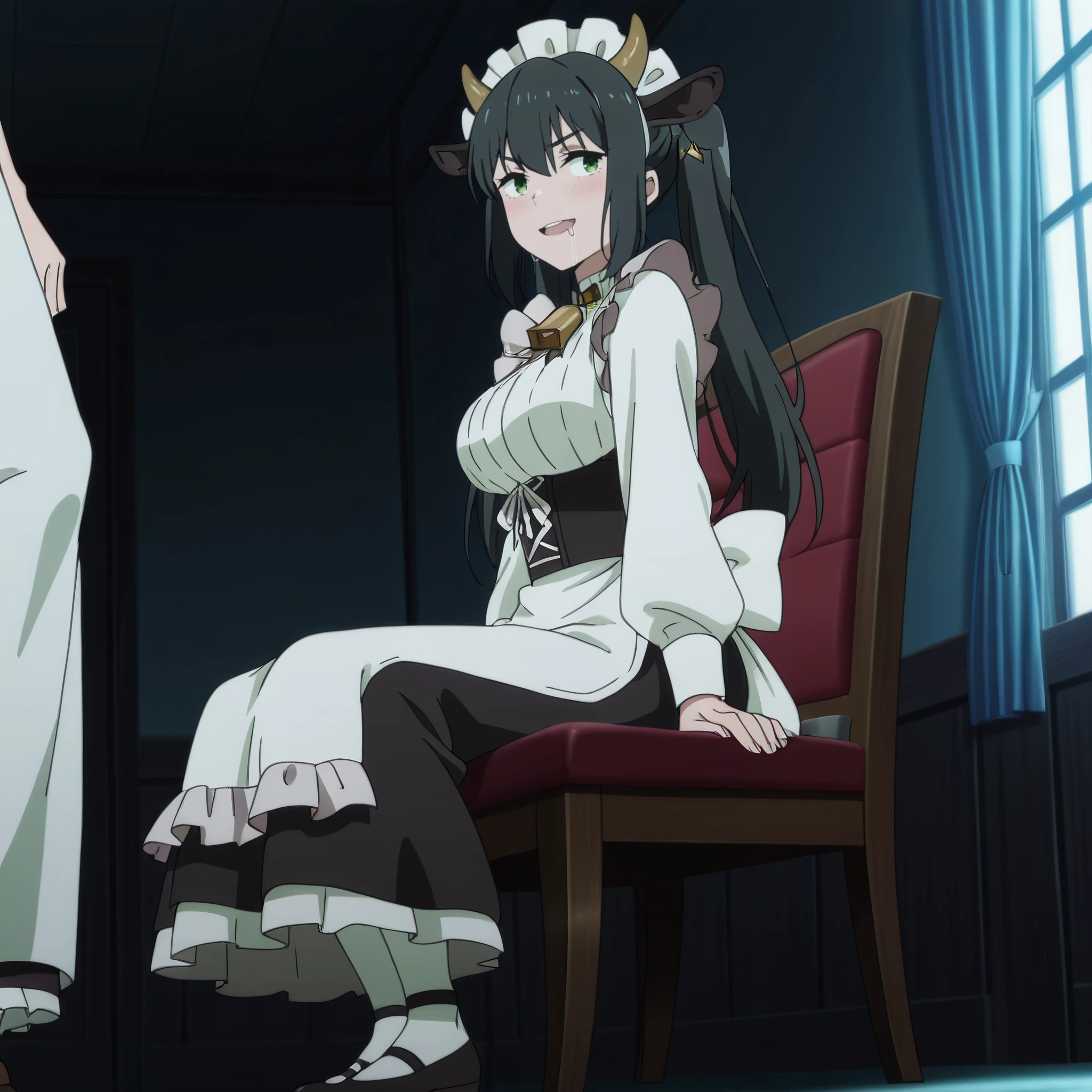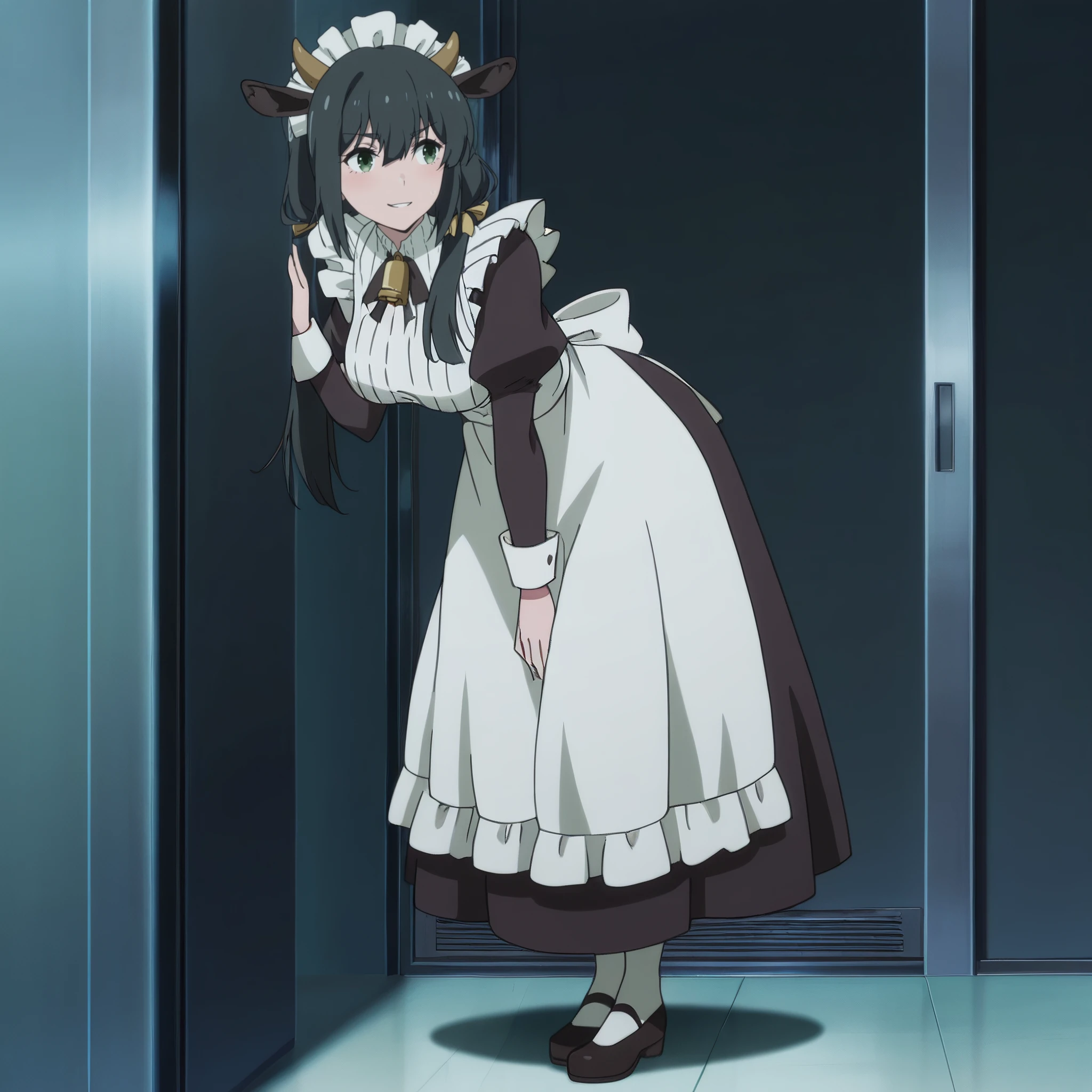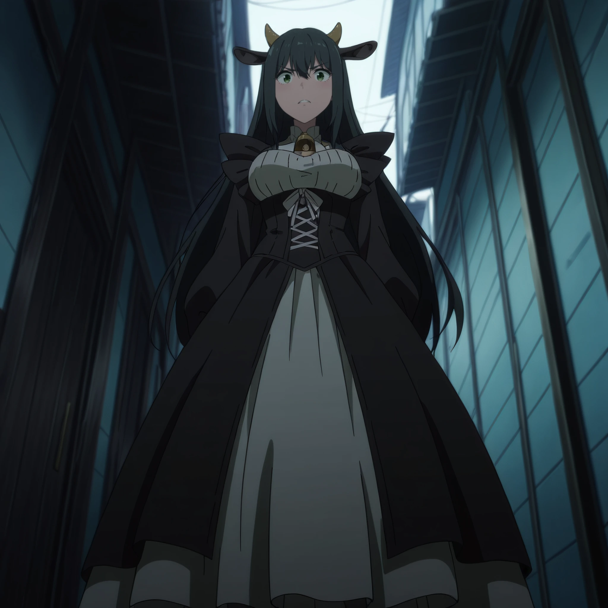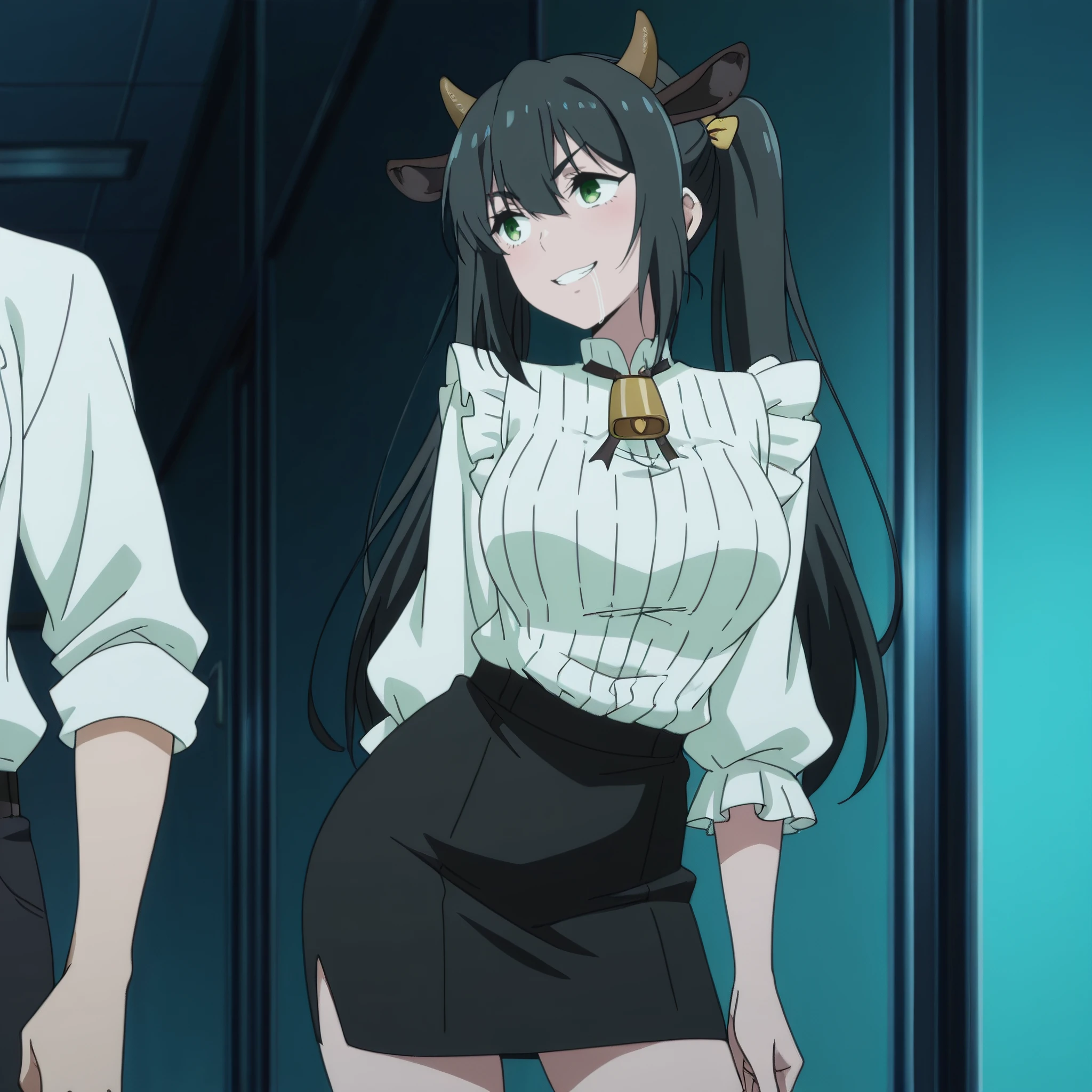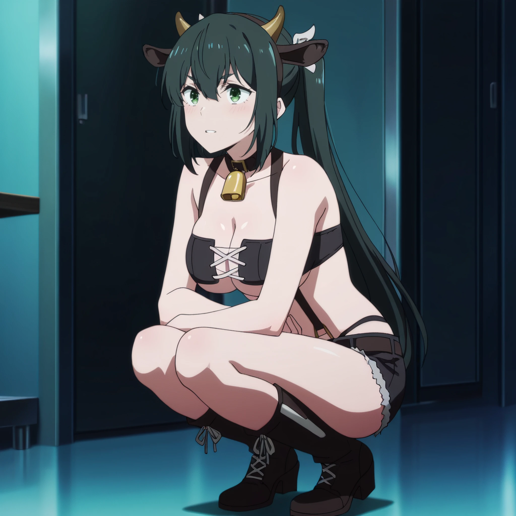 AMWCowTwo, long hair, black hair, eyebrows visible through hair, green eyes, animal ears, bangs, twintails, neck bell, cow ears, hair between eyes,