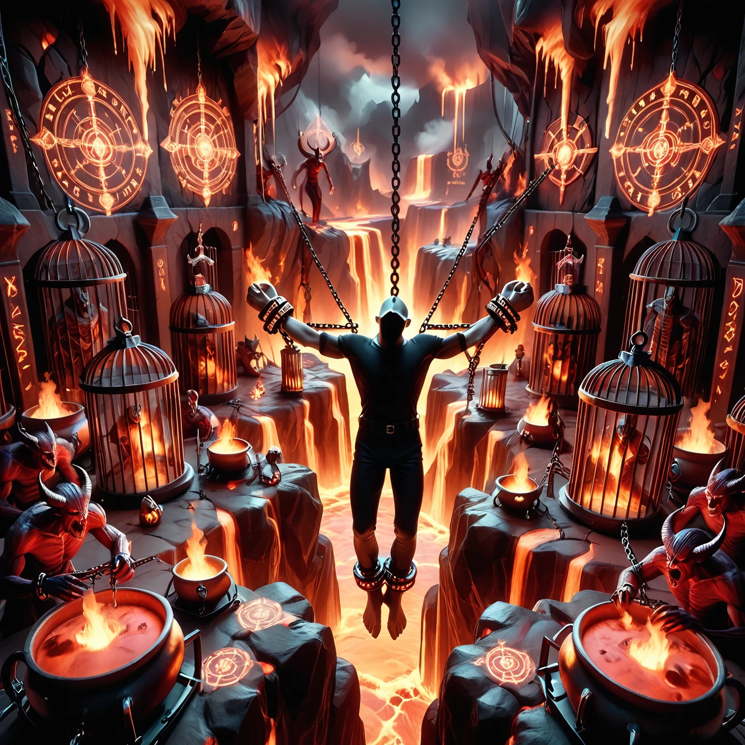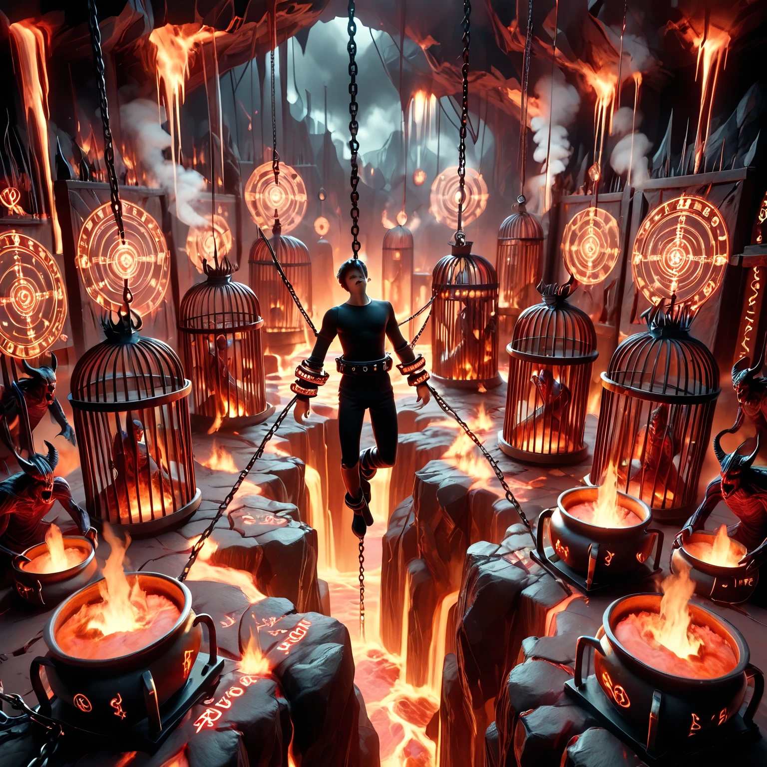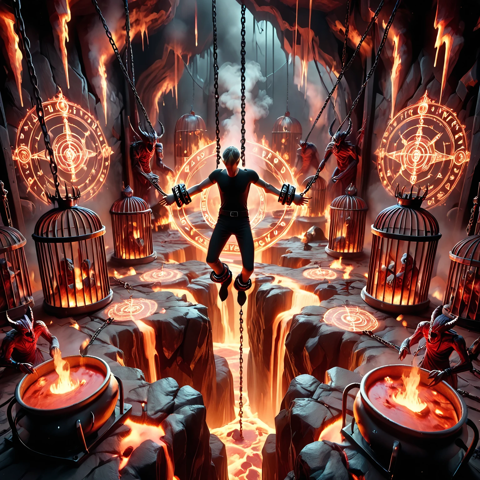 Trigger words: "hell prison, chains, lava river, glowing magic circle, fire, demon, cage, binding runes, rune handcuff, rune shackle, molten rock"