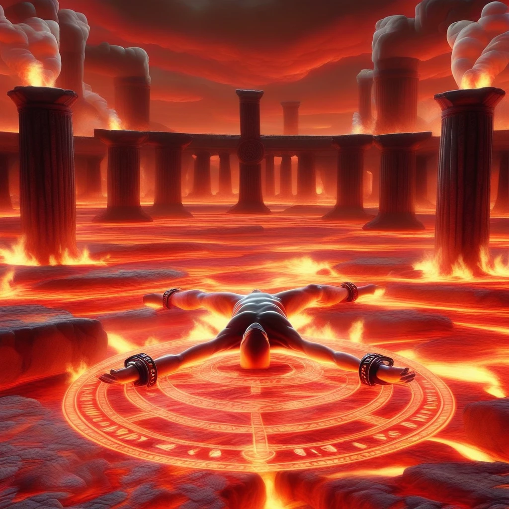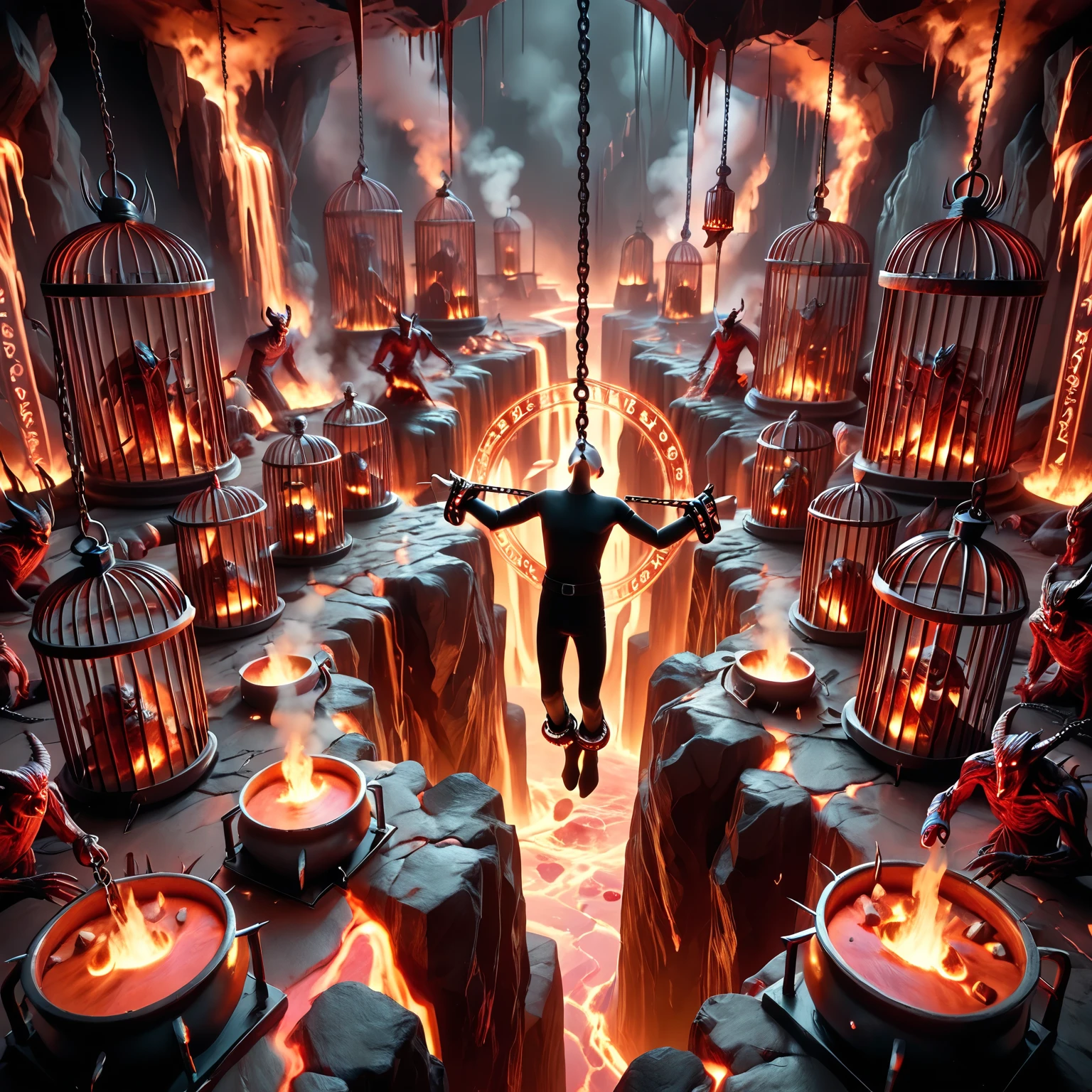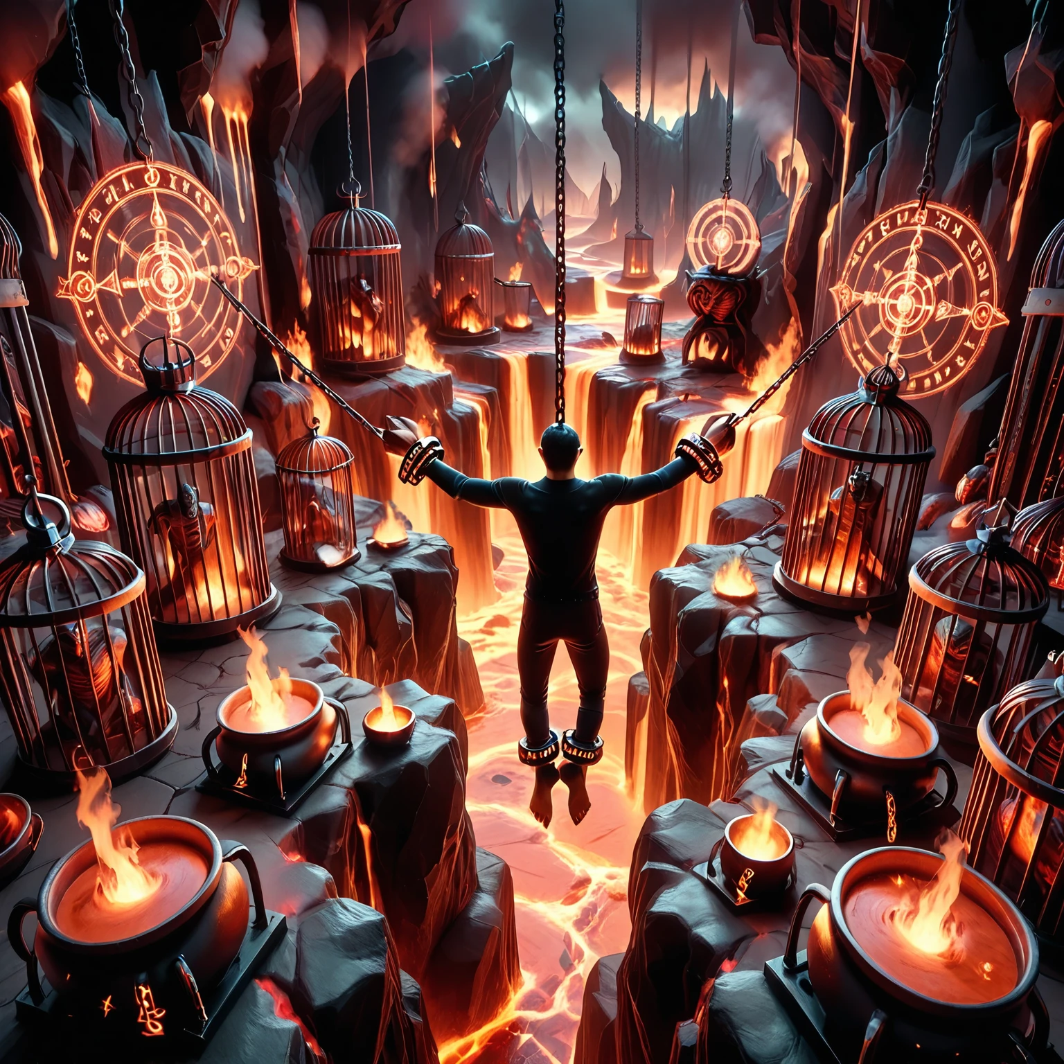 Trigger words: "hell prison, chains, lava river, glowing magic circle, fire, demon, cage, binding runes, rune handcuff, rune shackle, molten rock"