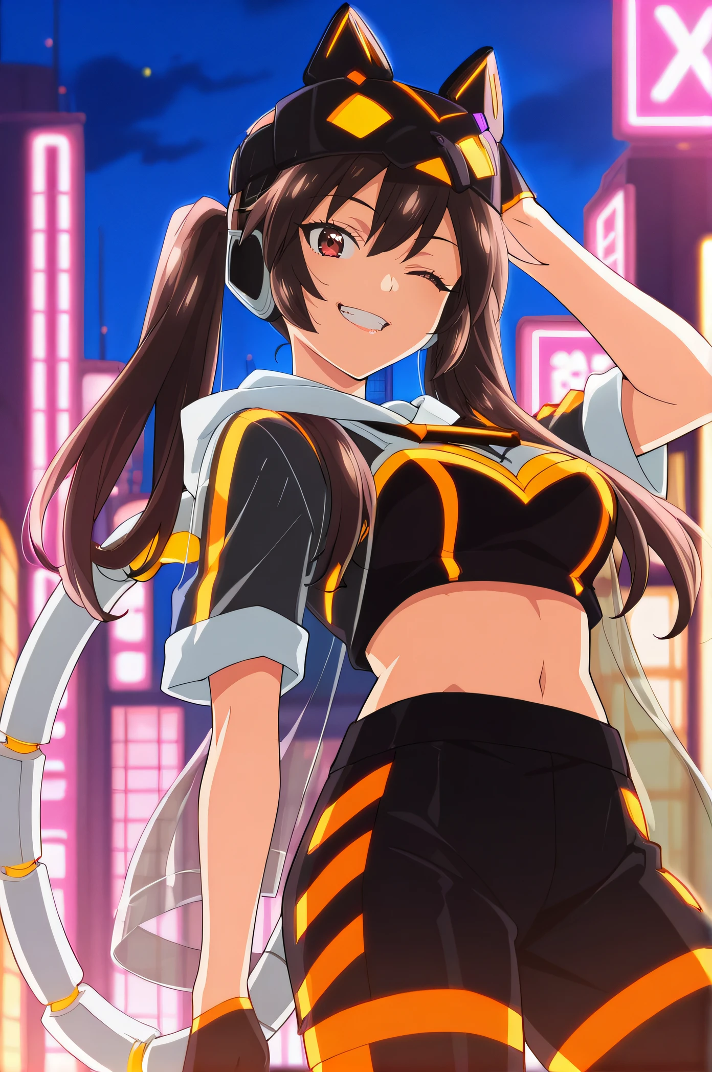 masquerena, brown hair, twintails, burgundy eyes, fake animal ears, headphones, mask up, midriff, hood, crop top, see-through jacket, short sleeves jacket, black thight pants, mechanical tail, black gloves, roller skates