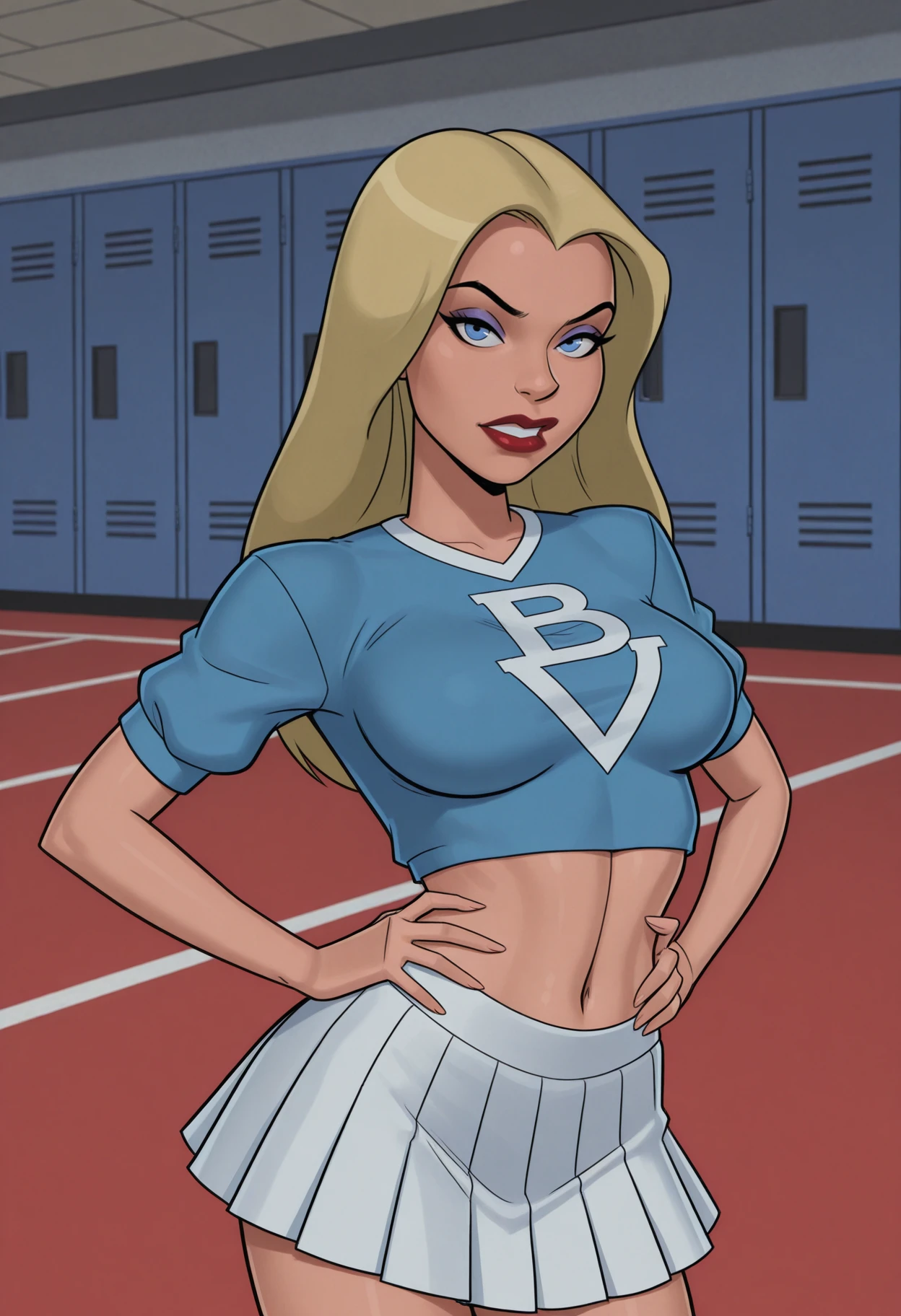 cheerleader_star_outfit, crop top, shirt, blue shirt, skirt, pleated skirt, white skirt, miniskirt, superhero outfit tags: