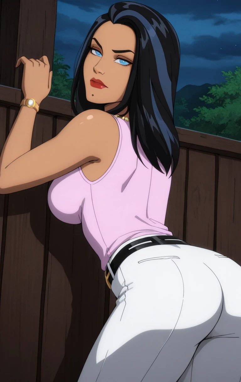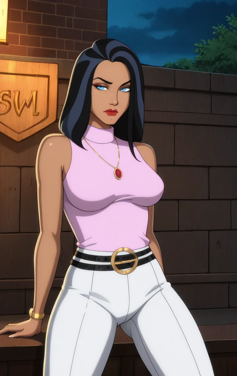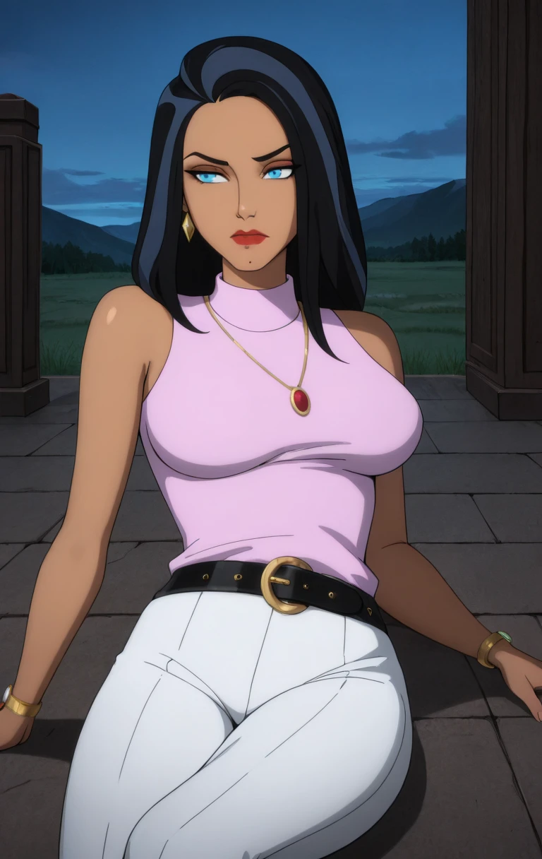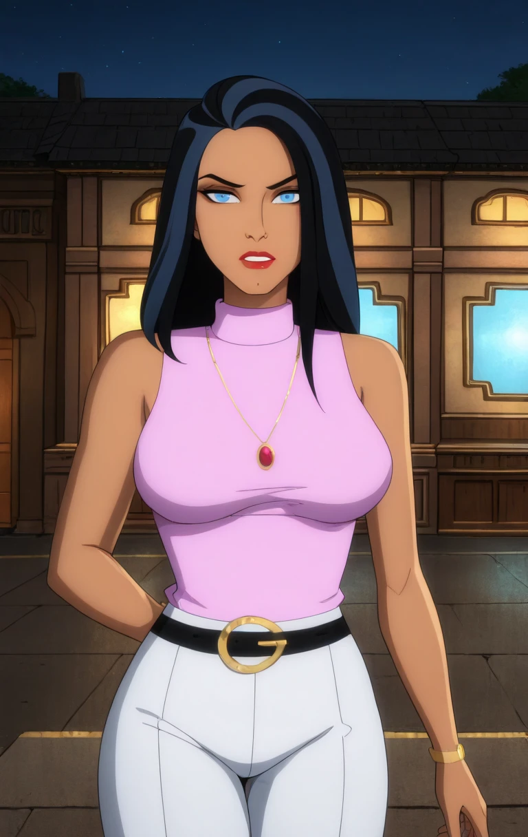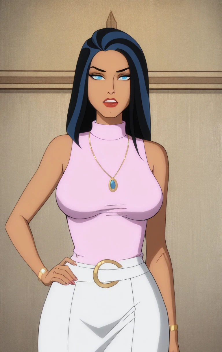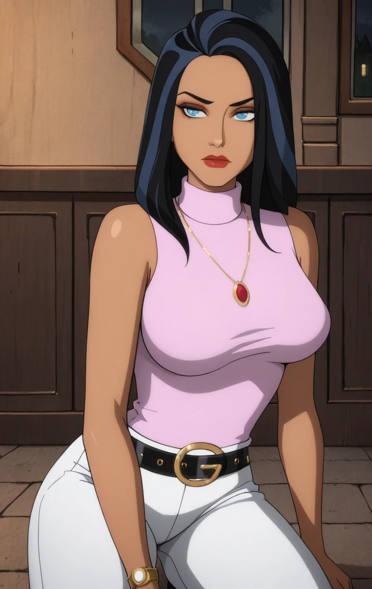 1girl, solo, long hair, breasts, looking at viewer, blue eyes, black hair, jewelry, medium breasts, sleeveless, necklace, two-tone hair, white pants, belt, t4l1a4lg00l,