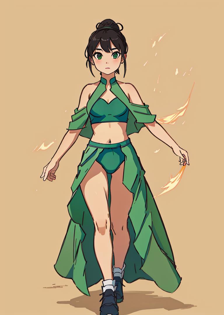 The LoRA was trained with around 35 photos, many of them of dancers, so do be surprised if you get the occasional weird pose. Both "open front skirt" and "open_front_skirt" seem to work as triggers.