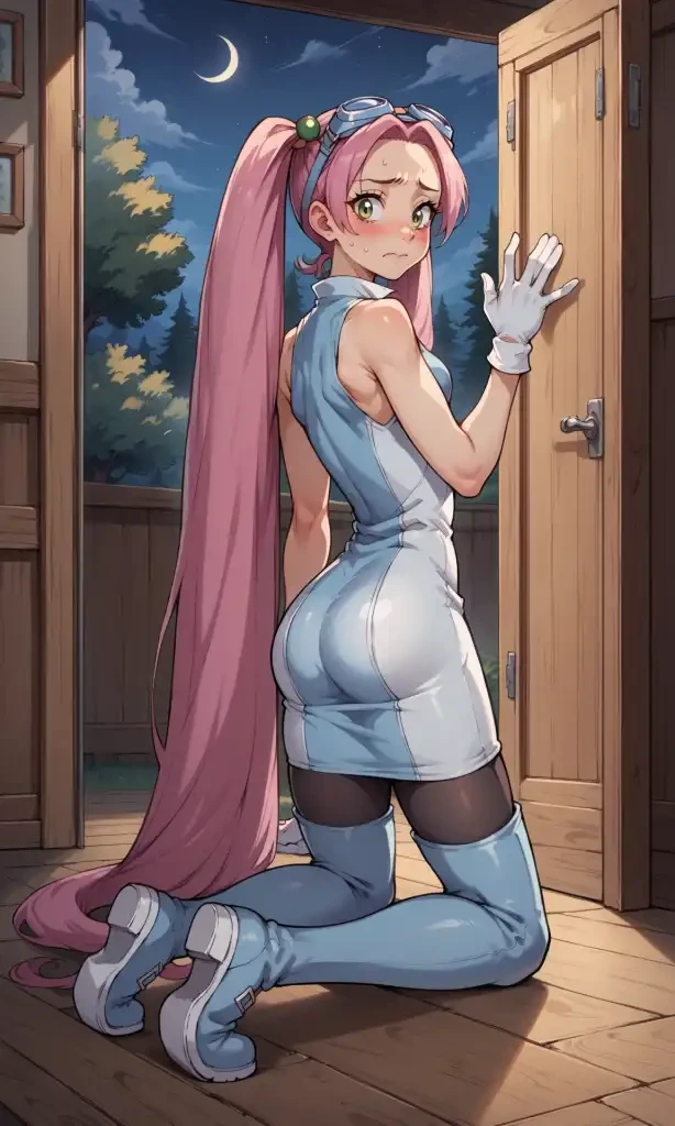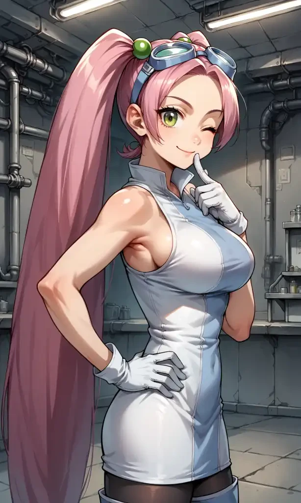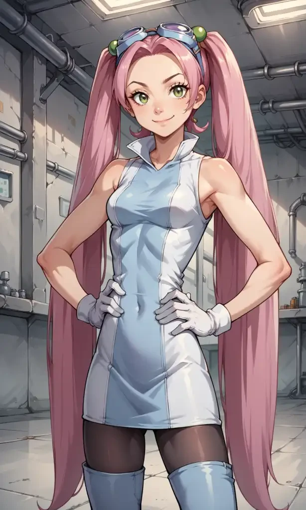 twintails, very long hair, goggles on head, hair bobbles, sleeveless dress, white gloves, black pantyhose, thigh boots