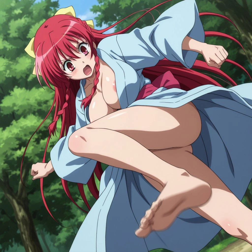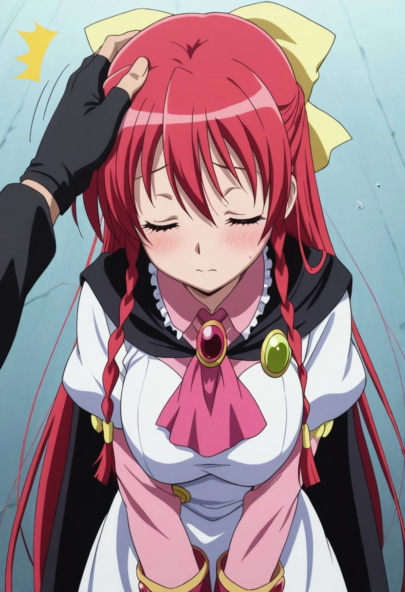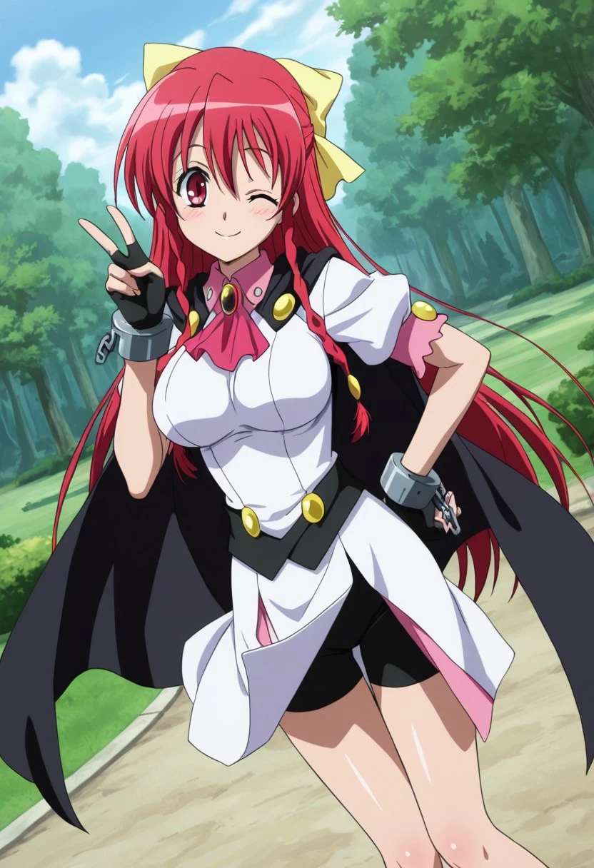 Trigger: Macaroni, yellow ribbon behind the head, long hair, dark pinkish red hair, pinkish red eyes, young adult, twin braids, large breasts,