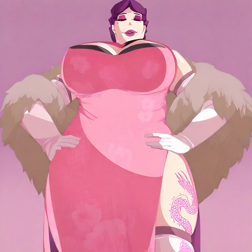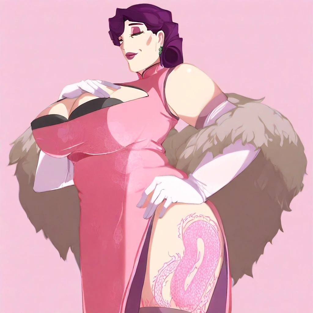 pink china dress, black bracups, white elbow gloves, see-through thighhighs, feather boa,