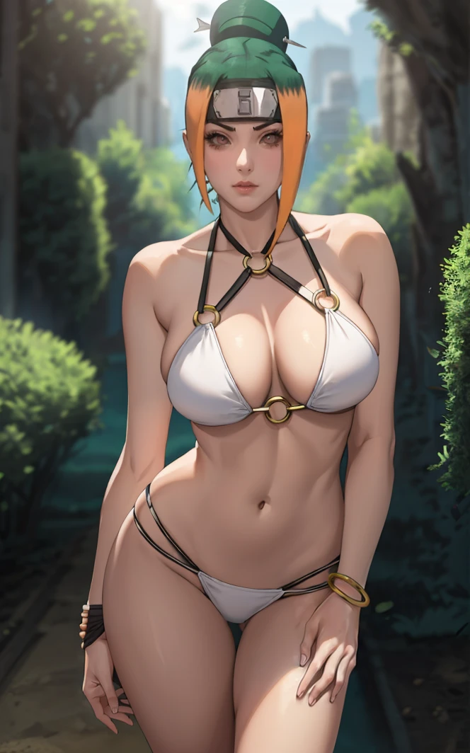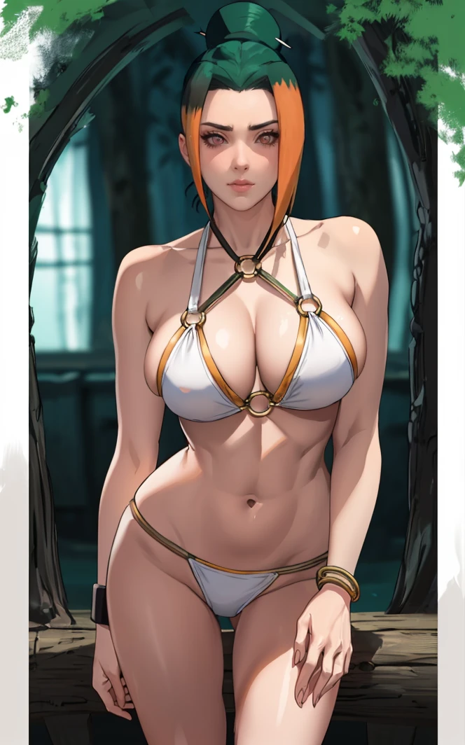 1girl, forehead protector, brown eyes, black sclera, colored sclera, single hair bun, green hair, orange hair, hair ornament, breasts, large breasts, multicolored hair, collarbone, two-tone hair,