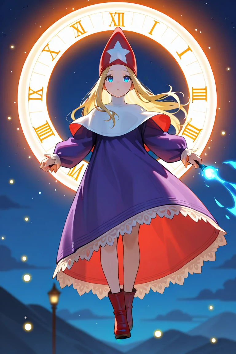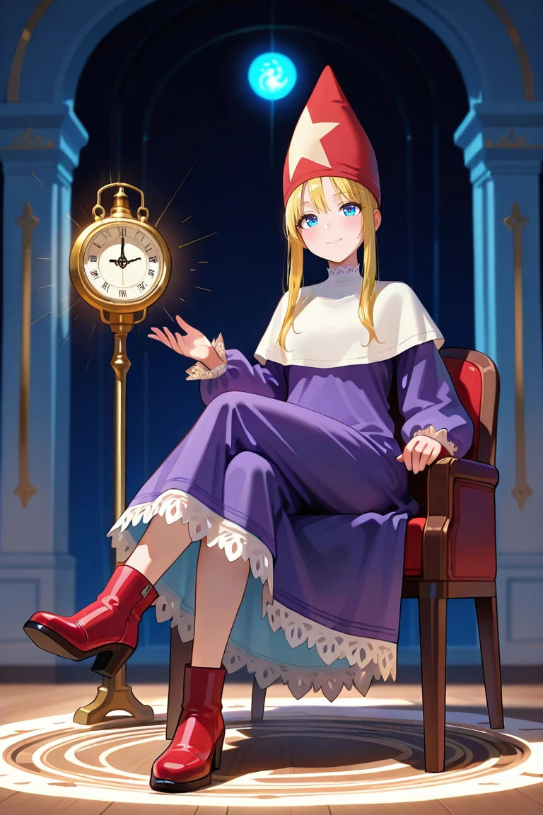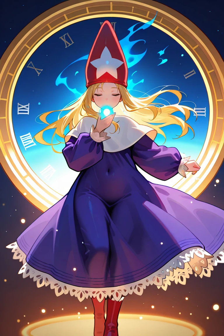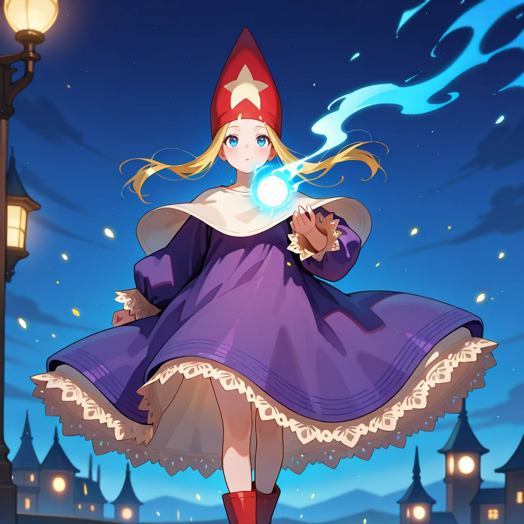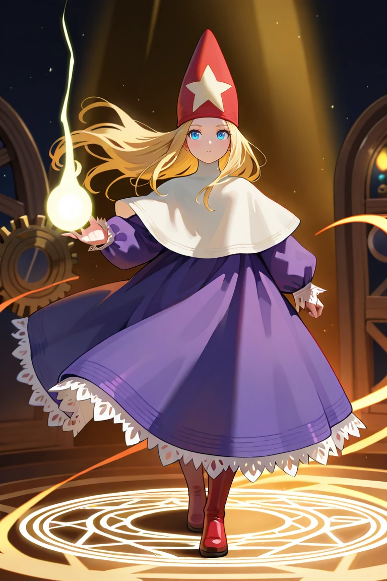 purple robe,voluminous clothing,heavy fabric,puffy sleeves,lace trim,long sleeves,red wizard hat,star ornament on hat ,capelet,red footwear