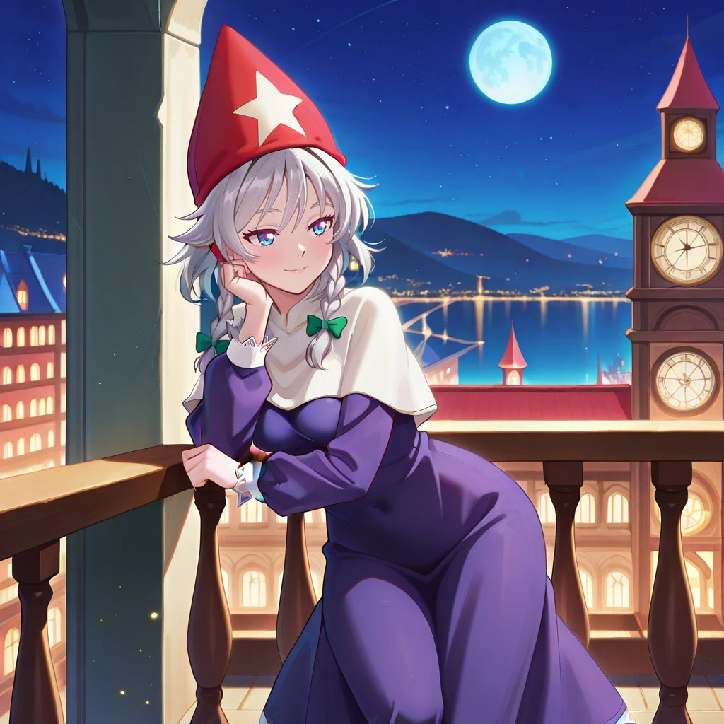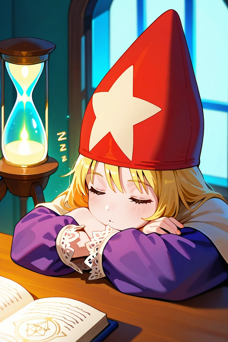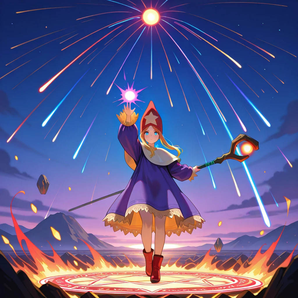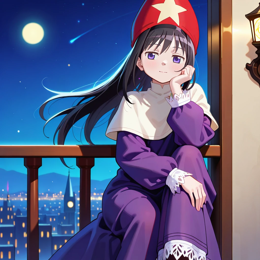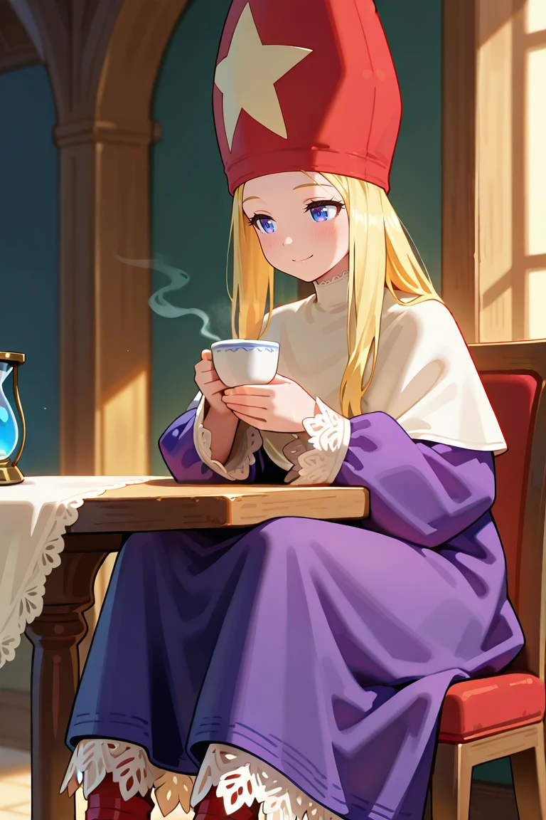 purple robe,voluminous clothing,heavy fabric,puffy sleeves,lace trim,long sleeves,red wizard hat,star ornament on hat ,capelet,red footwear
