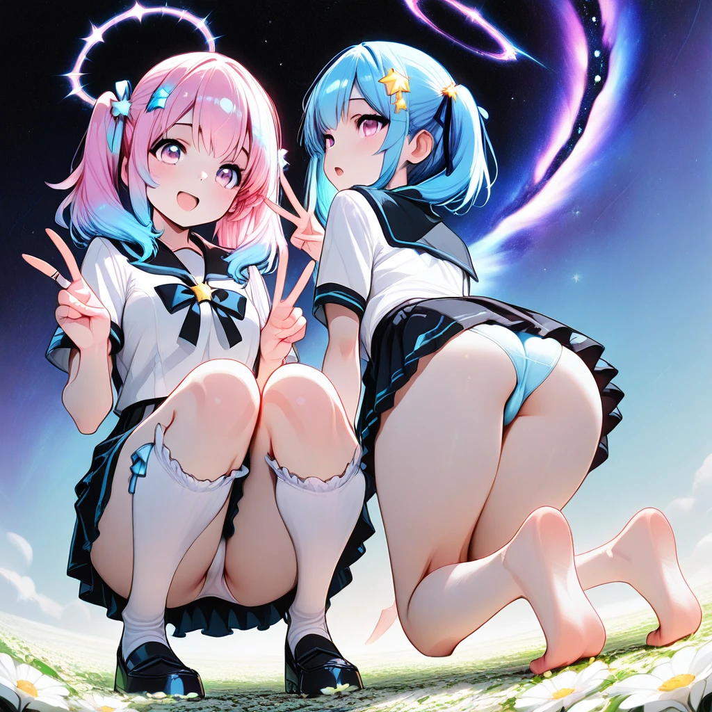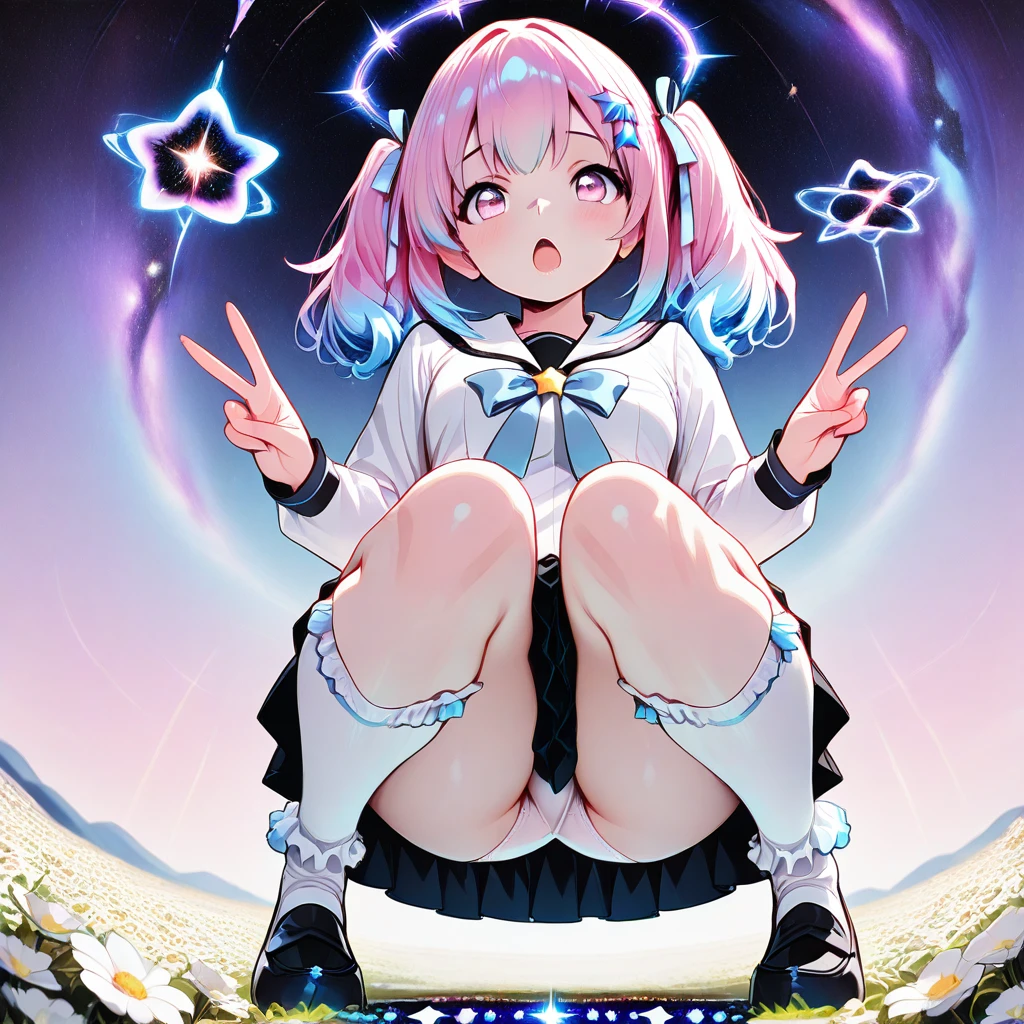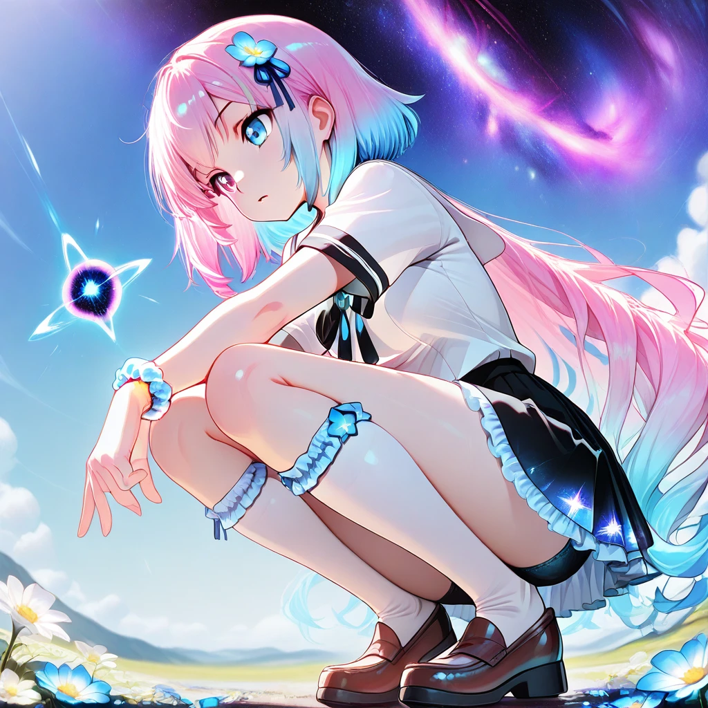 Japanese uniform, cosmic power, cosmic background, star (sky), multicolored hair, pleated skir, white shirt, red bow, blue frilly cosmic star skirt