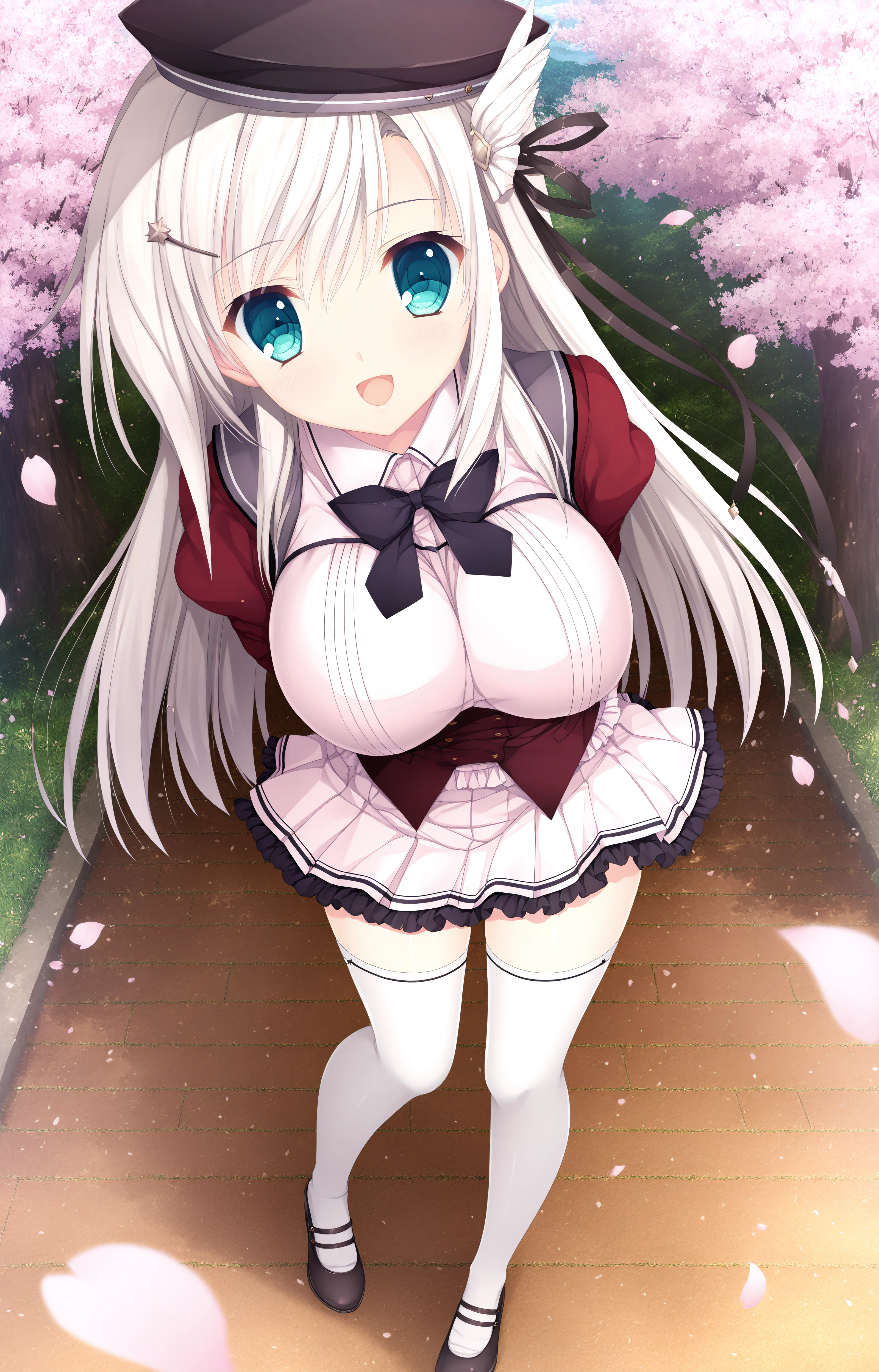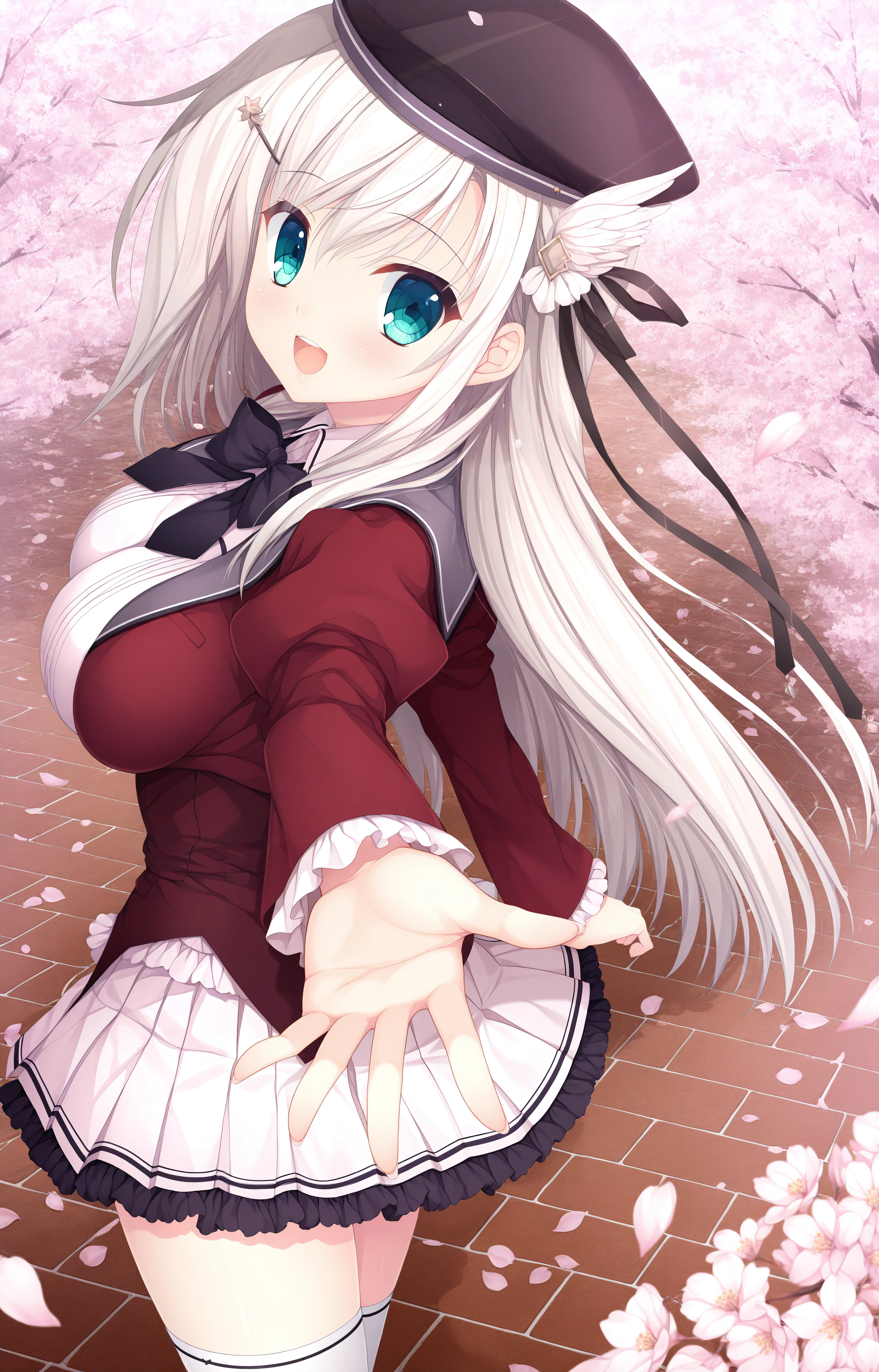 Uniform: Uniform Erisa,school uniform,red sleeves,juliet sleeves,long sleeves,black beret, black ribbon,white skirt,pleated skirt,white thighhighs,black bow,Black frills,frilled skirt, zettai ryouiki,high heels,