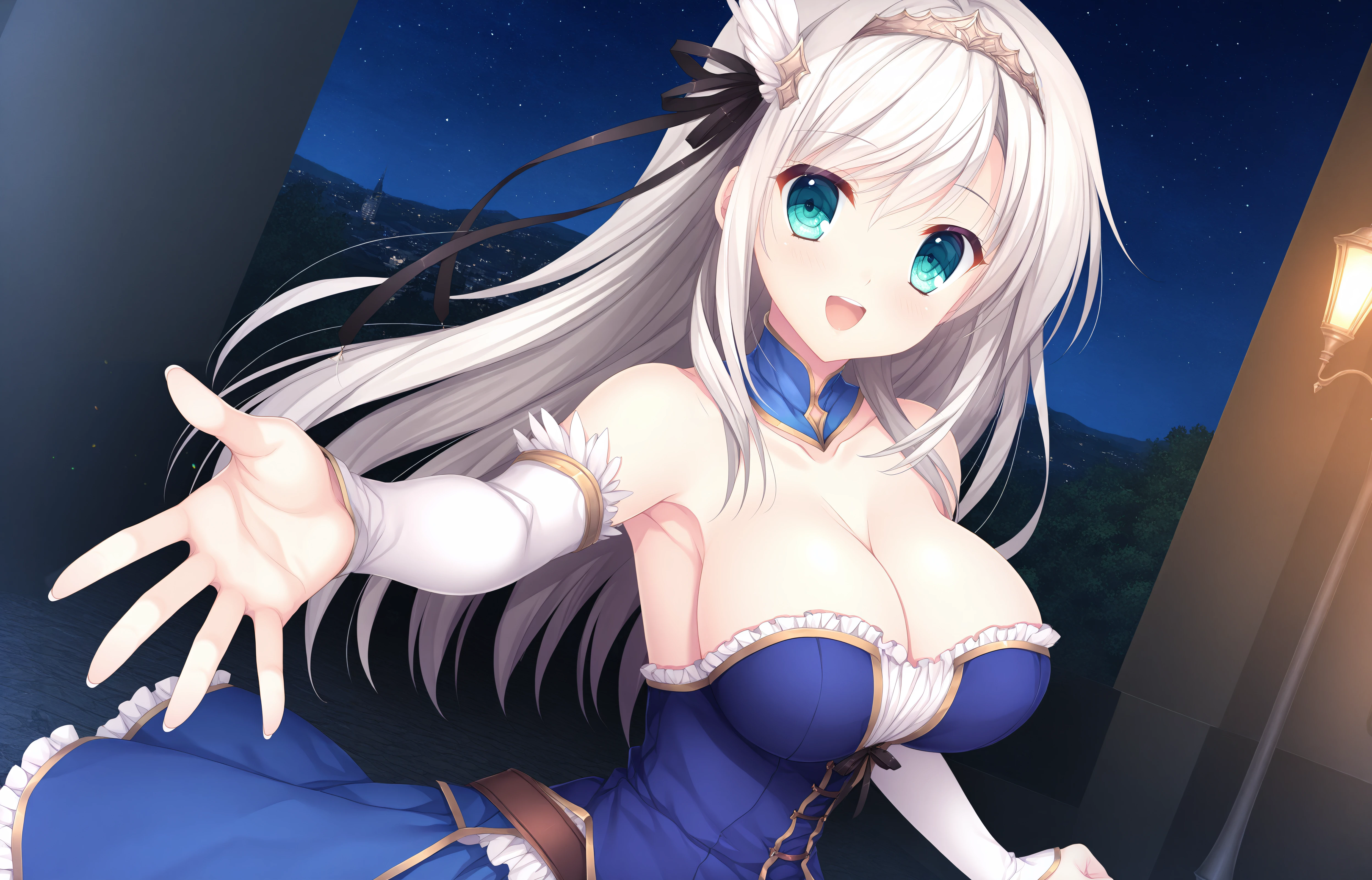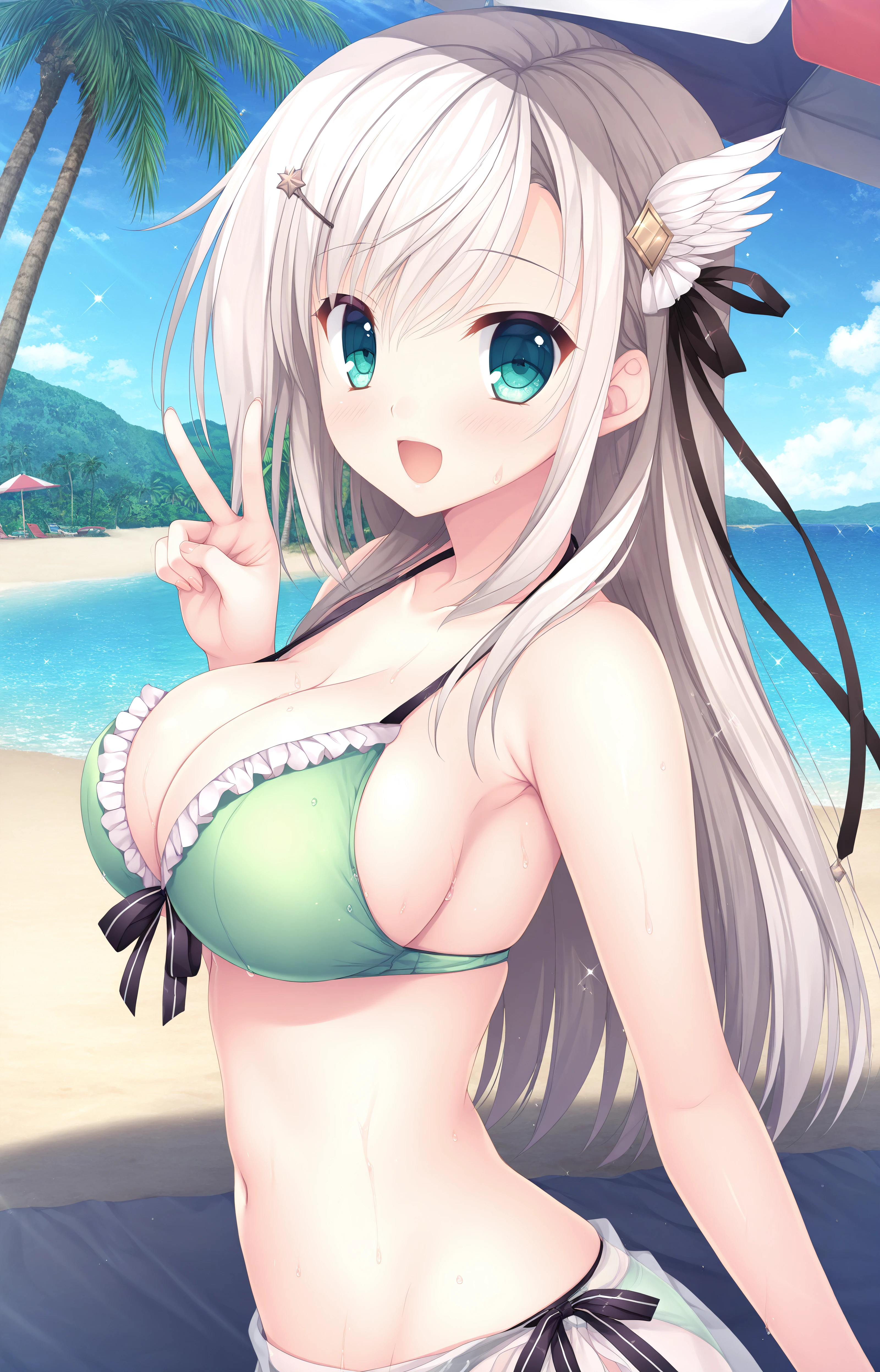 Base: Erisa,white hair,long hair,hair clip,Hair Ribbon,Black Ribbon,aqua eyes,large breasts,hair ornament,
