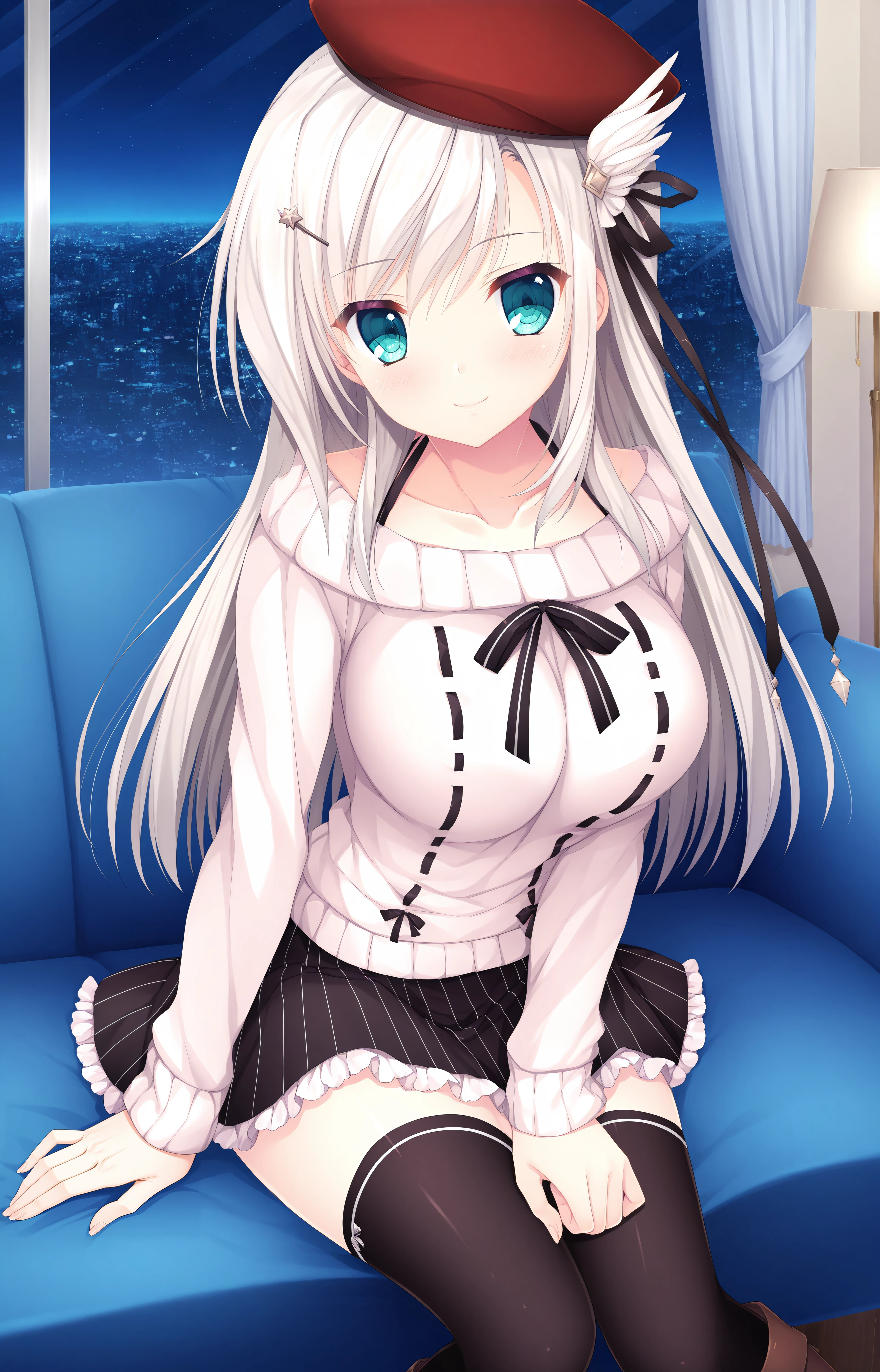 White sweater: Casual Erisa,Red beret,sweater,White sweater,Knee boots,zettai ryouiki, black bow,cleavage,black thighhighs,skirt,White frills,frilled skirt,long sleeves,