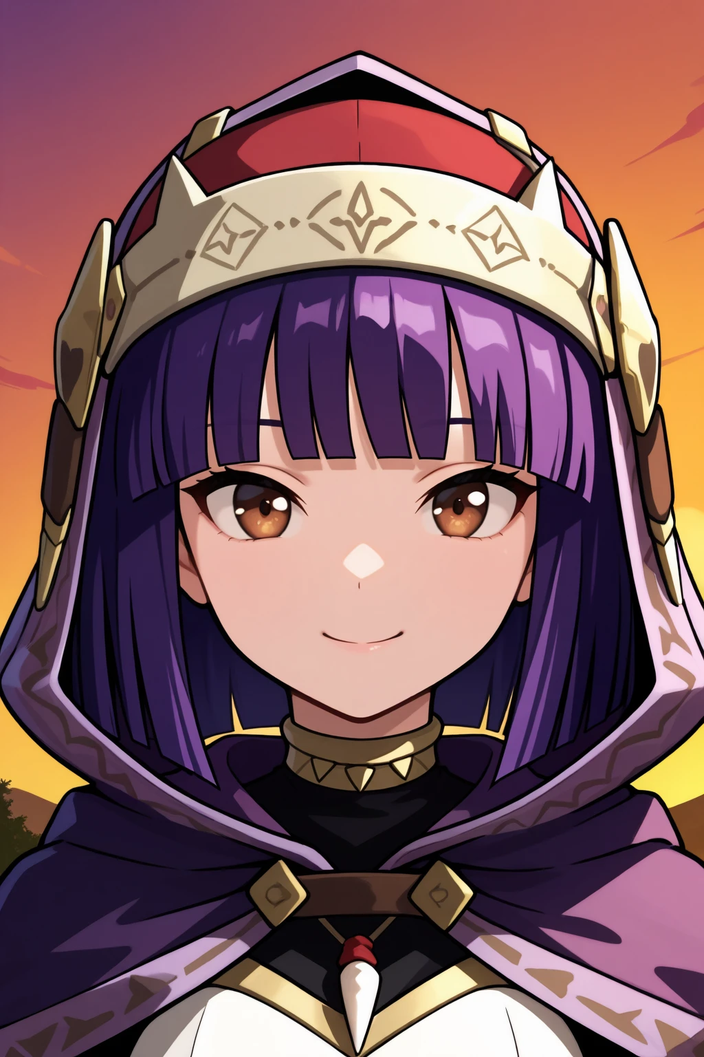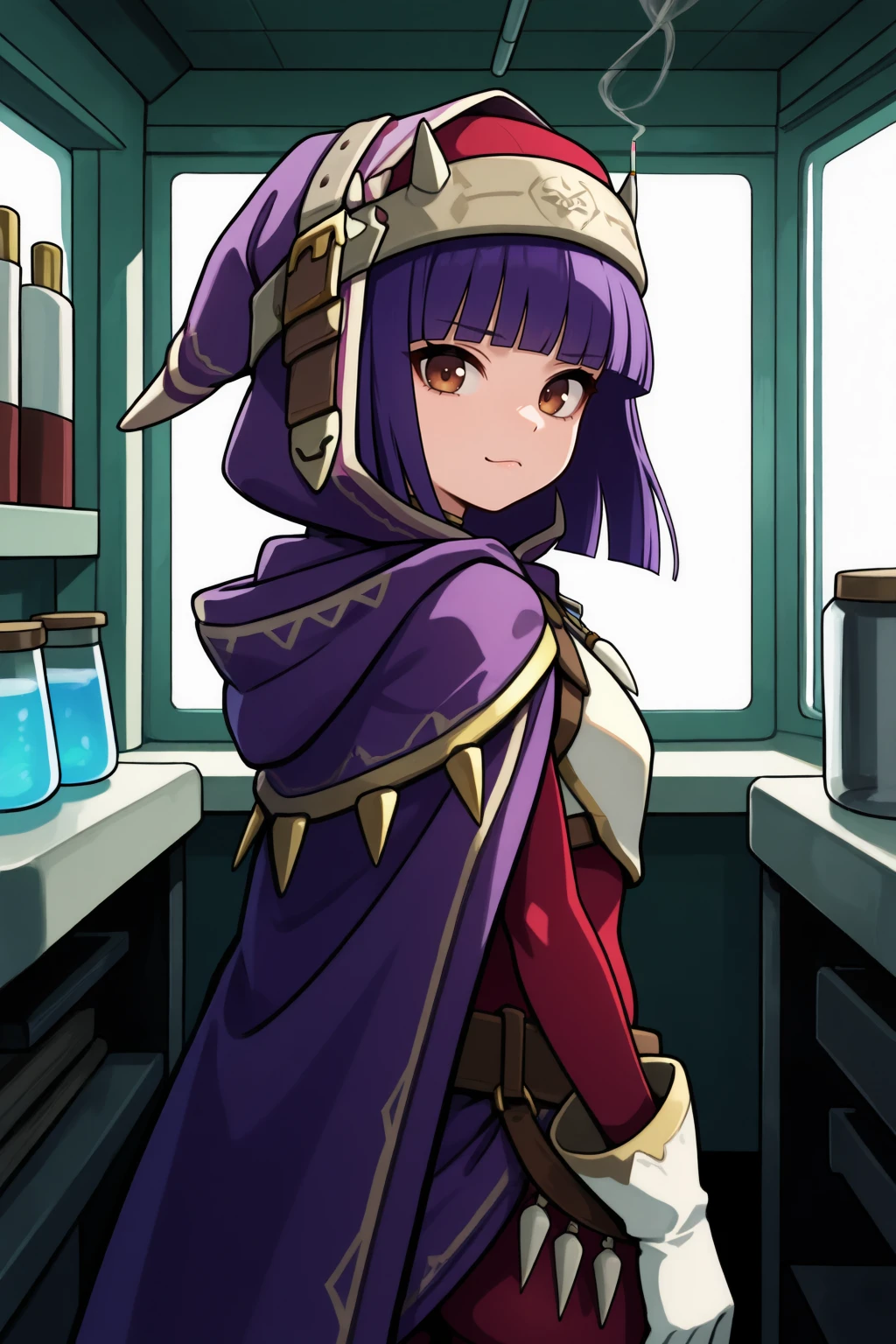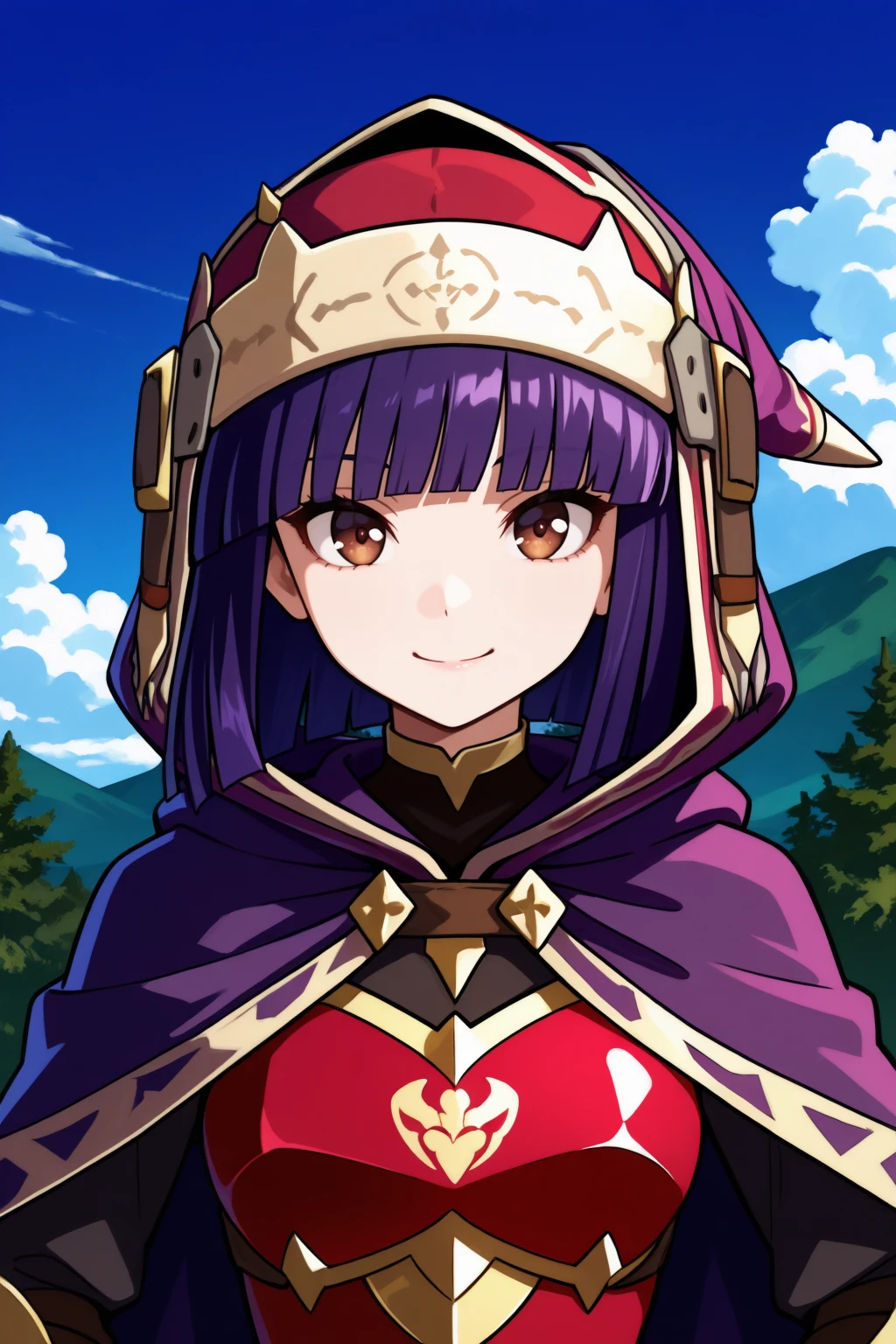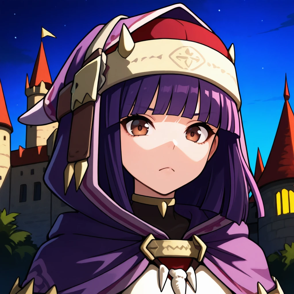 Portrait: 1girl, purple hair, short hair, blunt bangs, blunt ends, brown eyes, hood, hood up, hooded cloak, purple cloak, hat ornament, red hat, grey hairband,