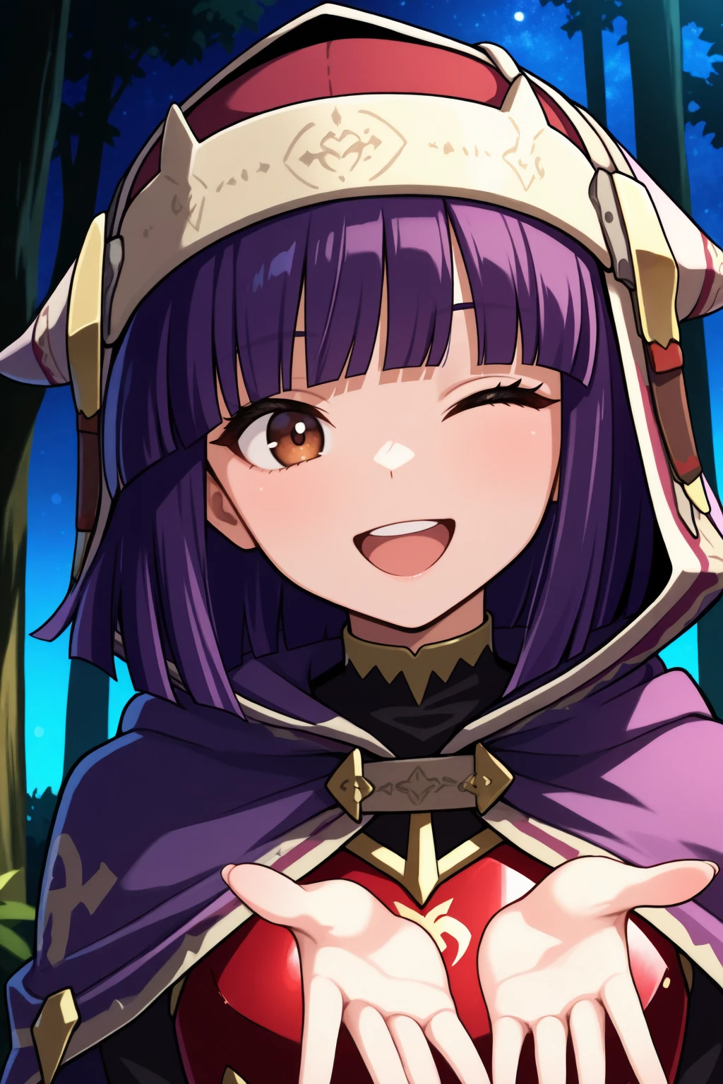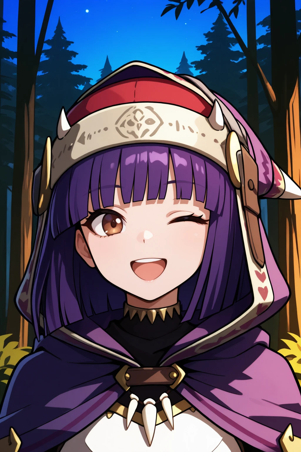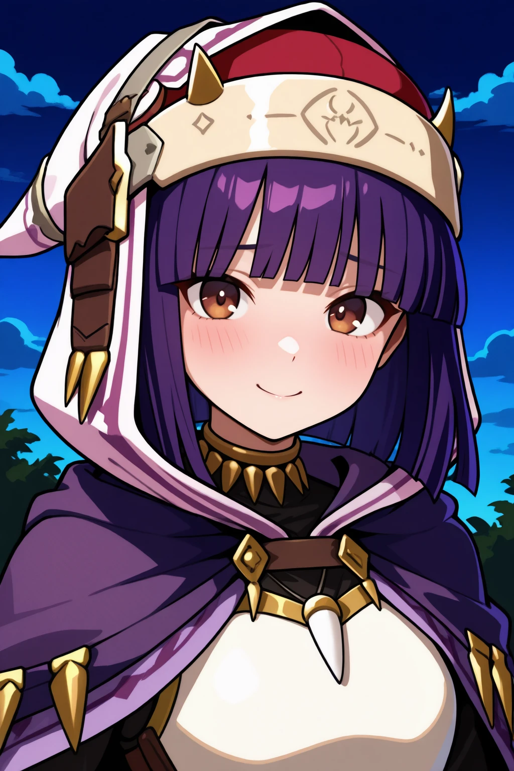 Portrait: 1girl, purple hair, short hair, blunt bangs, blunt ends, brown eyes, hood, hood up, hooded cloak, purple cloak, hat ornament, red hat, grey hairband,