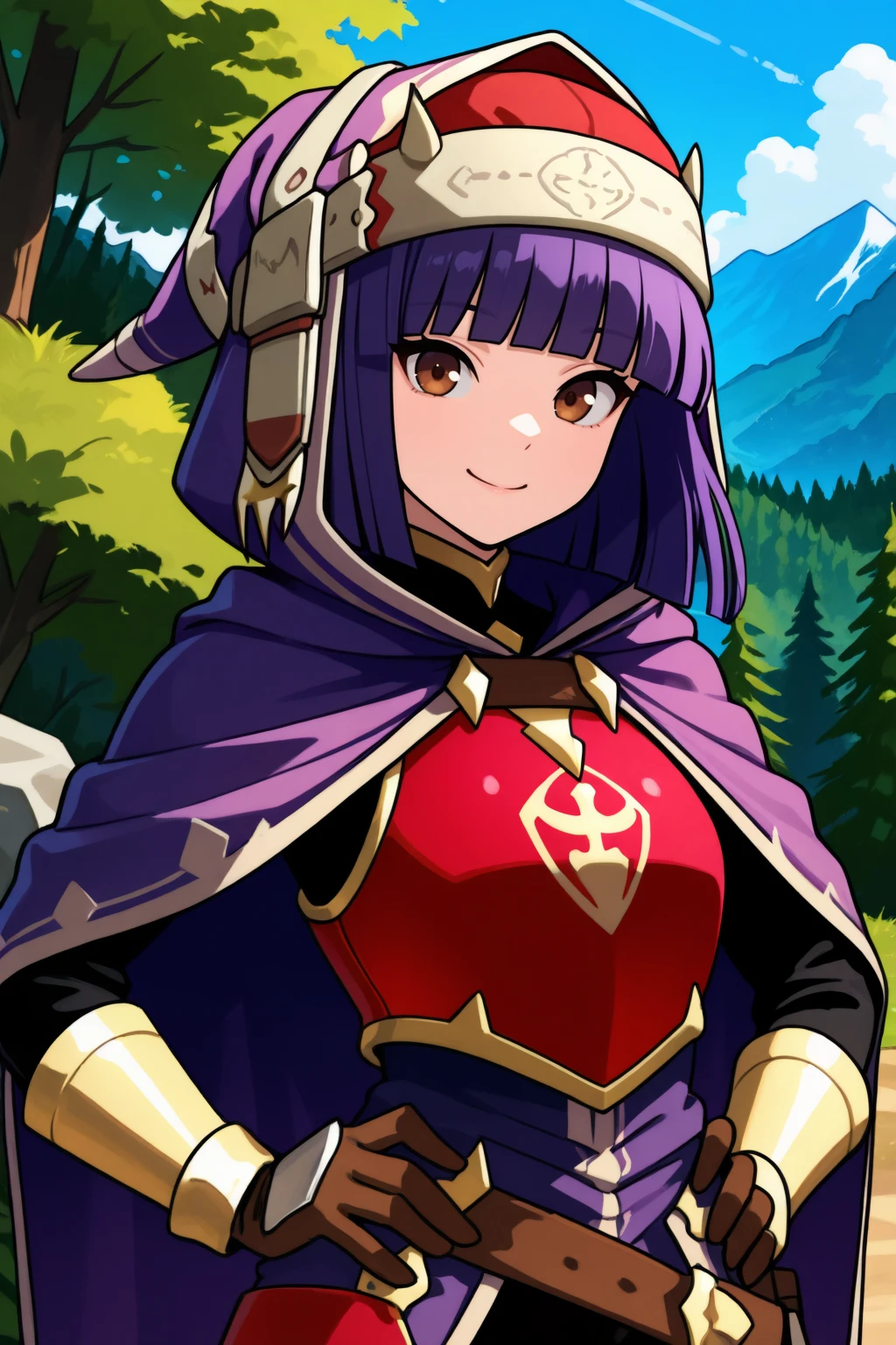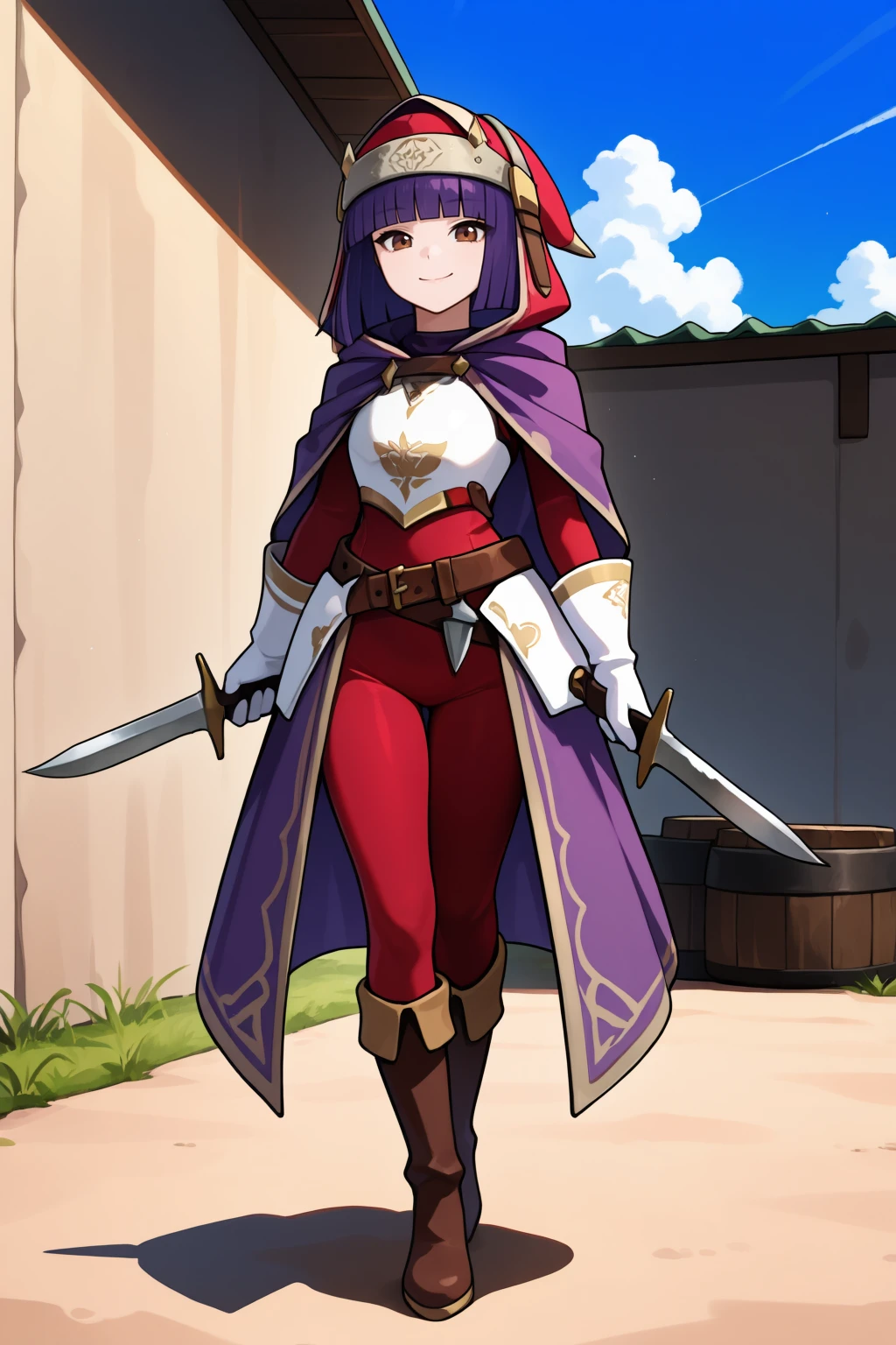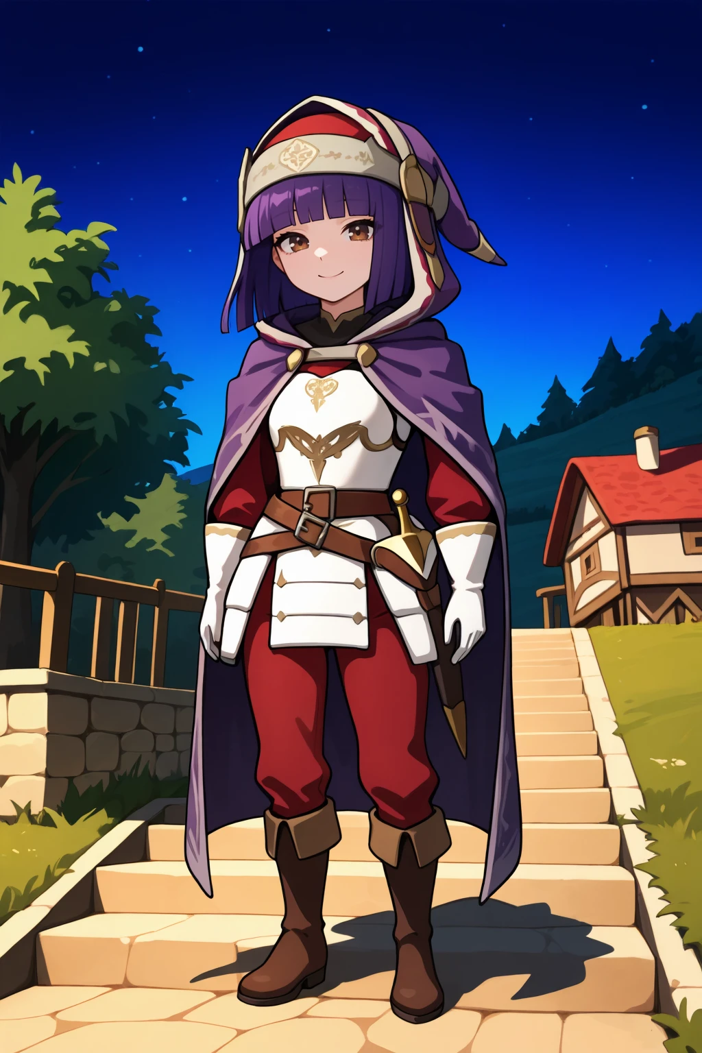 Full Body 2: 1girl, purple hair, short hair, blunt bangs, blunt ends, brown eyes, hood, hood up, hooded cloak, purple cloak, hat ornament, red hat, grey hairband, breastplate, red armor, red shirt, belt, purple waist cape, gauntlets, black pants, boots