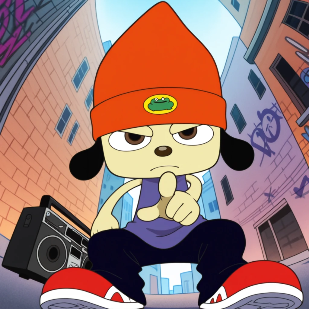 orange beanie, blue shirt, sleeveless, blue baggy pants, red and white sneakers