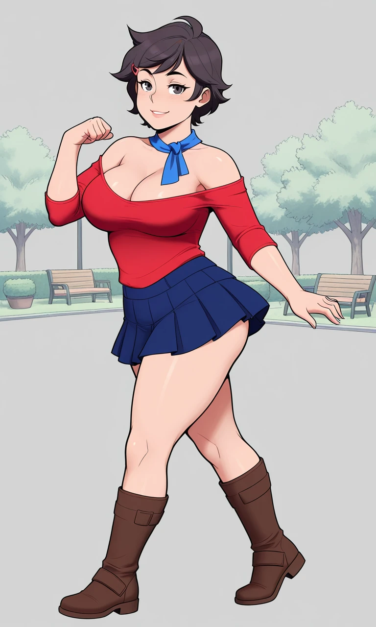 shirt, skirt, cleavage, bare shoulders, pleated skirt, boots, miniskirt, off shoulder, blue skirt, brown footwear, red shirt, off-shoulder shirt, blue scarf, blue ascot, neckerchief,