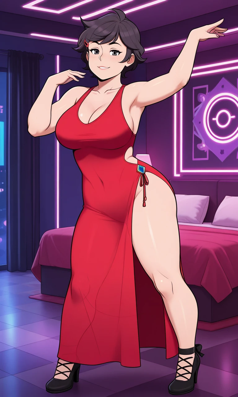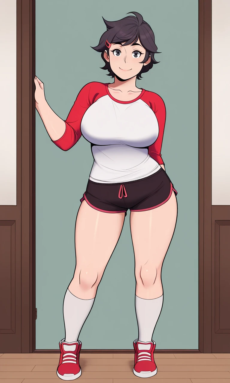 j4n3, 1girl, solo, looking at viewer, seductive smile, short hair, large breasts, brown hair, black hair, hair ornament, brown eyes, collarbone, full body, hairclip, black eyes, mature female, tomboy, thick thighs,