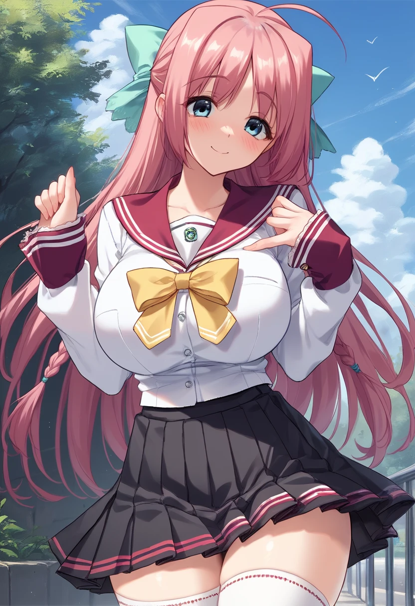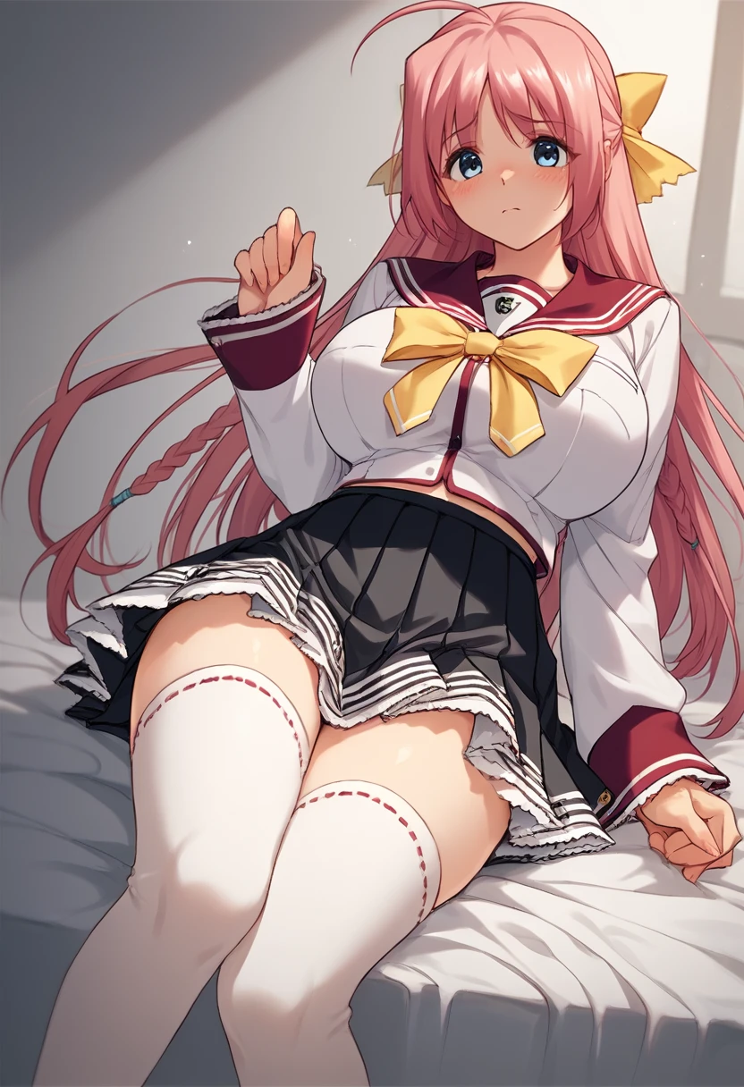 Default Outfit: "white and red school uniform, black pleated skirt, thighhighs, serafuku, long sleeves, yellow bow"