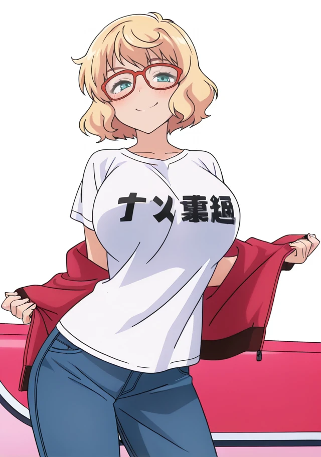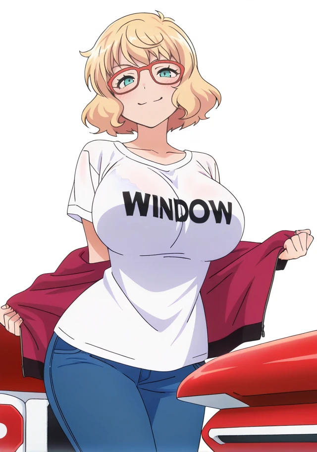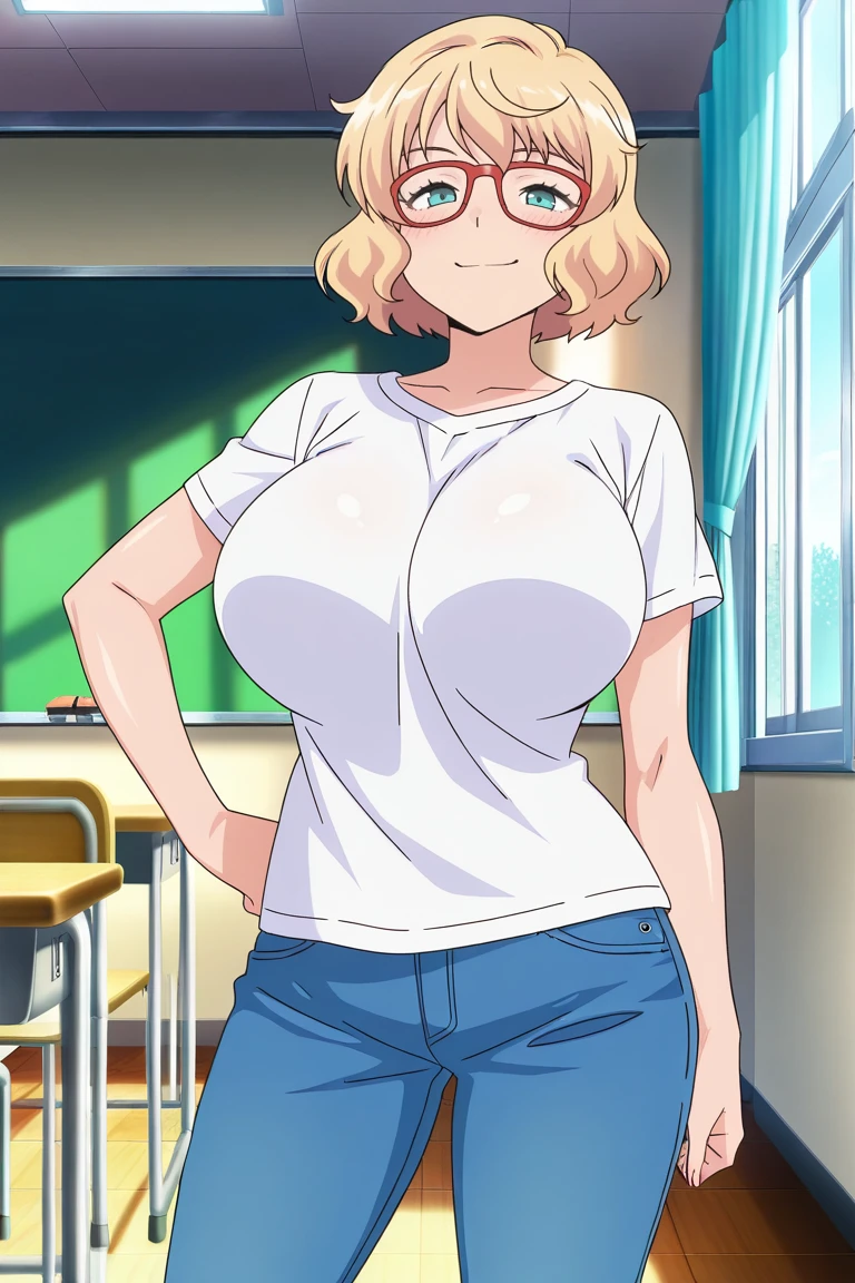 1girl, mature, Annie Brown, blonde hair, short hair, wavy hair, huge breasts, shiny skin, aqua eyes, red glasses,
