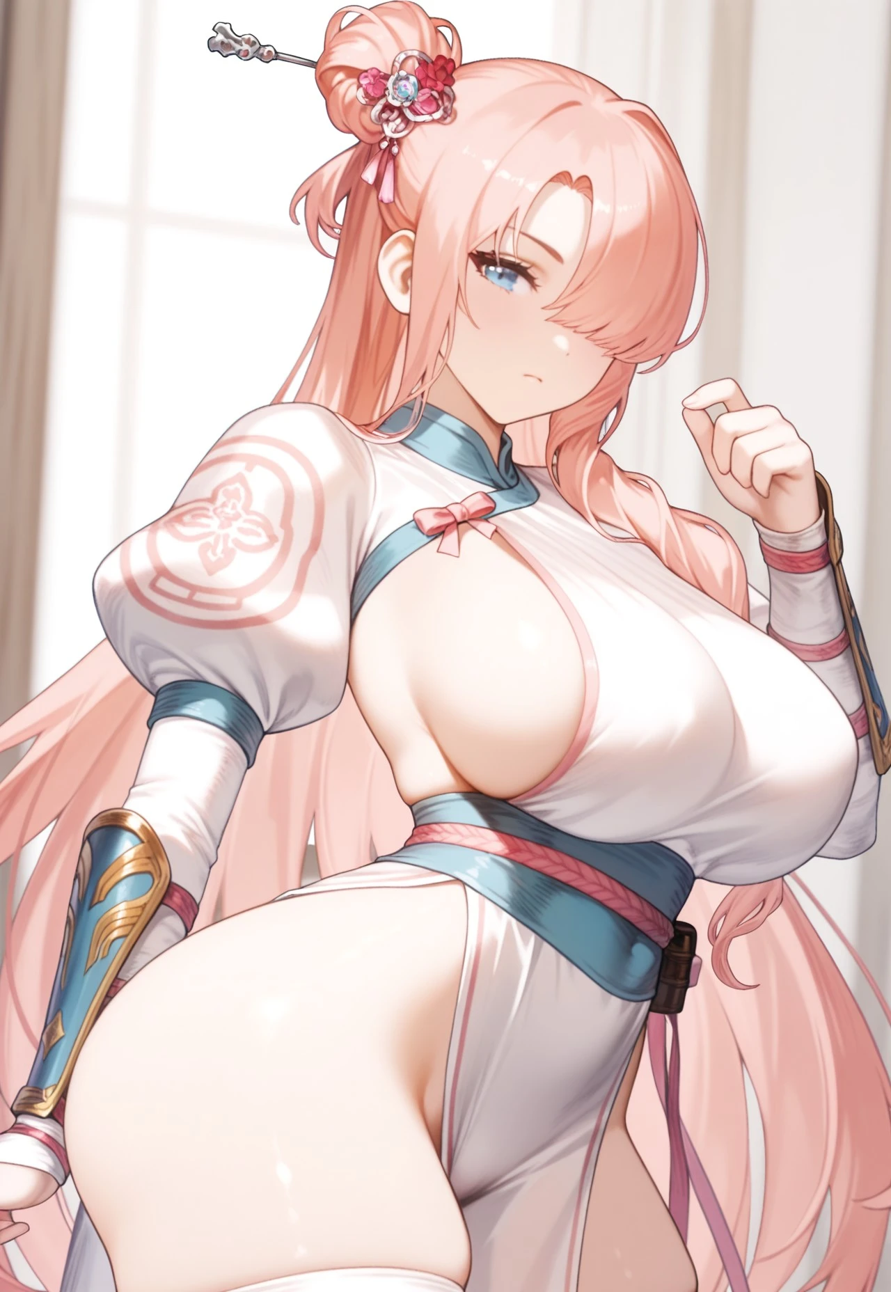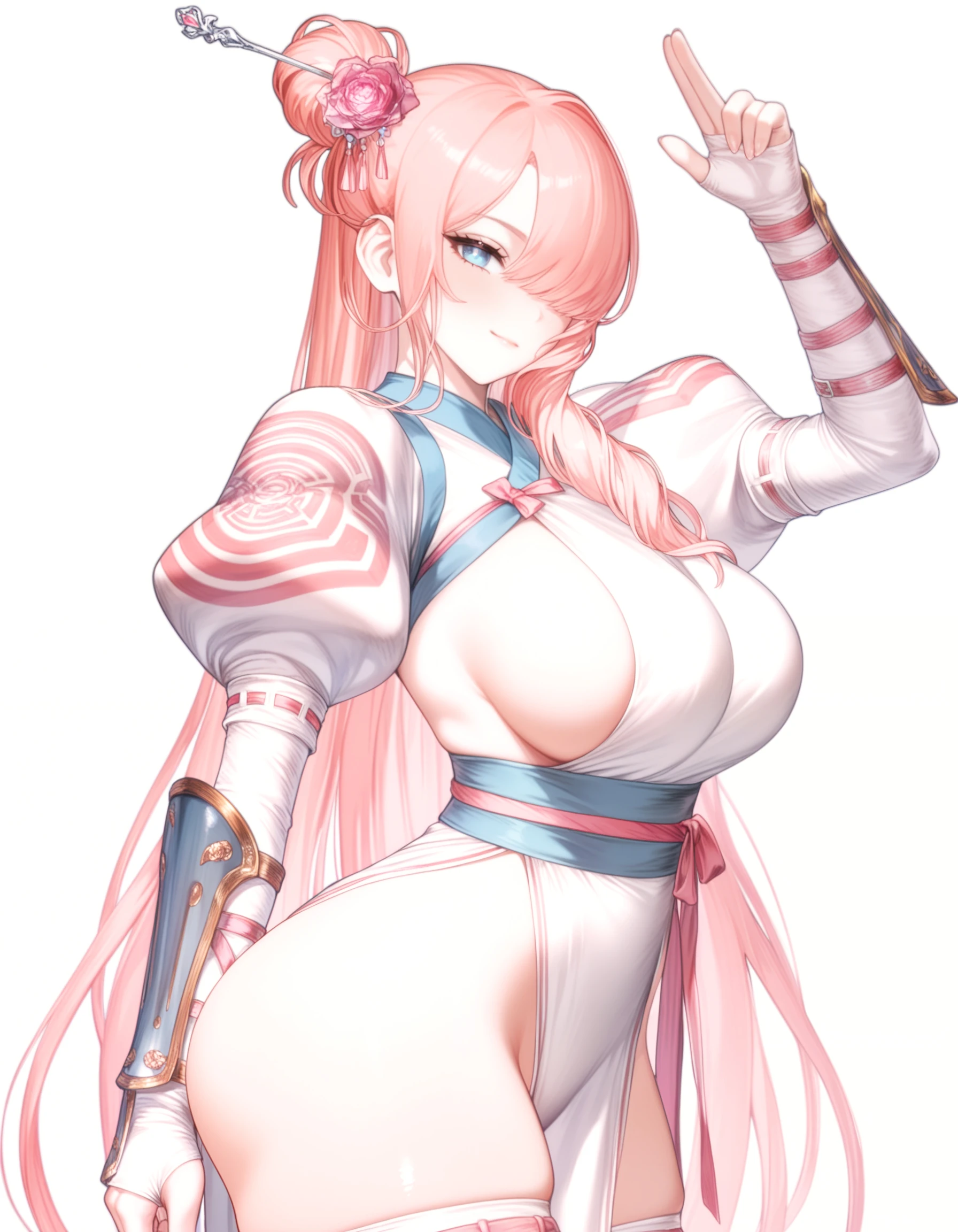Sylviaswqueen, large breasts, long hair, hair bun, pink hair, hair over one eye, blue eyes, white jeogori, puffy sleeves, white pelvic_curtain_dress, sideboob, white arm_tosh, arm_guard, korean waist belt, pink strap, white thighhighs, korean_traditional_sandals,