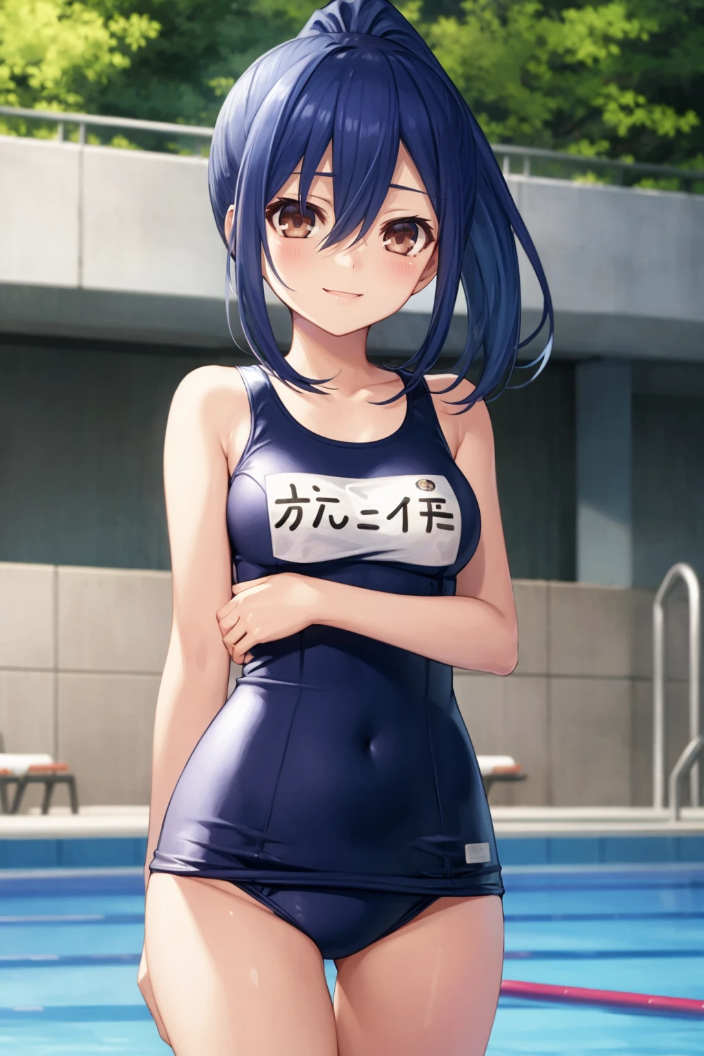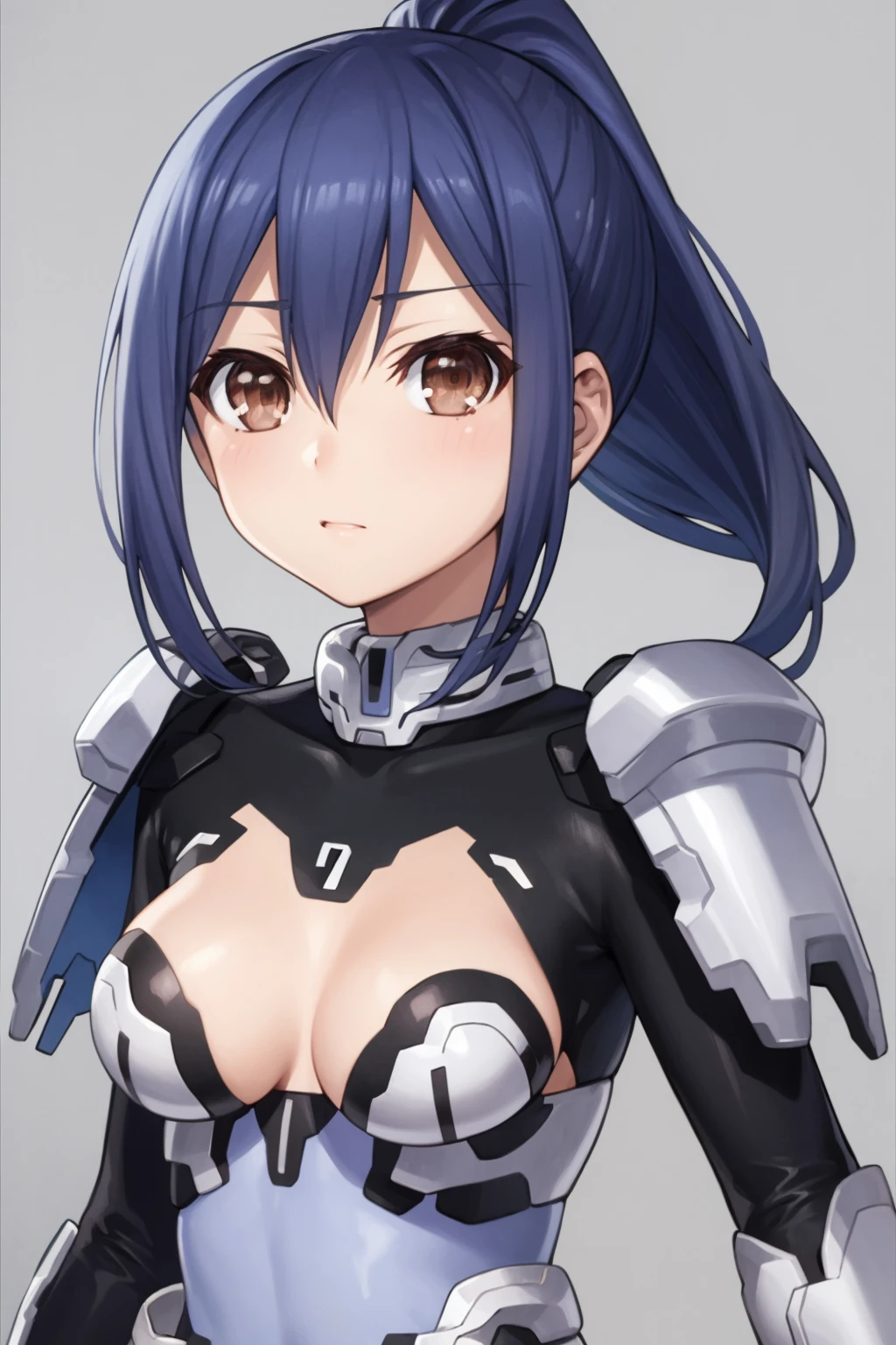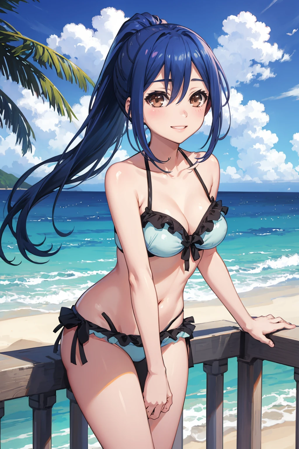 Basic prompts : 1girl, blue hair, bangs, ponytail, hair between eyes, brown eyes, mole