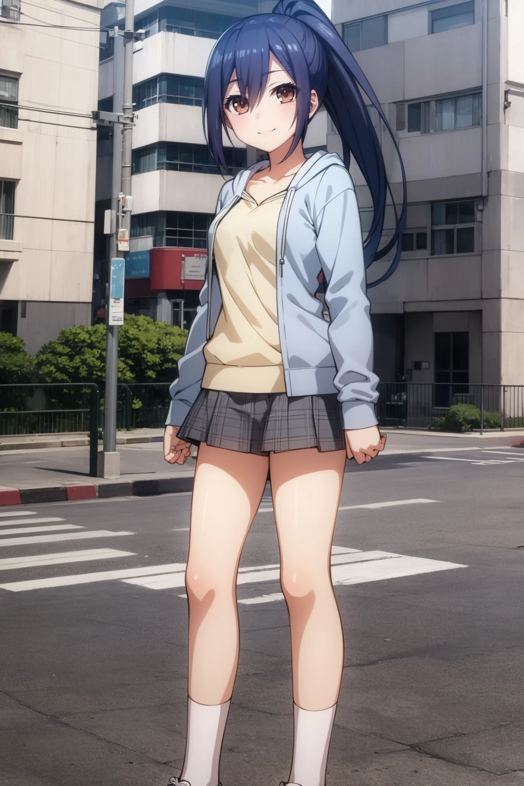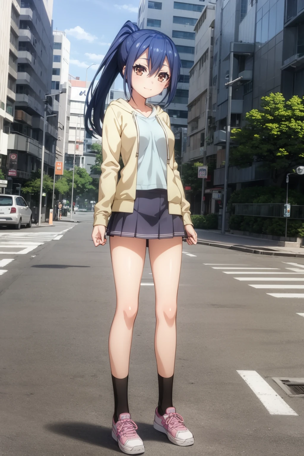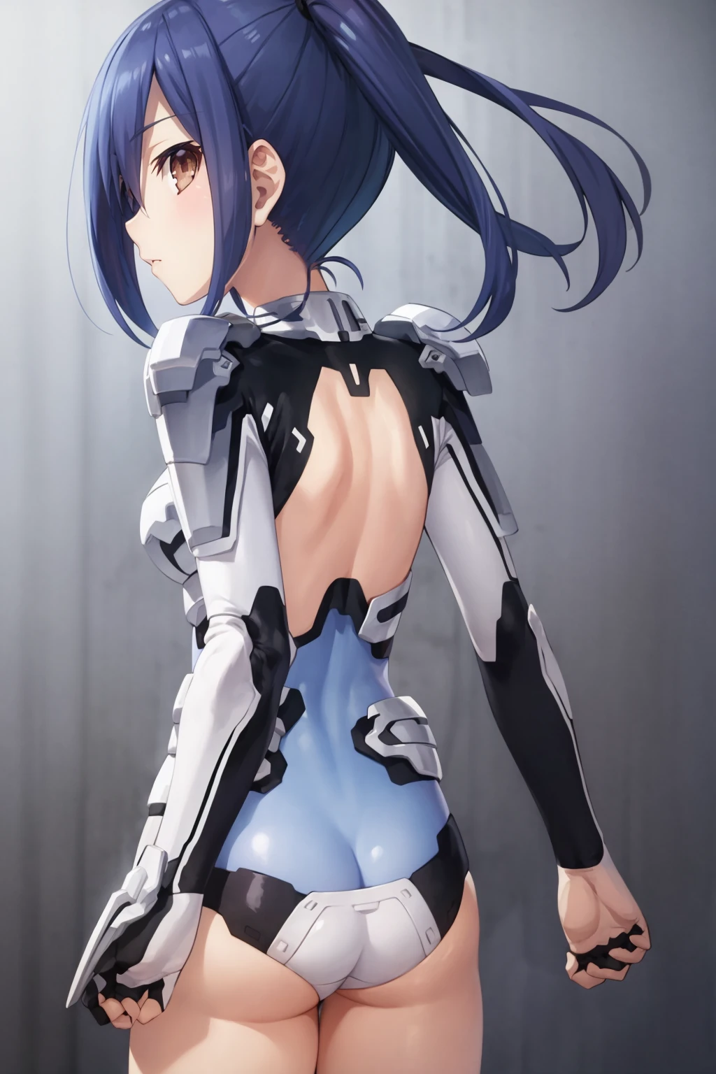 Basic prompts : 1girl, blue hair, bangs, ponytail, hair between eyes, brown eyes, mole