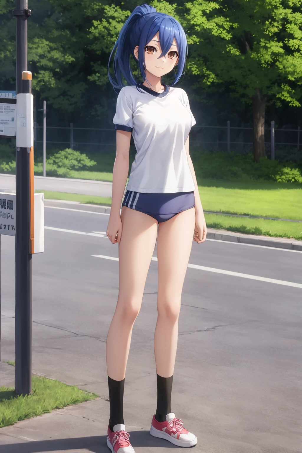 Gym outfit prompts : gym uniform, white shirt, black buruma, black socks, red shoes