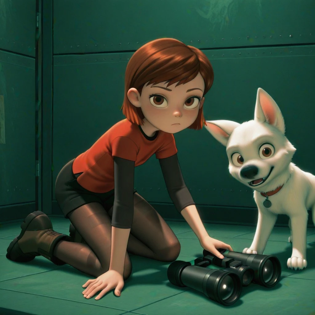 (penny_bo, 1girl, brown hair, short hair, brown eyes. red shirt, shorts, pantyhose), break, (bolt_bo, dog)