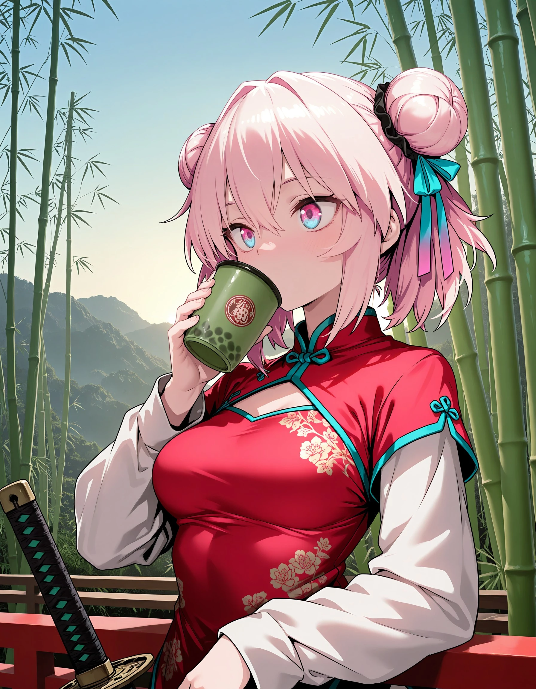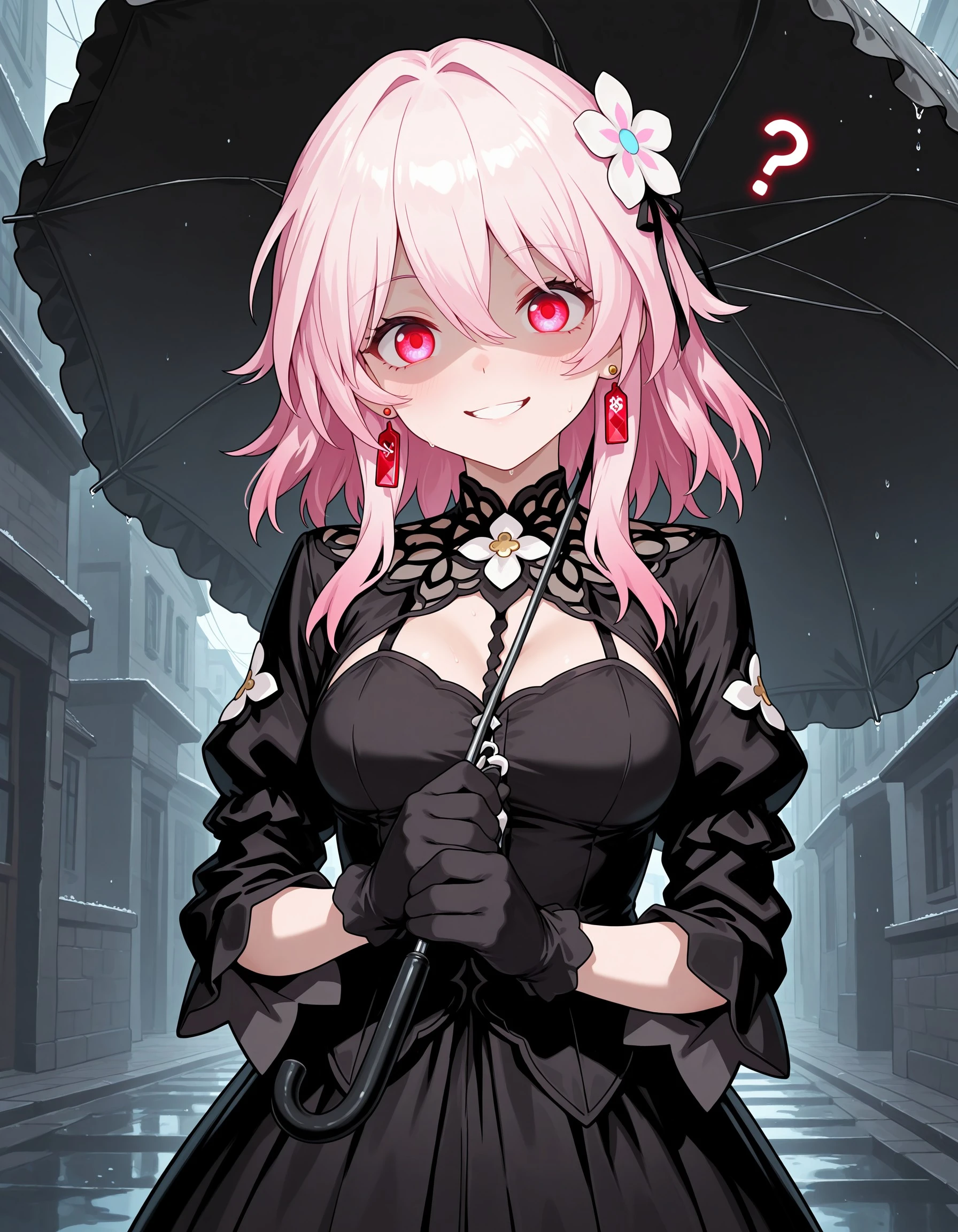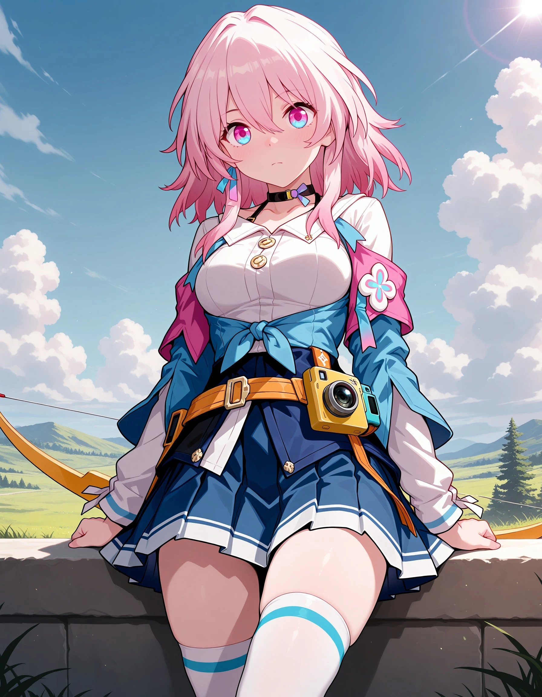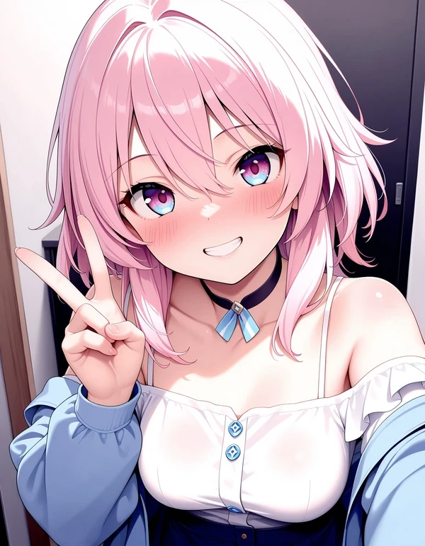 m7th, pink hair, medium hair, medium breasts, pink eyes, blue eyes