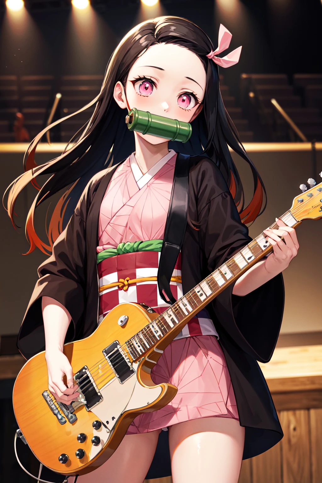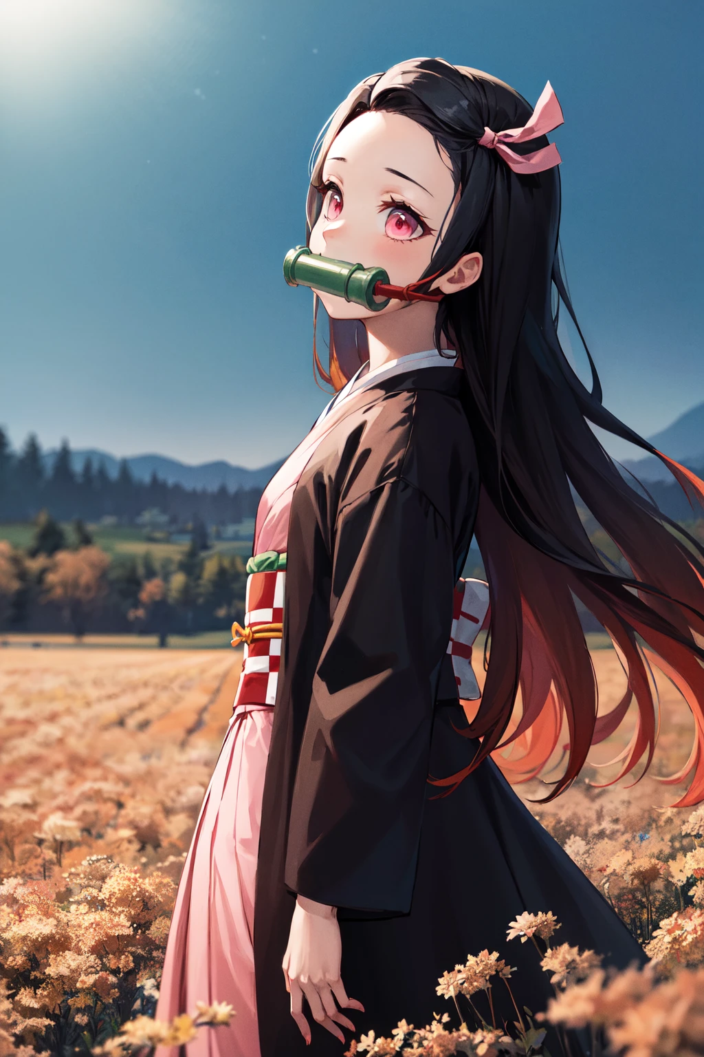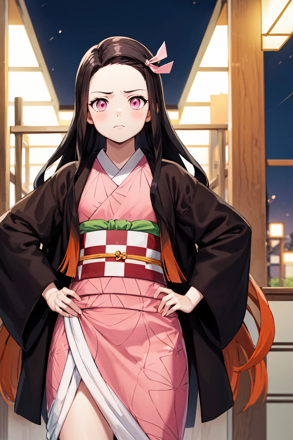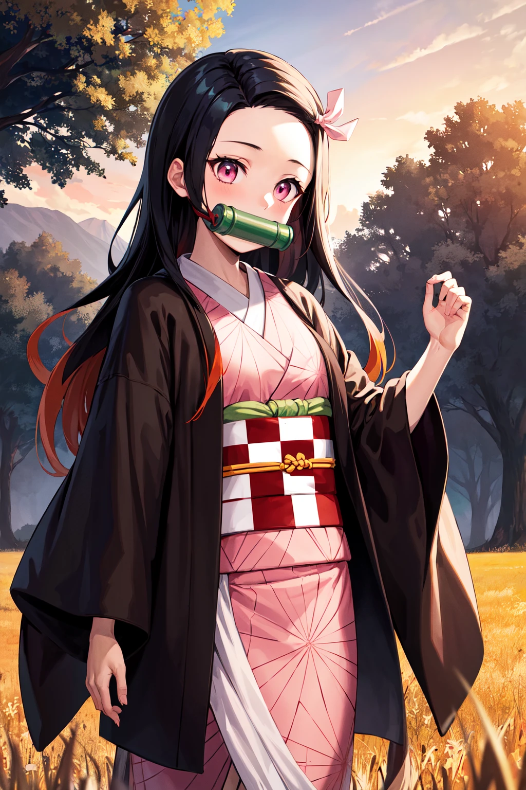 outfit1aanezuko, long hair, multicolored hair, hair ribbon, bit gag, mouth hold, japanese clothes, pink kimono, haori, black jacket, long sleeves, checkered sash, obi