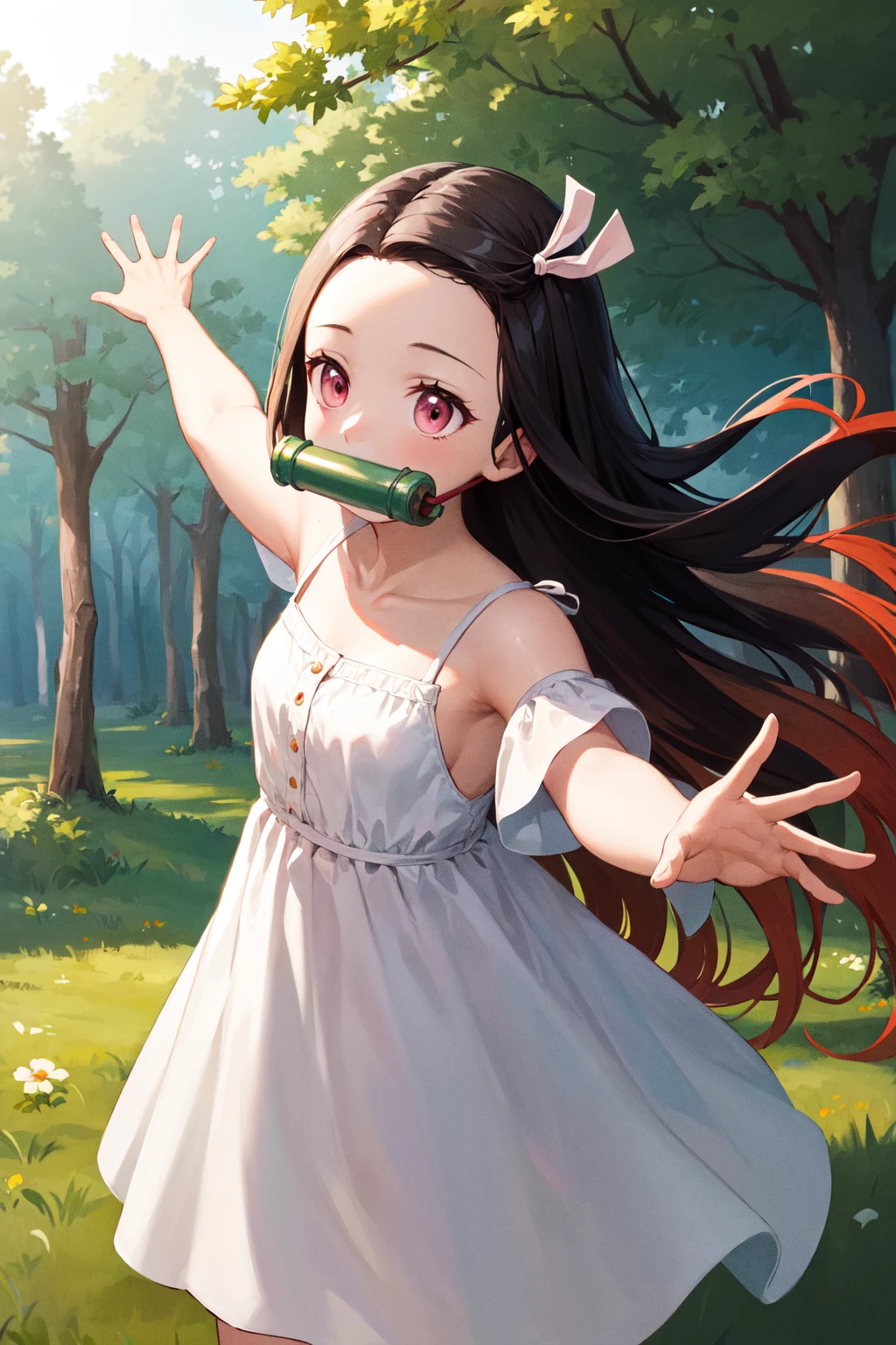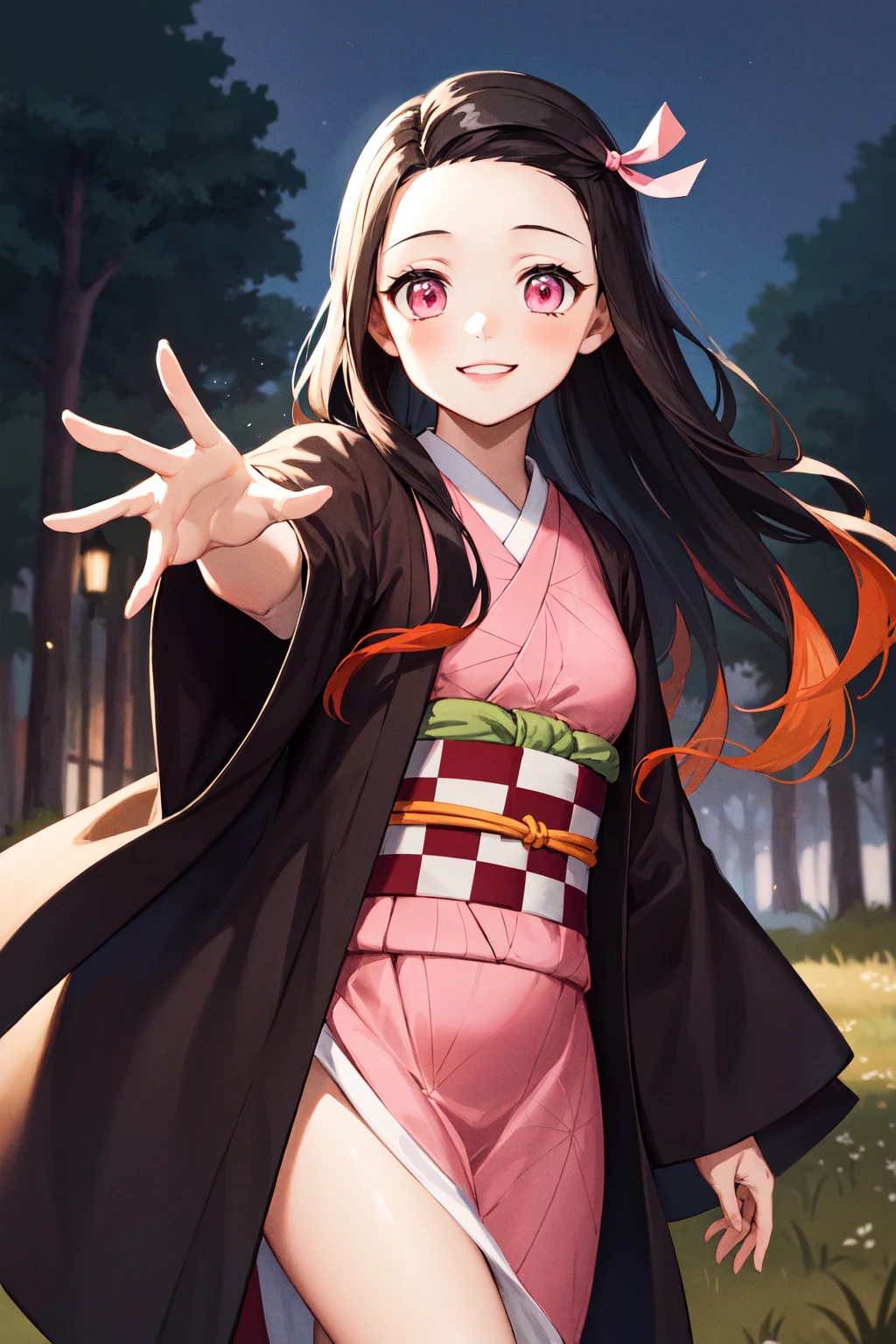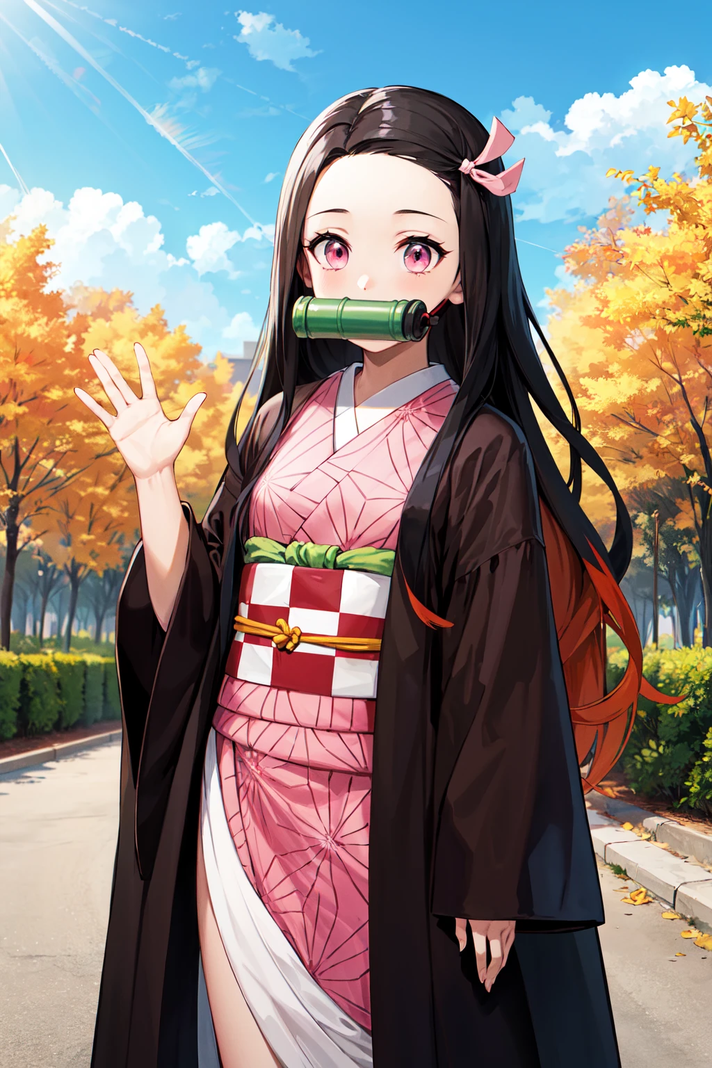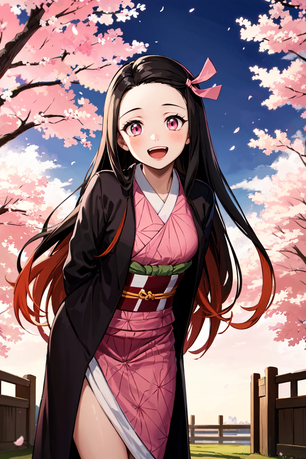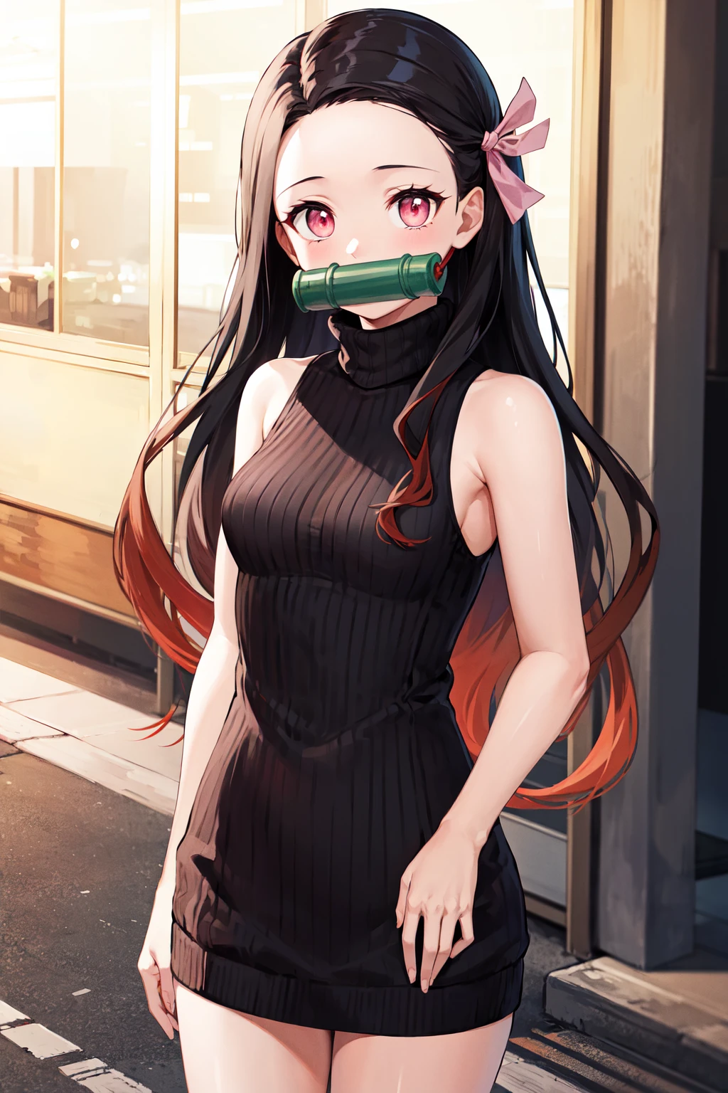 outfit1aanezuko, long hair, multicolored hair, hair ribbon, bit gag, mouth hold, japanese clothes, pink kimono, haori, black jacket, long sleeves, checkered sash, obi