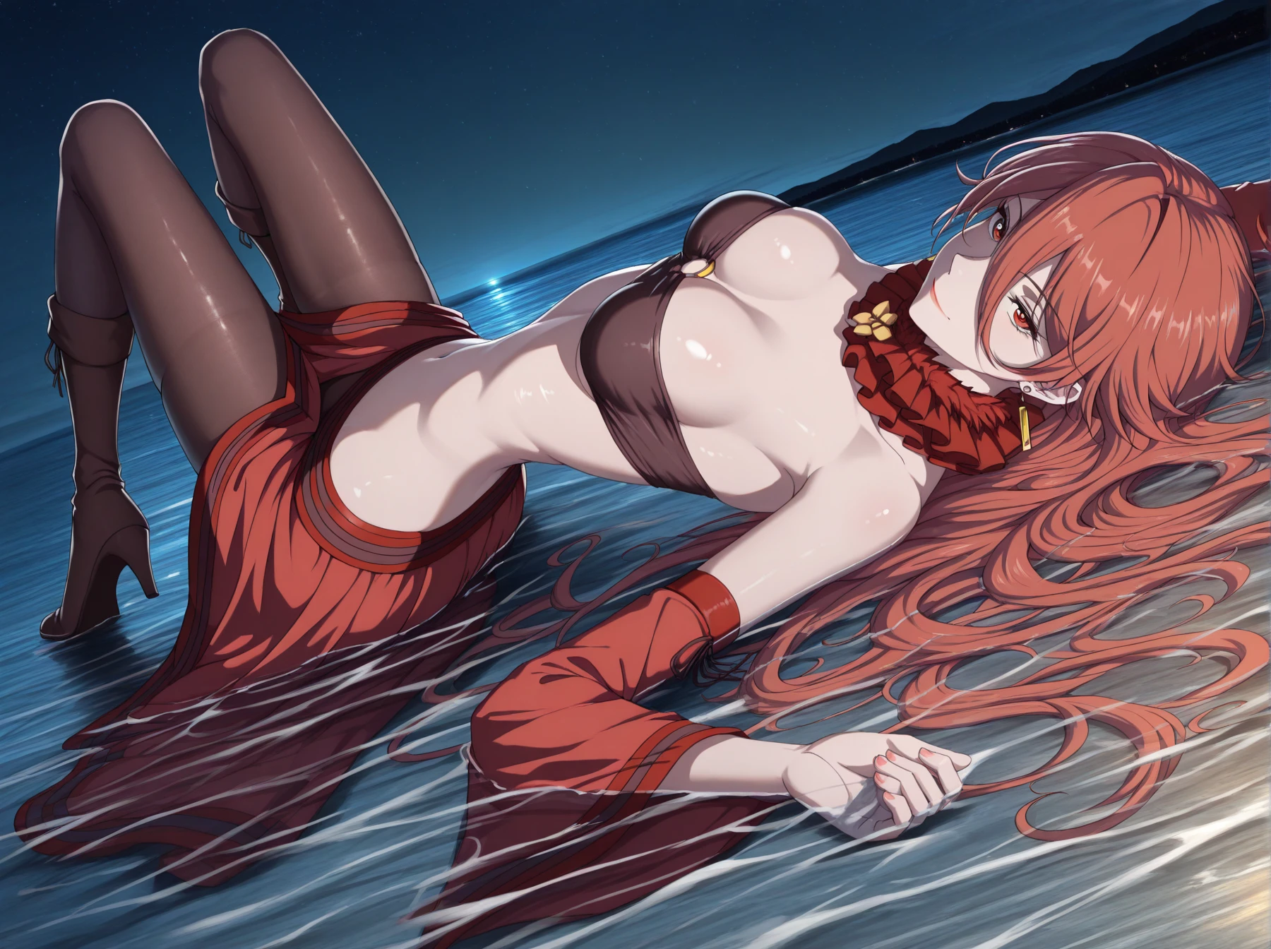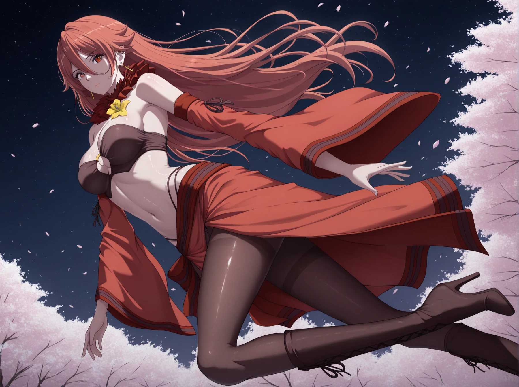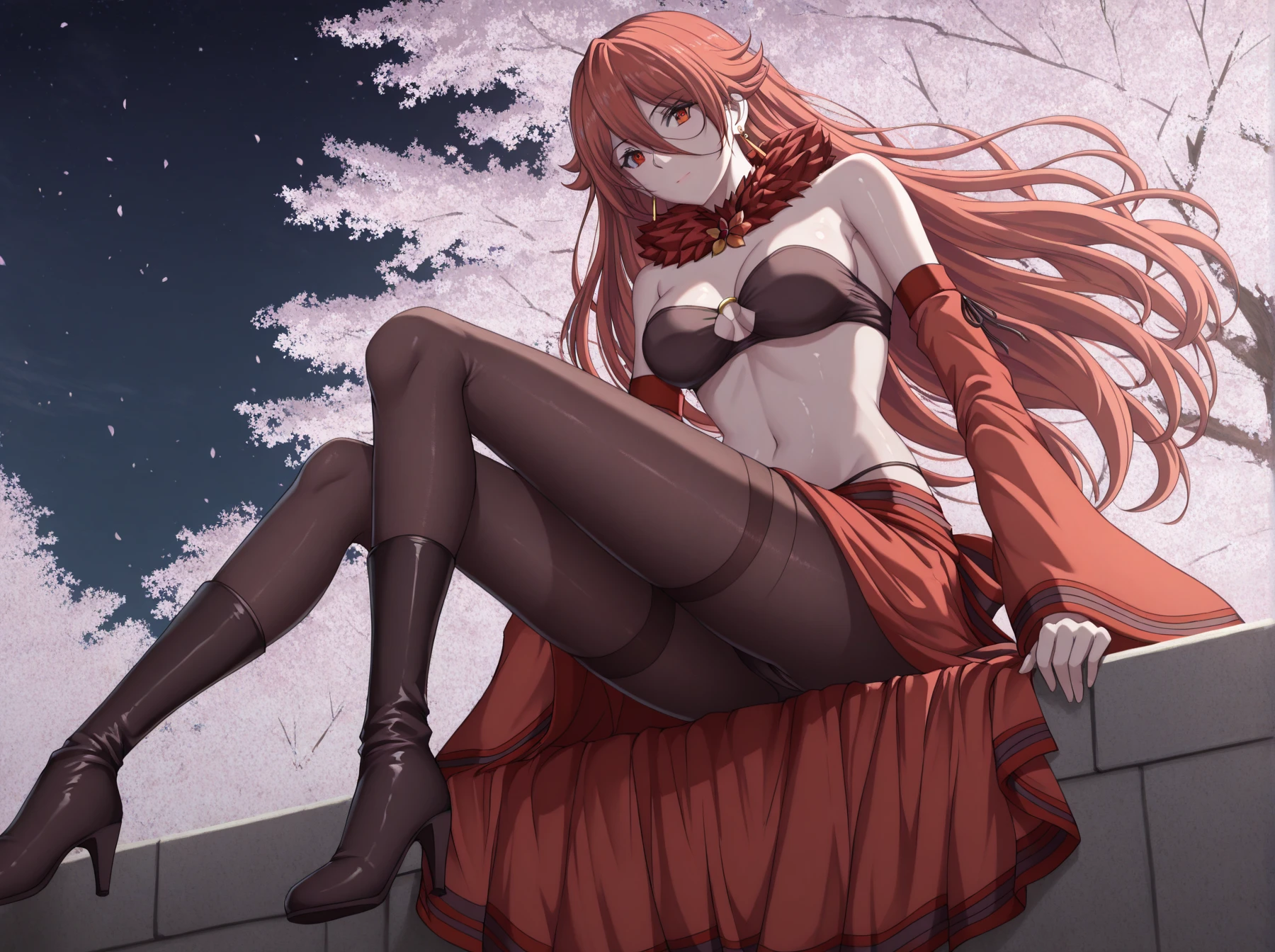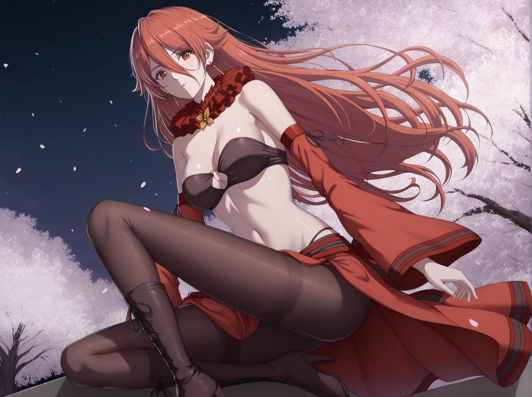 Clothes: (neck ruff, tube top, sleeveless bikini top, cleavage cutout, bare shoulders, detached sleeves, skirt, black pantyhose, thighhigh boots, high heel boots)