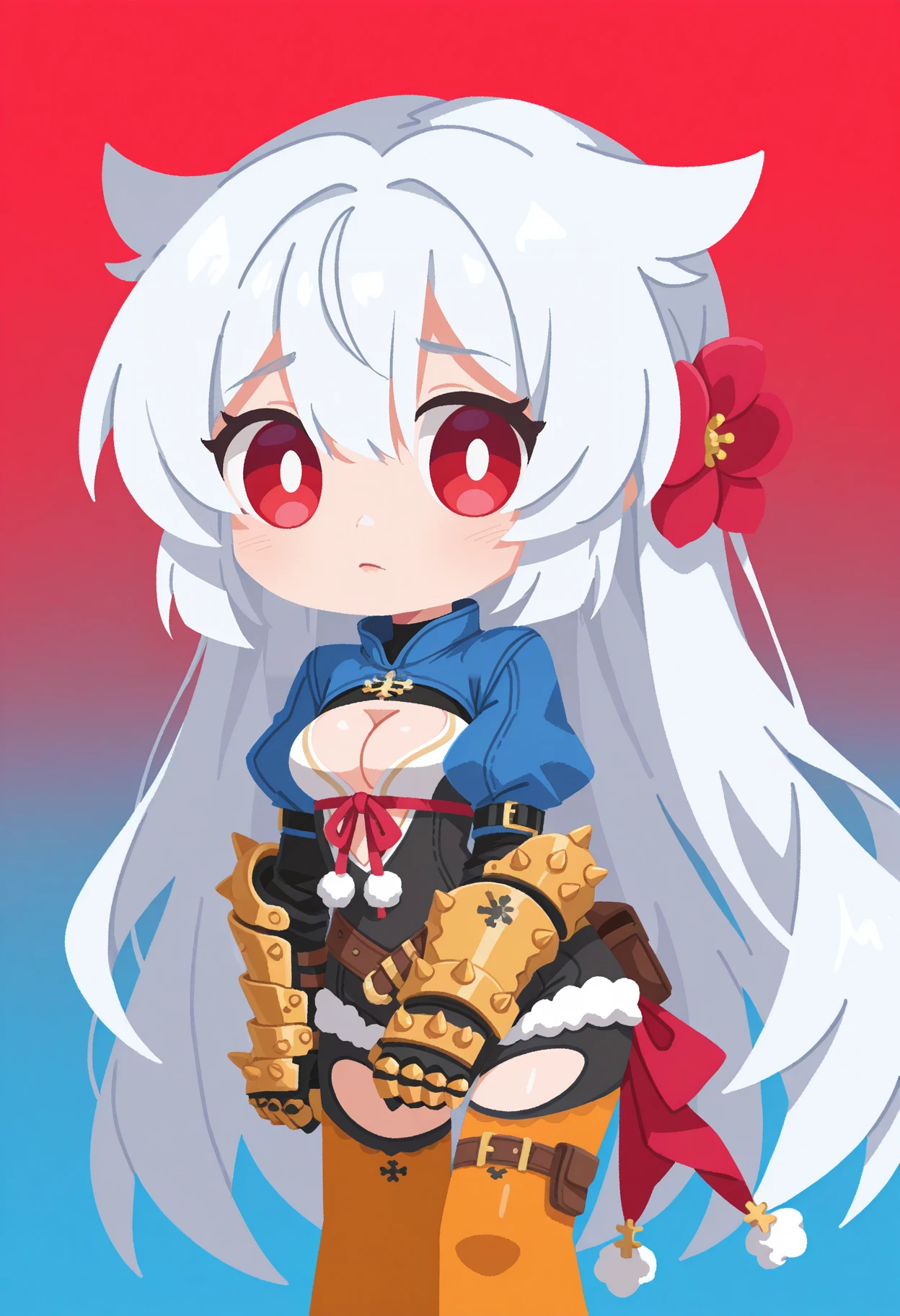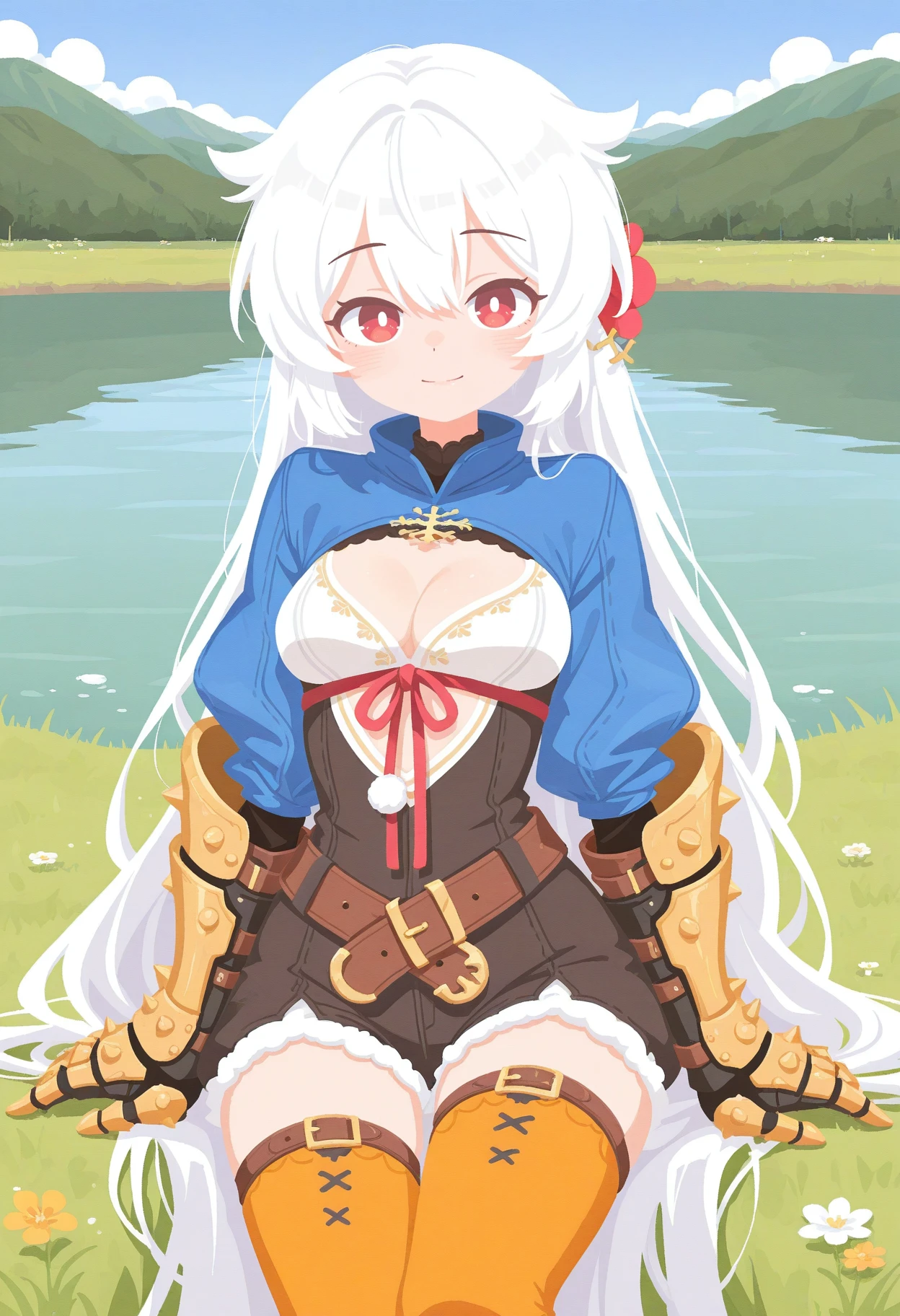 fvyvka, solo, 1girl, red eyes, white hair, very long hair, hair between eyes, hair flaps, hair ornament, flower, cleavage cutout,