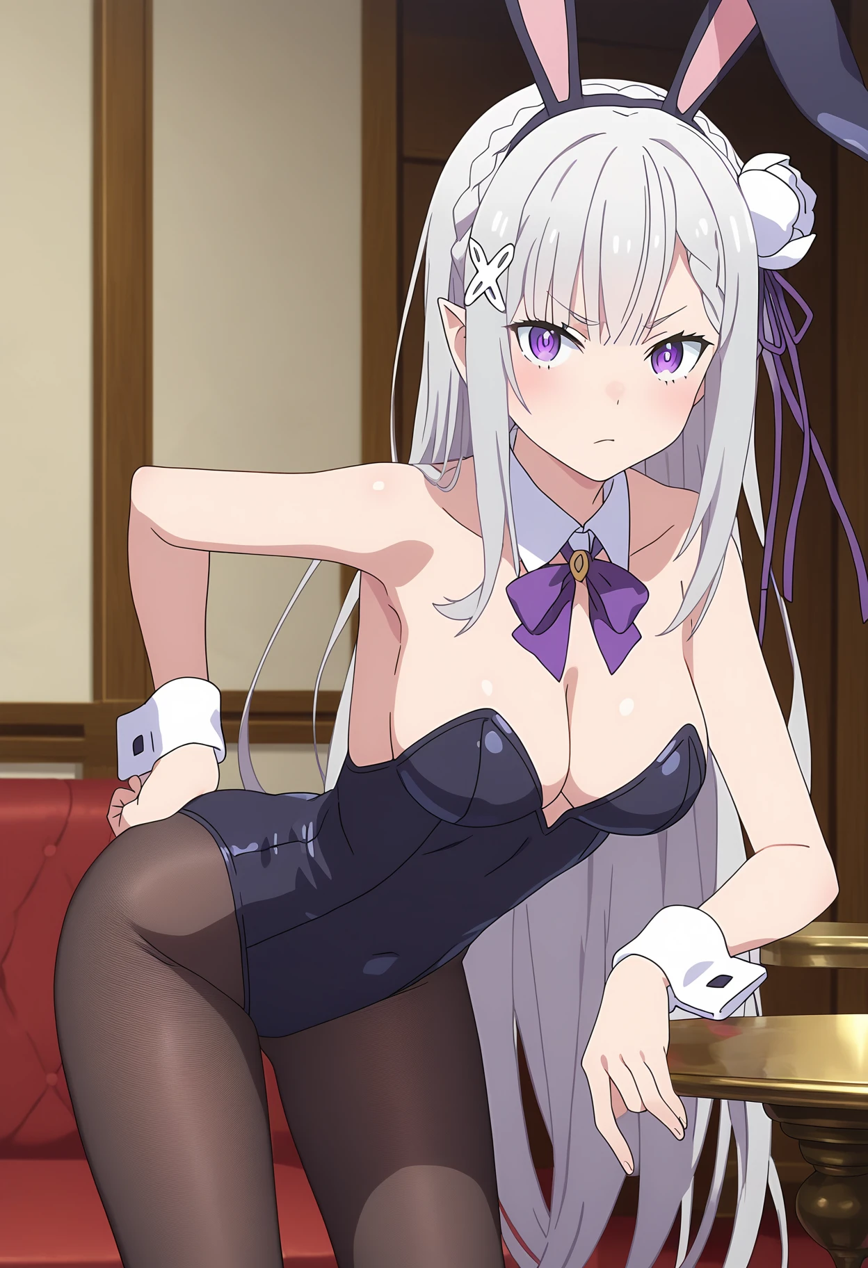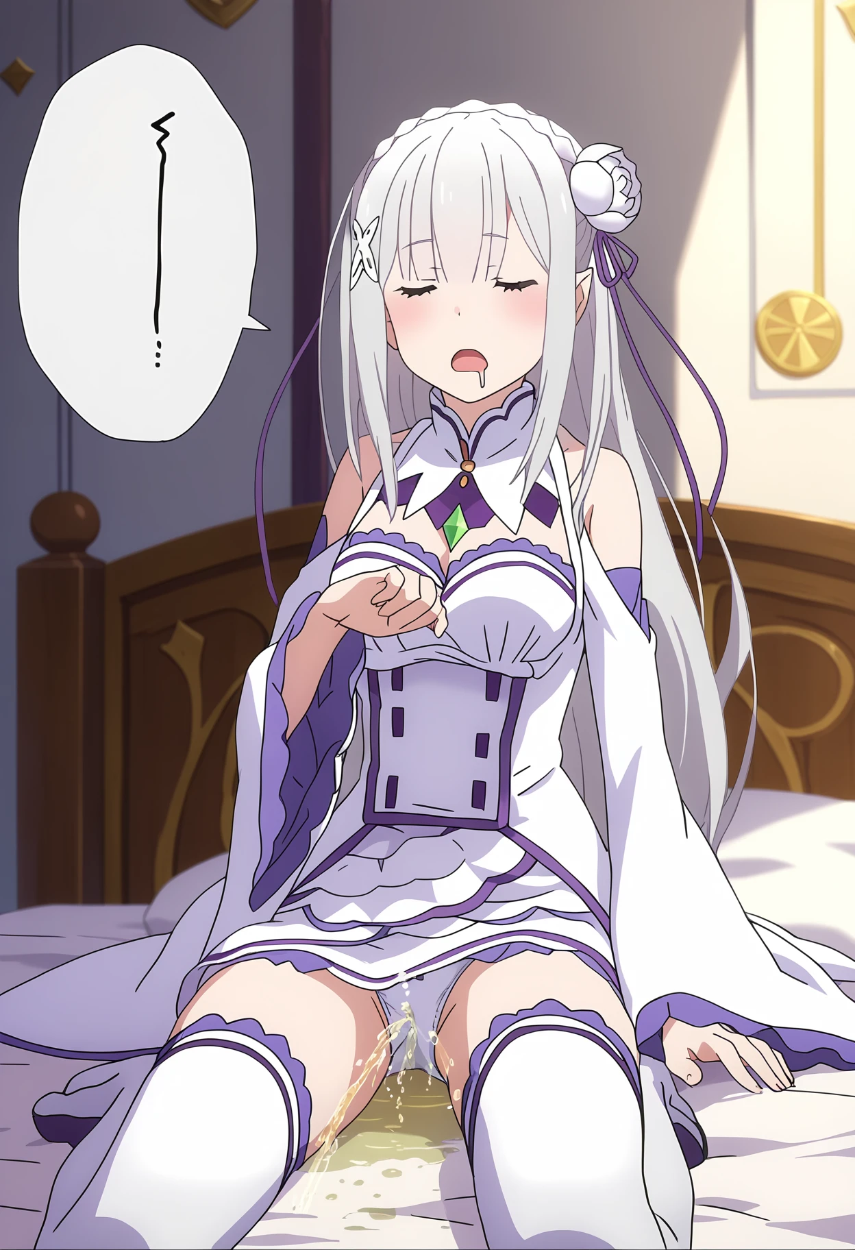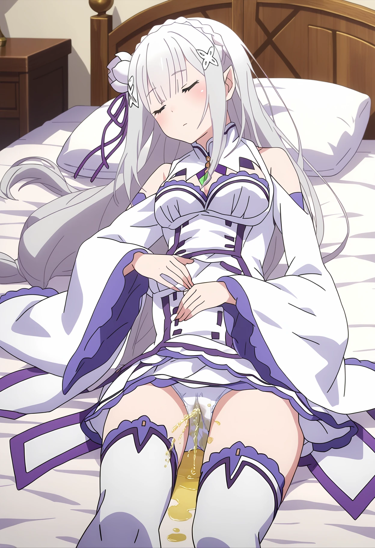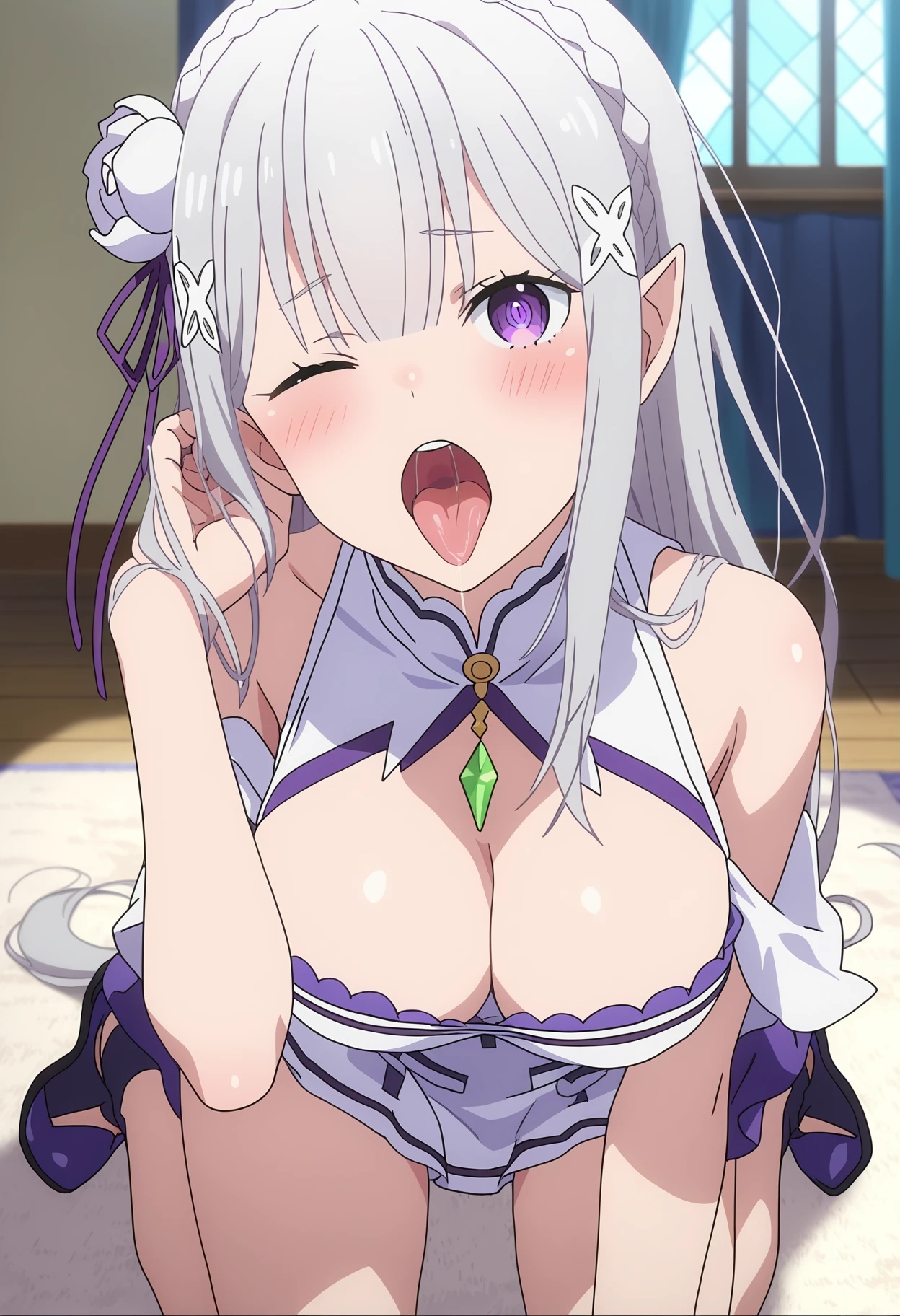 shimilia, long hair, grey hair, purple eyes, pointy ears, crown braid, hair flower, hair ribbon, purple ribbon, x hair ornament, white dress, cleavage, bare shoulders, wide sleeves, white thighhighs, thigh boots,wide sleeves, long sleeves, detached sleeves (may vary)