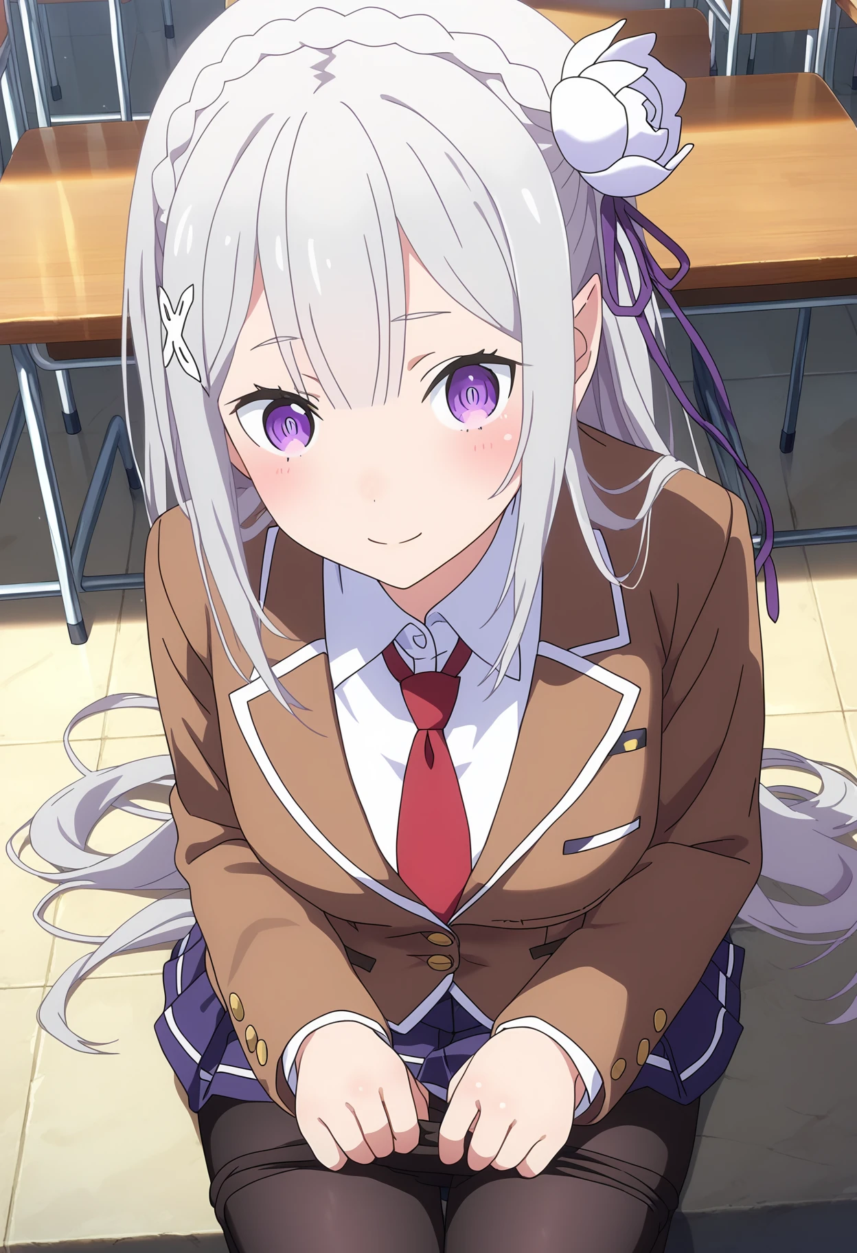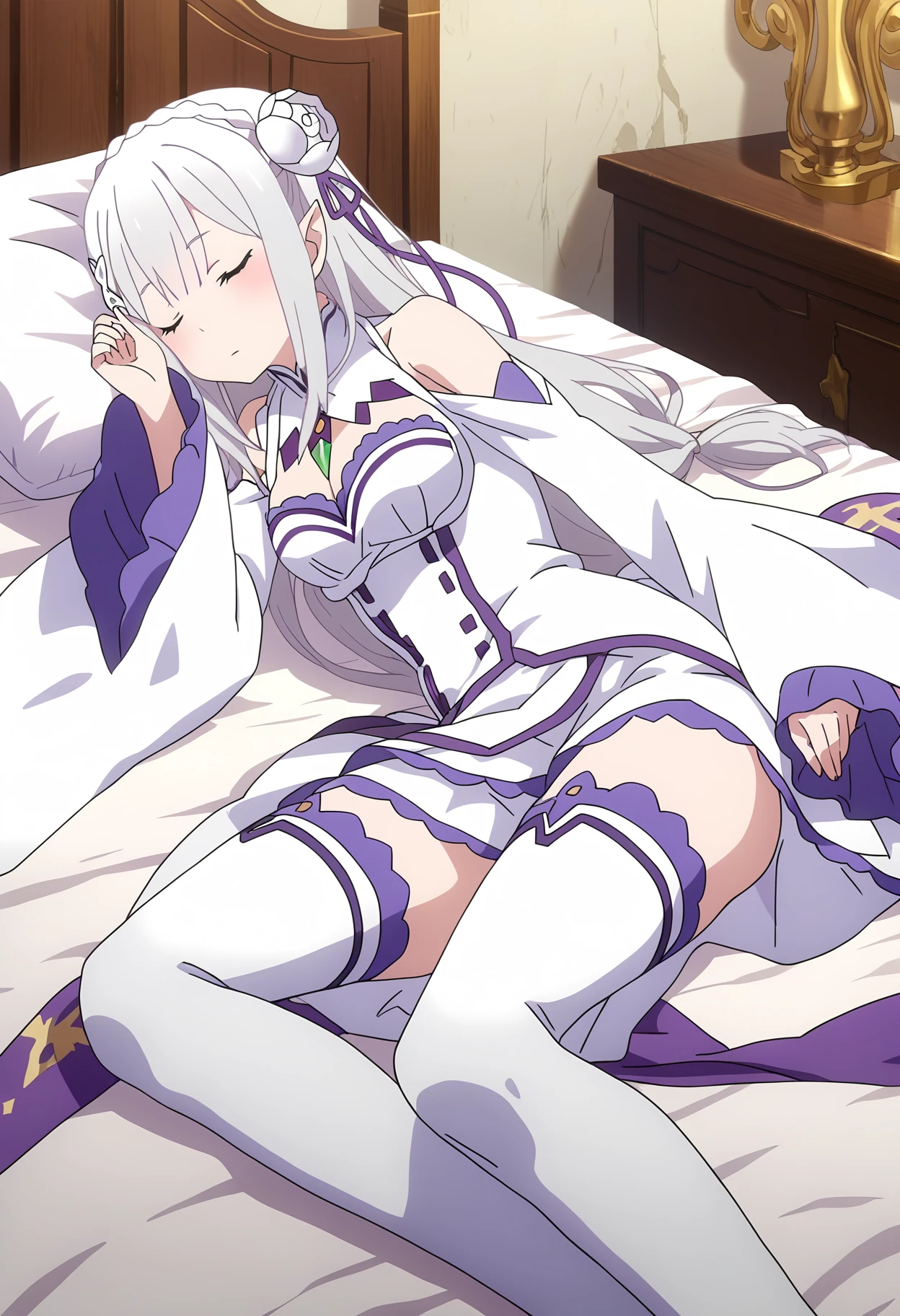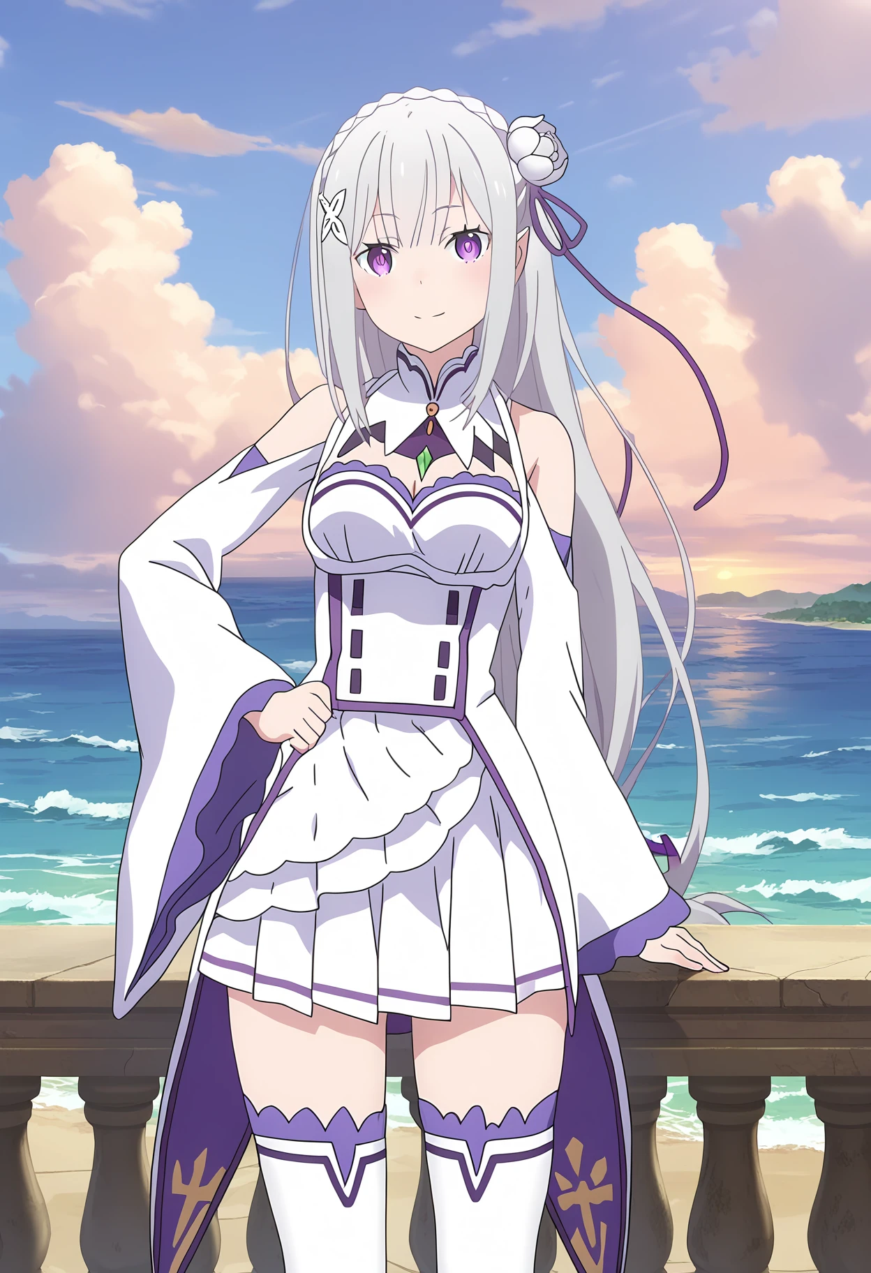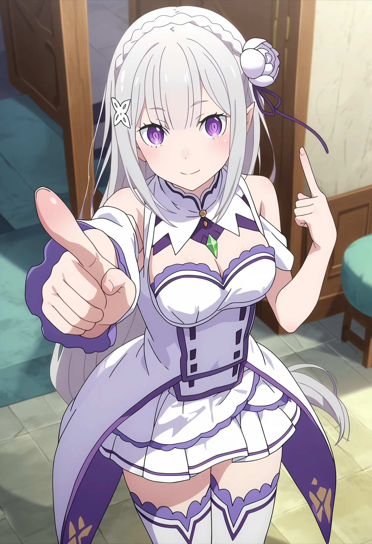 shimilia, long hair, grey hair, purple eyes, pointy ears, crown braid, braid, hair flower, white flower, hair ribbon, purple ribbon, x hair ornament, white dress, cleavage, bare shoulders, wide sleeves, white thighhighs, thigh boots,V1