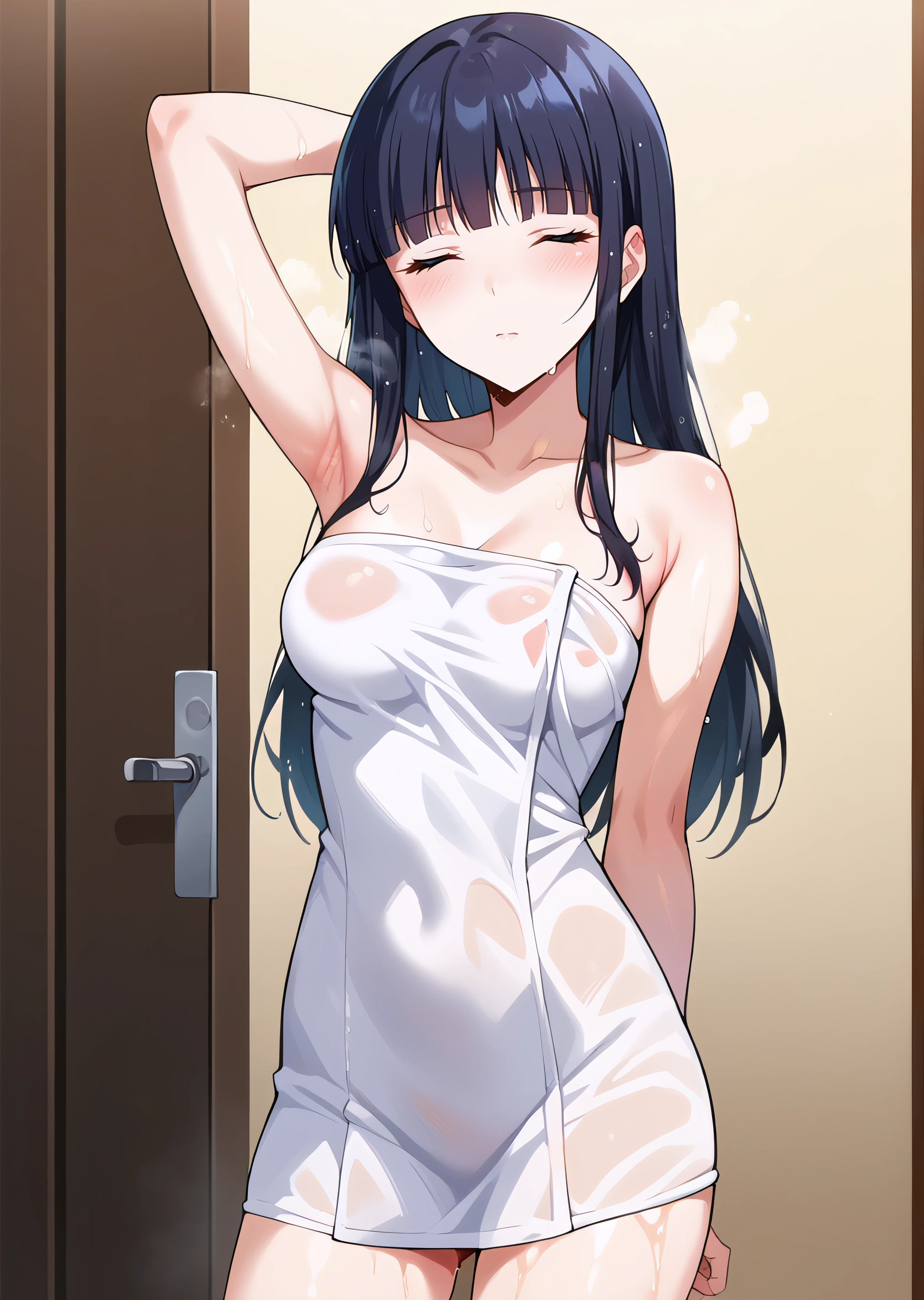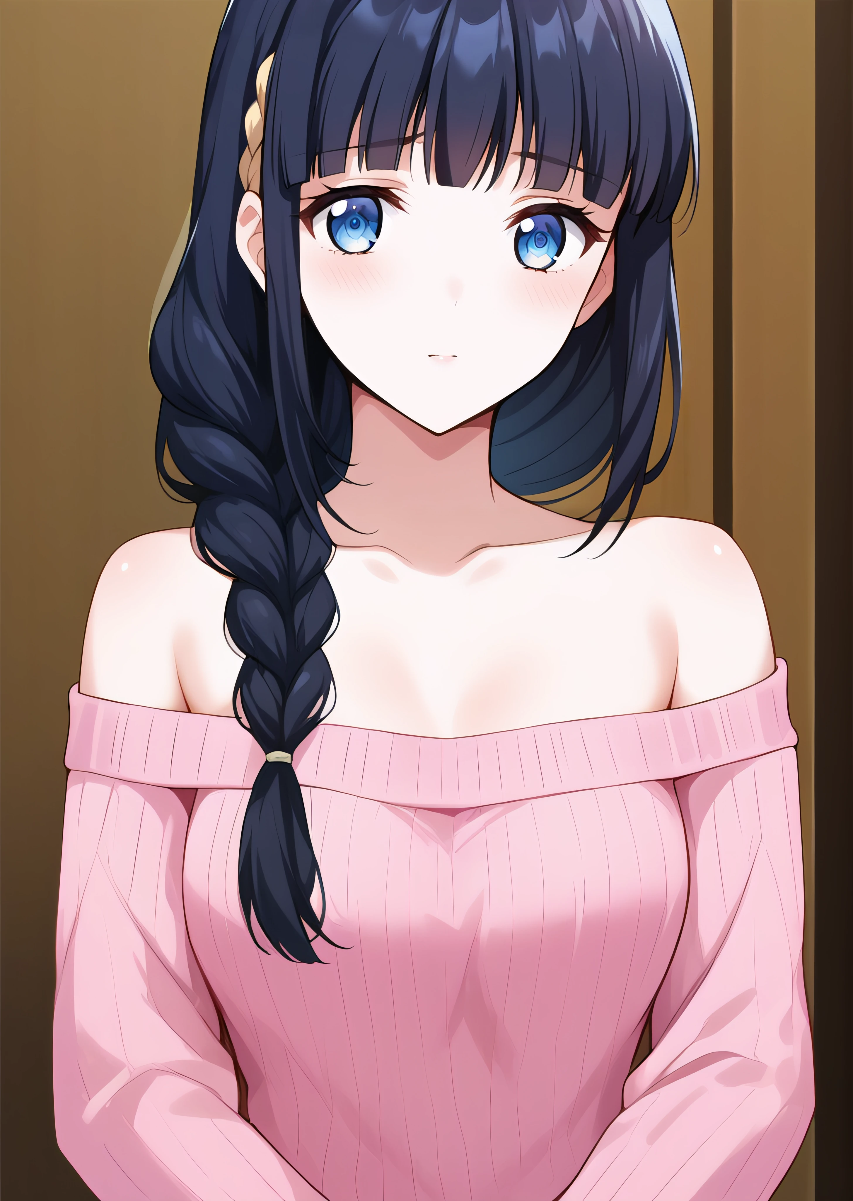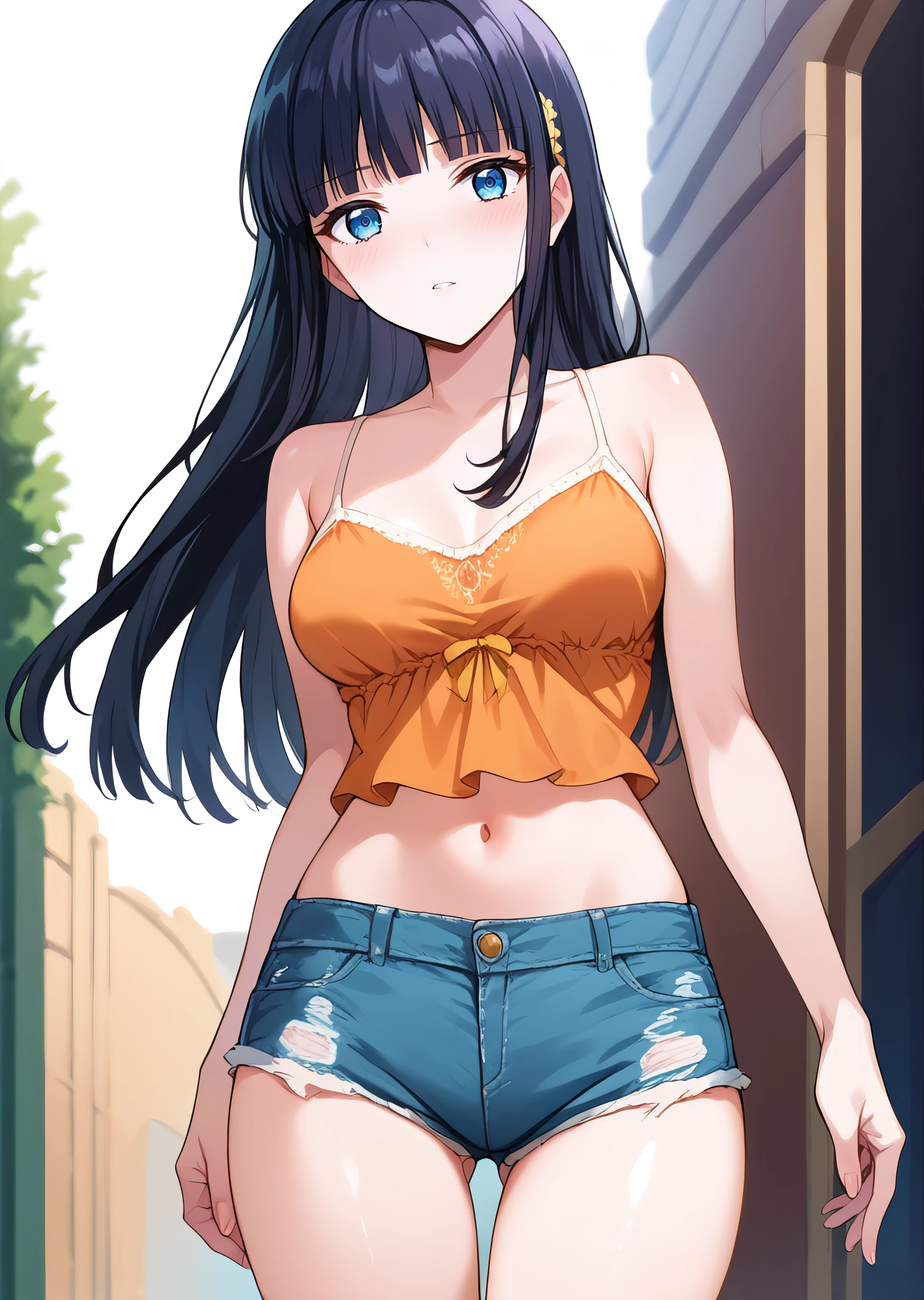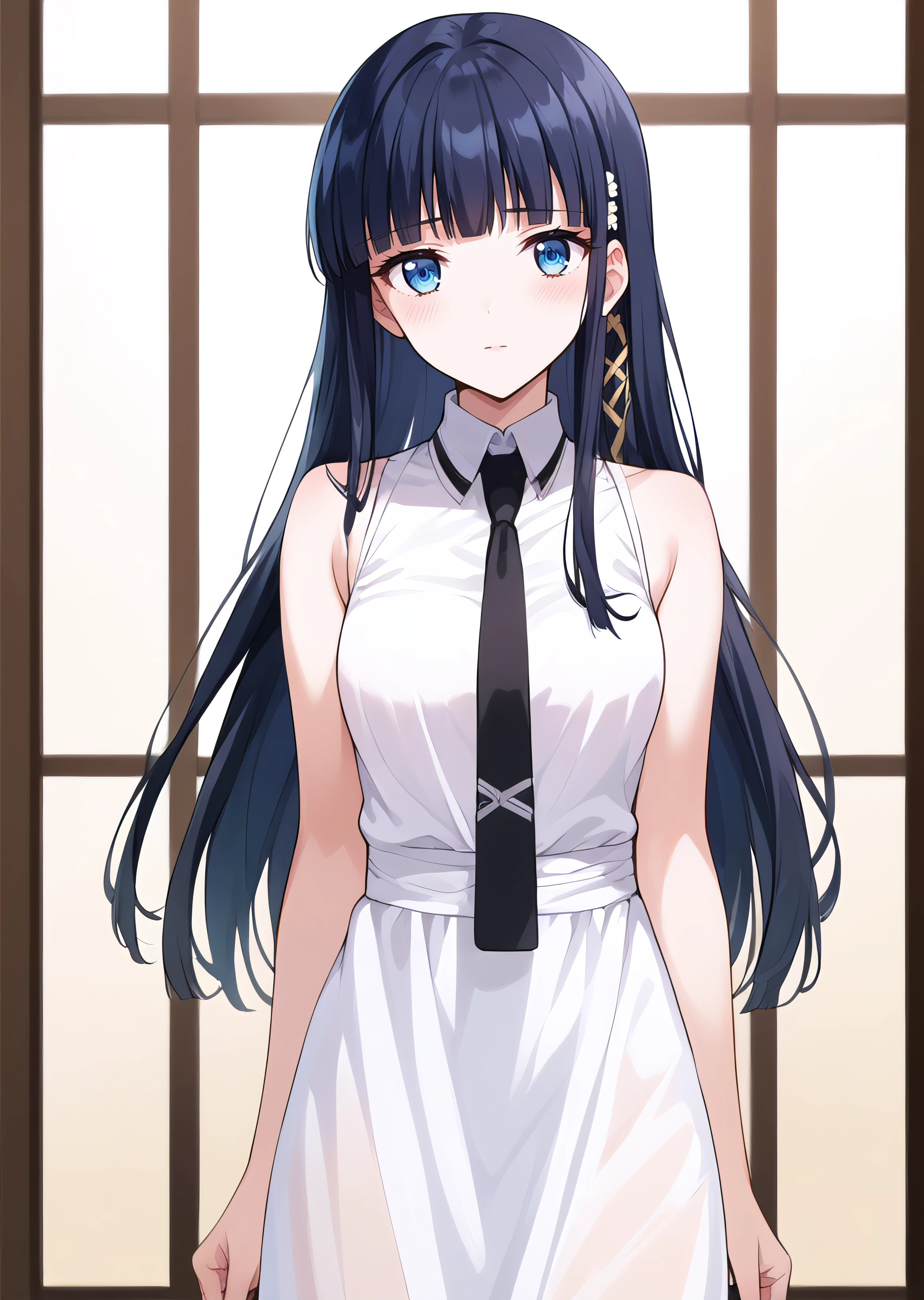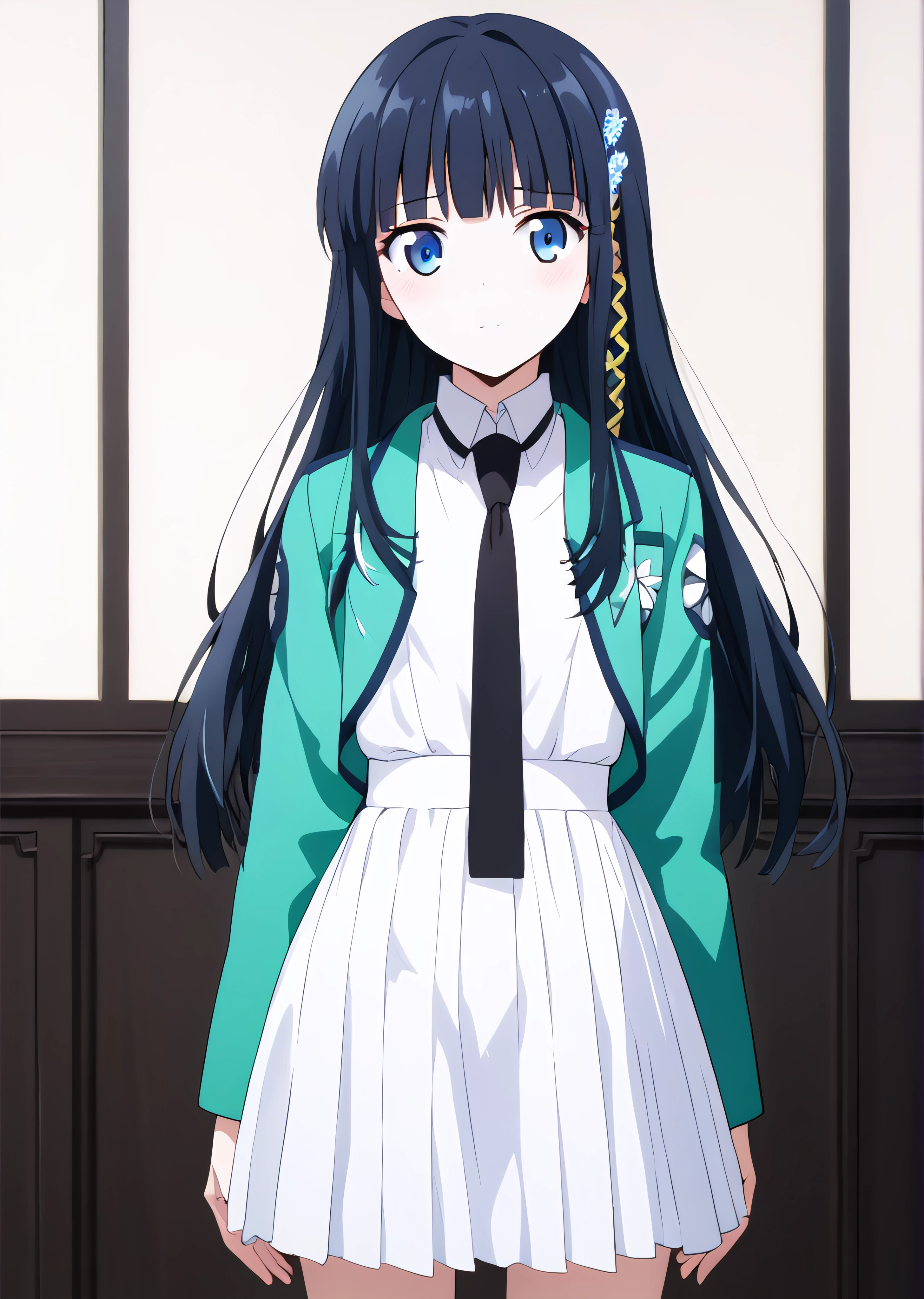 shiba miyuki, black hair,long hair, blunt bangs, eyebrows visible through hair, blue eyes, snowflake hair ornament, yellow x hair ornament