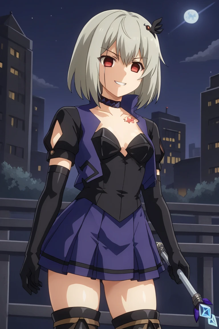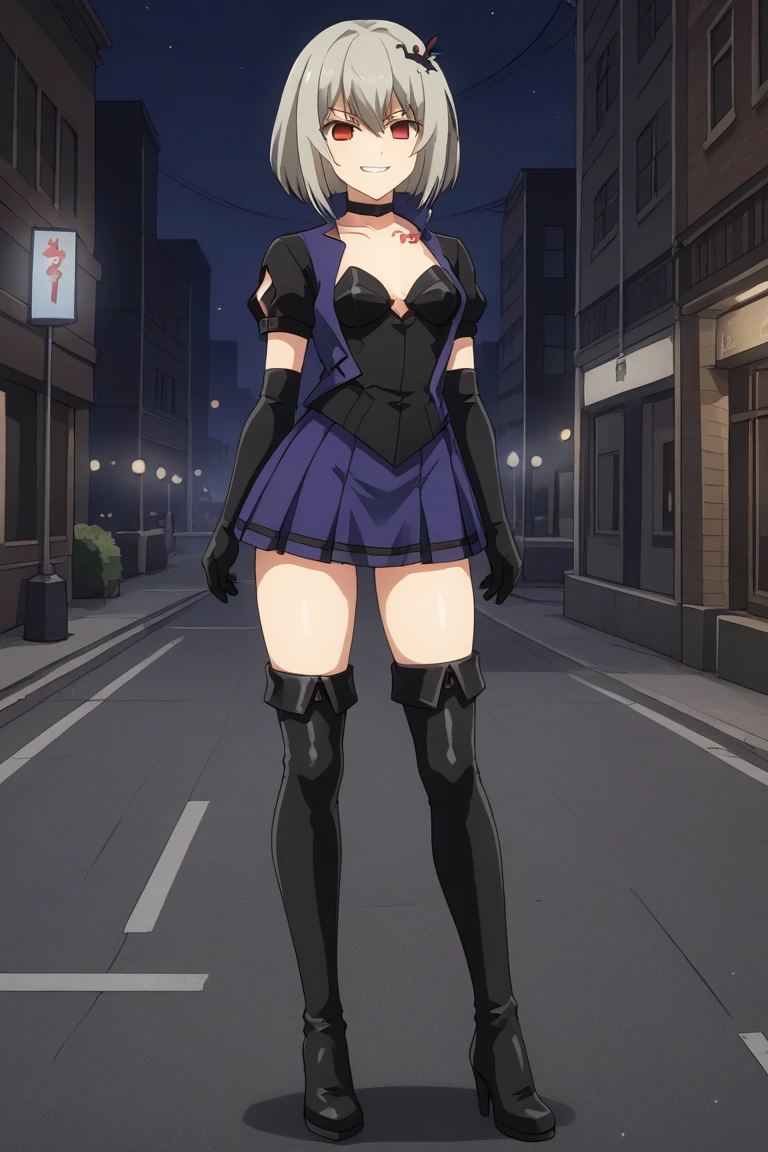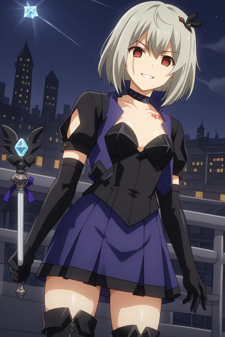 keywords: magical girl, grey hair, short hair, red eyes, hair ornament, choker, shirt, covered navel, black sleeves, puffy short sleeves, purple vest, black elbow gloves, purple skirt, black thigh boots, high heel boots